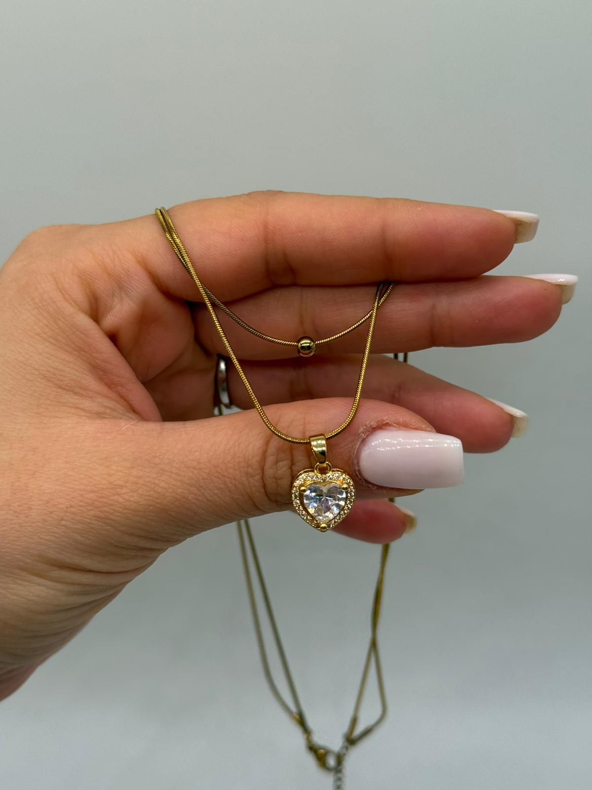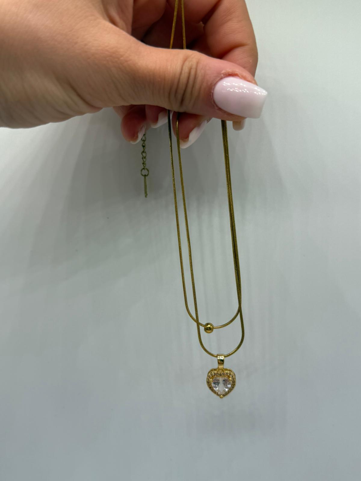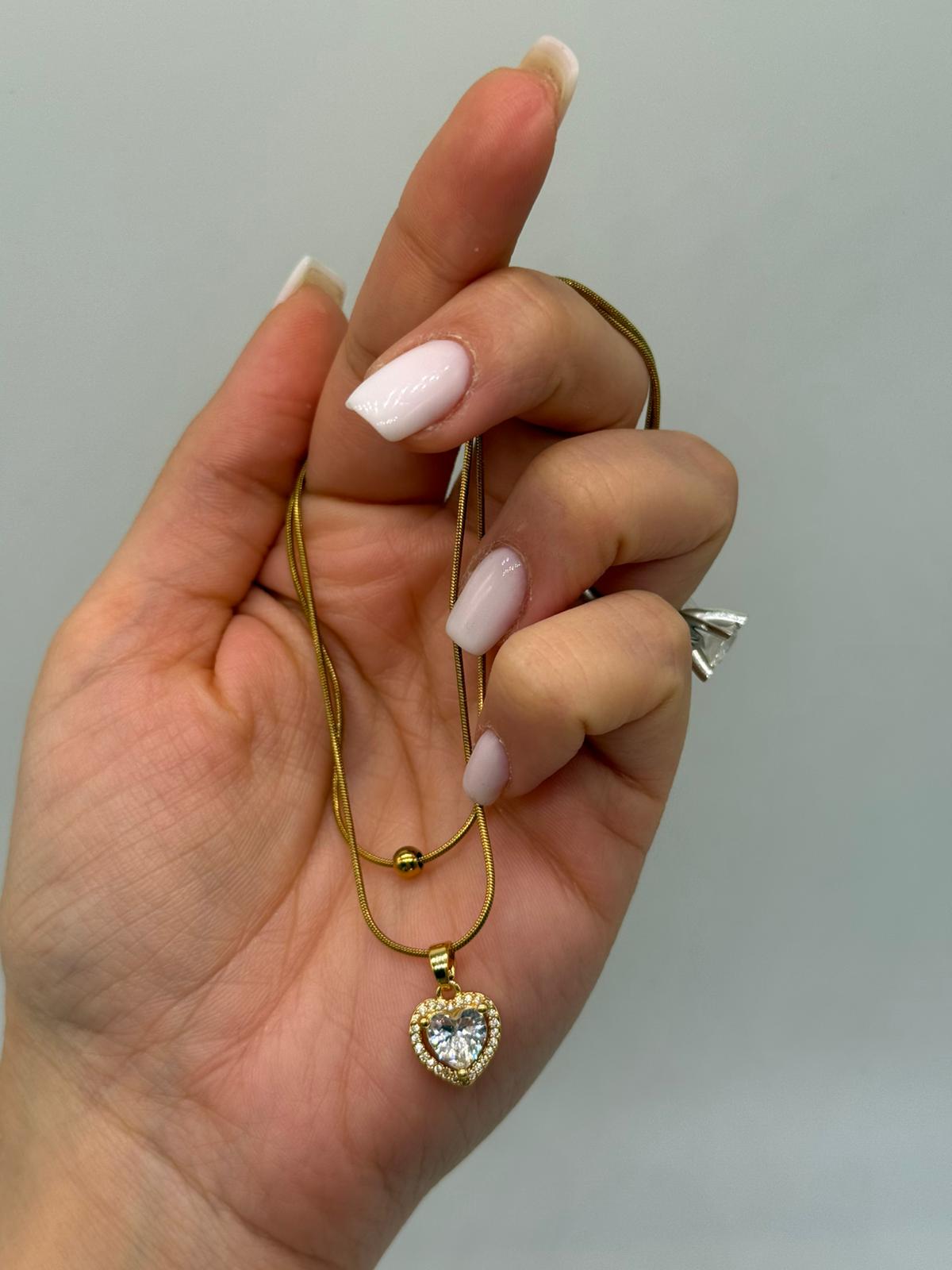 Altın renk kaplamalı bu şık kolye, kalp formundaki merkez taşı ve etrafını saran ışıltılı taş çerçevesiyle zarif ve romantik bir görünüm sunar. İnce işçiliği sayesinde sade ama dikkat çekici bir tasarıma sahiptir.