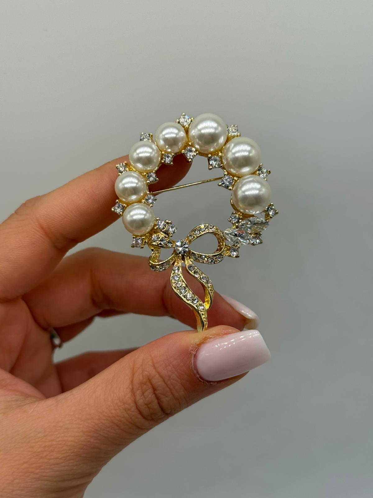 Klasik zarafetten ilham alan çelenk formu ve çevresini saran inci detaylarıyla tasarlanan bu özel broş, şıklığı ve feminen duruşu bir arada sunar. Altın tonlu gövde üzerine yerleştirilen inci ve zirkon taşlar, tasarıma dengeli bir ışıltı ve sofistike bir görünüm kazandırır. Alt kısmındaki fiyonk detayı broşa zarif ve romantik bir karakter katar.