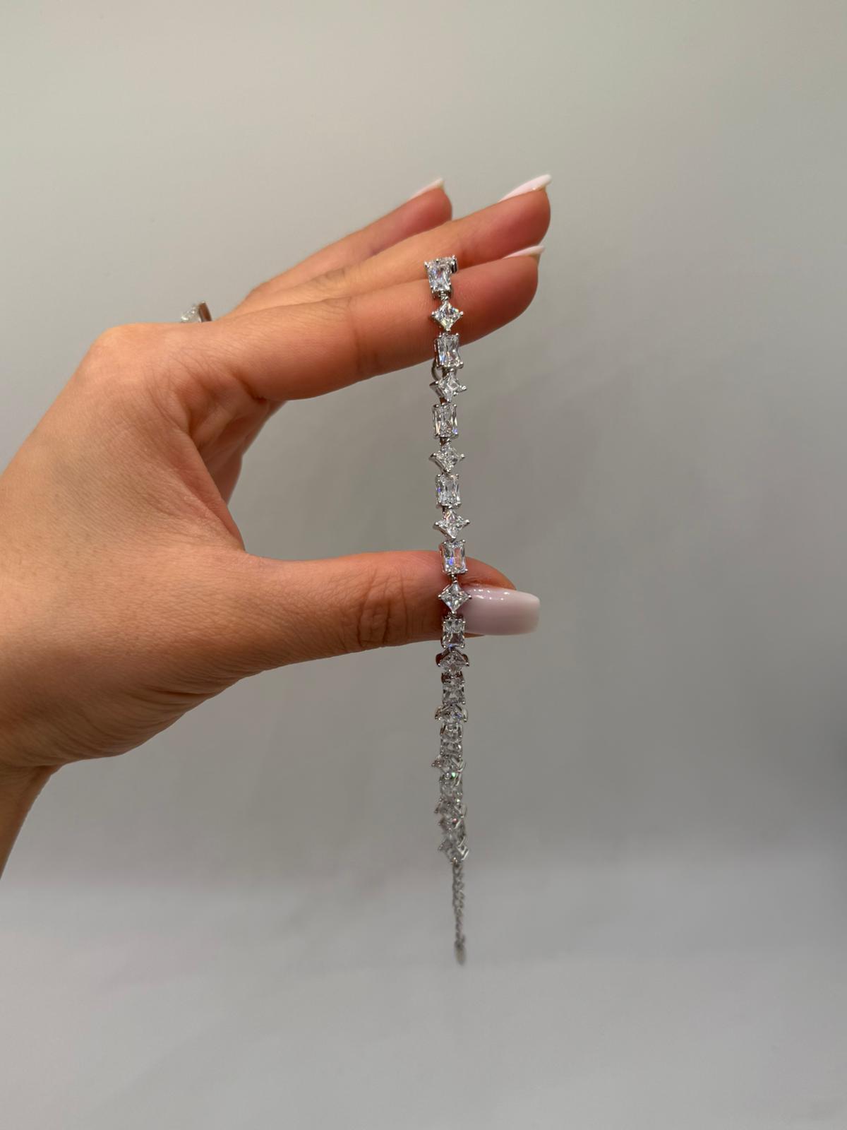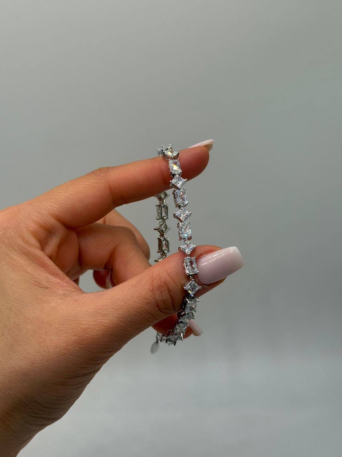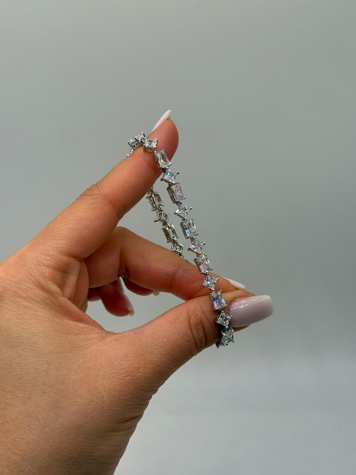 Baget kesim zirkon taşların modern ve keskin ışıltısıyla tasarlanan bu kadın bileklik, sofistike ve göz alıcı bir stil sunar. Taşların sıralı dizilimi, bilekte güçlü bir parlaklık oluştururken zarif duruşunu korur.