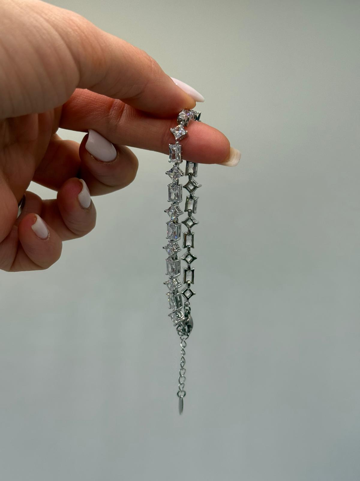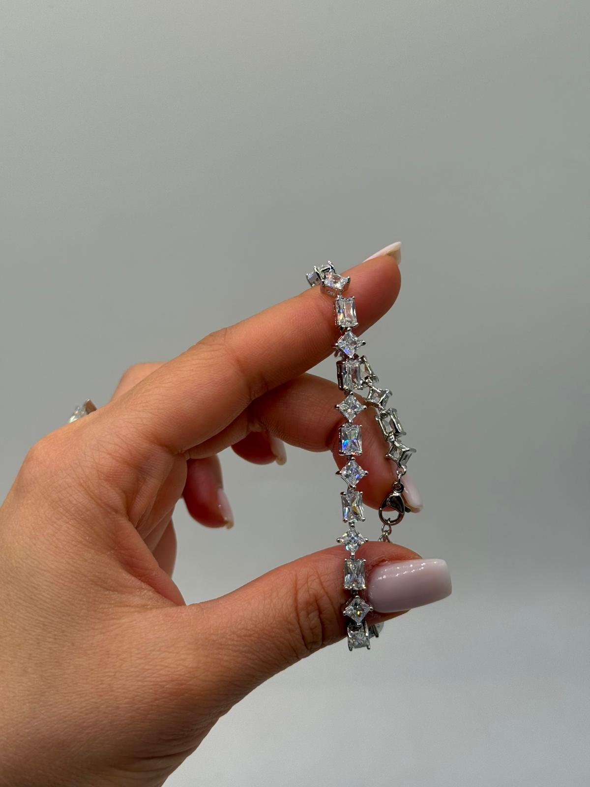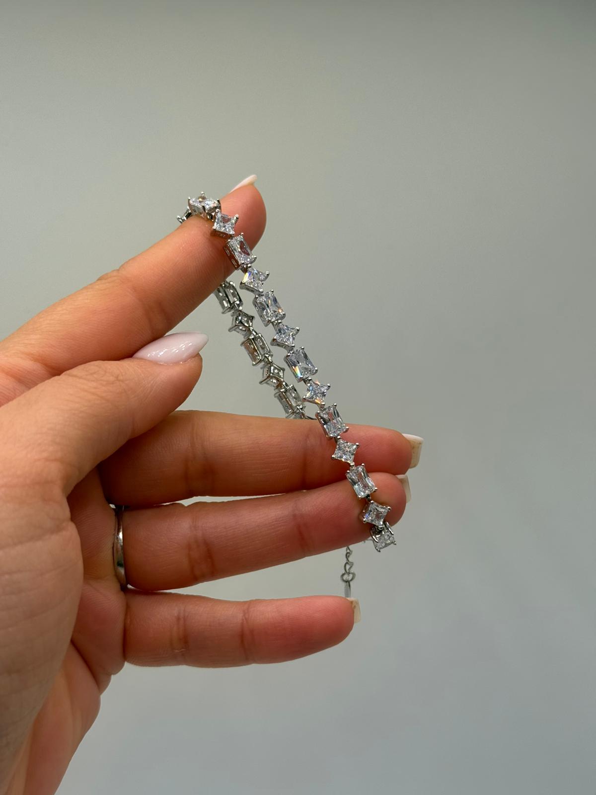 Baget kesim zirkon taşların modern ve keskin ışıltısıyla tasarlanan bu kadın bileklik, sofistike ve göz alıcı bir stil sunar. Taşların sıralı dizilimi, bilekte güçlü bir parlaklık oluştururken zarif duruşunu korur.