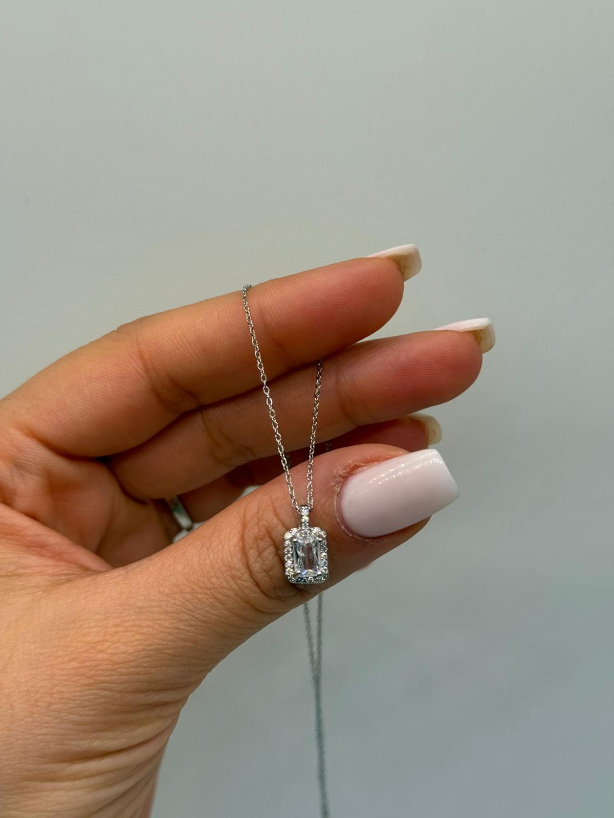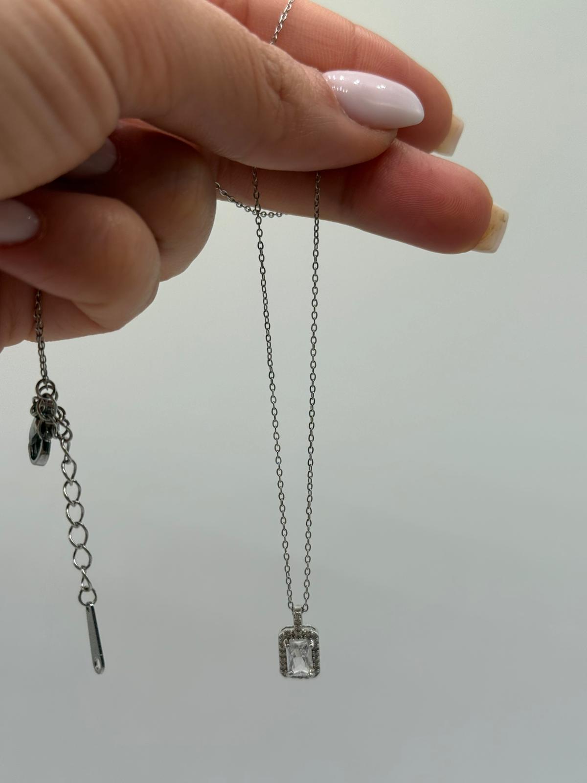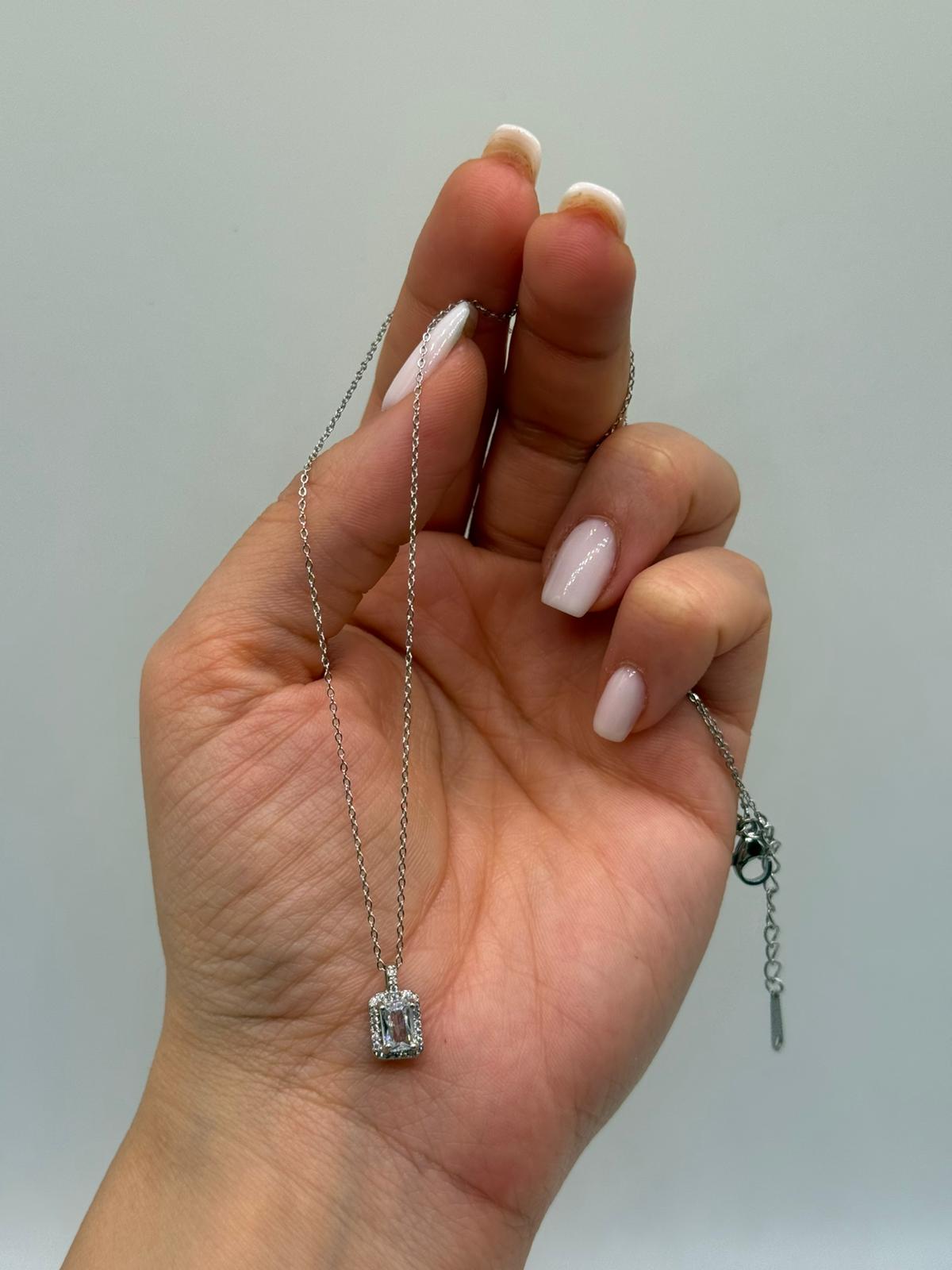 Ortada yer alan dikdörtgen kesim zirkon taş, çevresindeki ışıltılı detaylarla birlikte zarif bir görünüm sunar. Gümüş renk kaplaması sayesinde günlük kullanımda olduğu kadar özel davetlerde de rahatlıkla tercih edilebilir. Ayarlanabilir zinciri ile konforlu ve şık bir kullanım sağlar.
