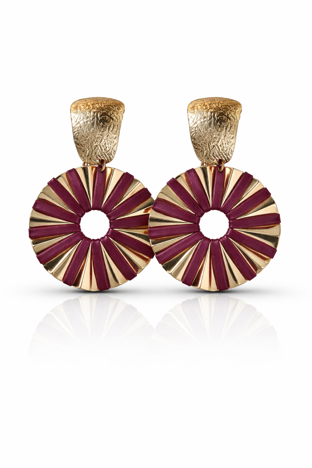 Fi Jewels koleksiyonunda yer alan bordo & gold detaylı yuvarlak form gösterişli kadın küpe, güçlü renk kontrastı ve dikkat çekici tasarımıyla stilin merkezinde yer alır.