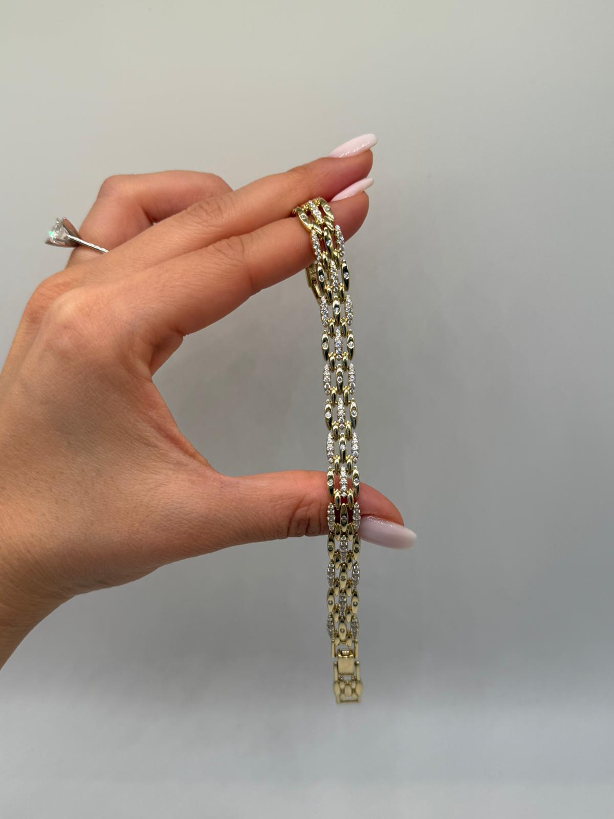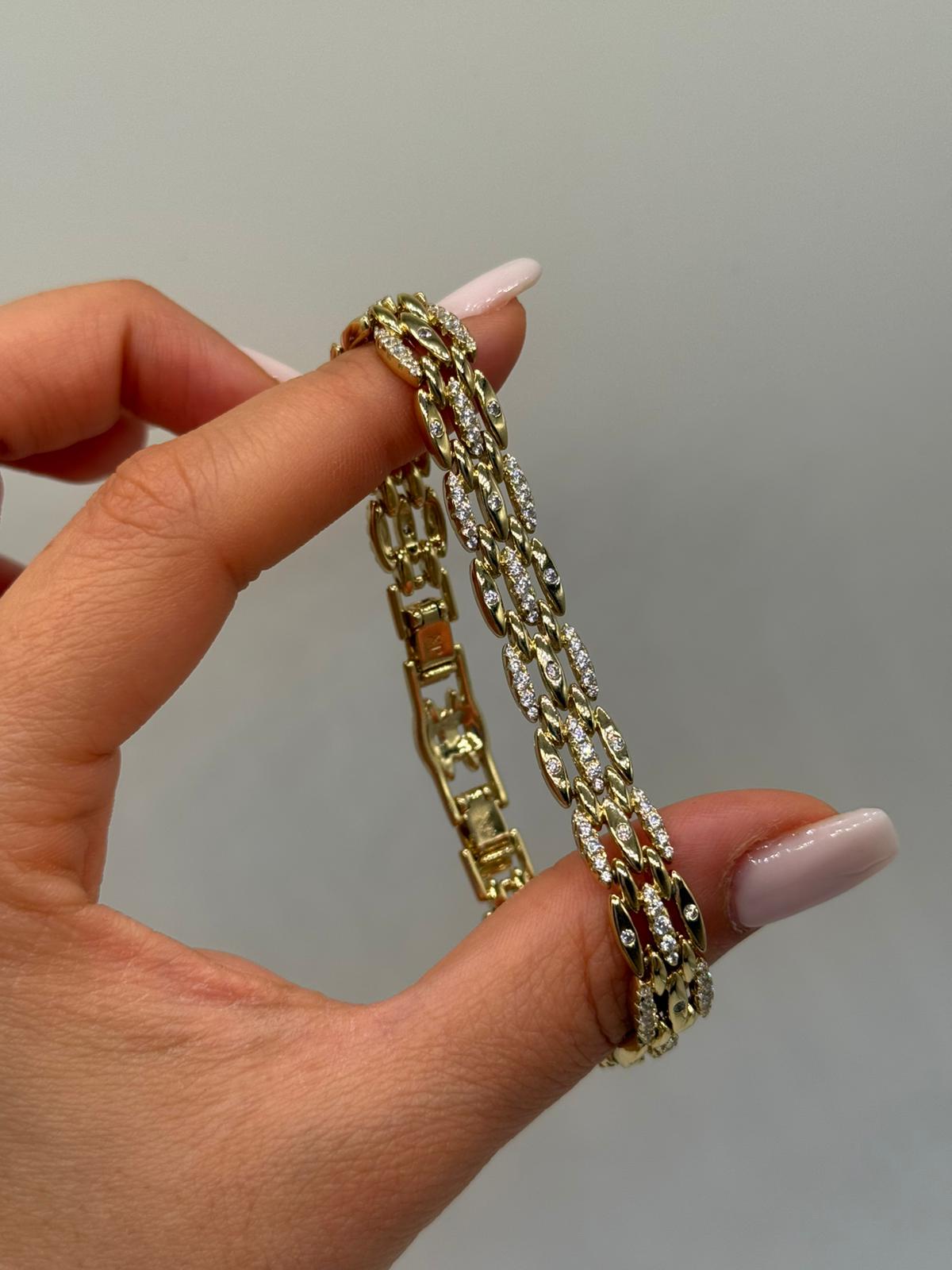 Zincir yapısının hareketli formu, taşların ışıltısıyla birleşerek bilekliğe güçlü ve lüks bir karakter kazandırır.