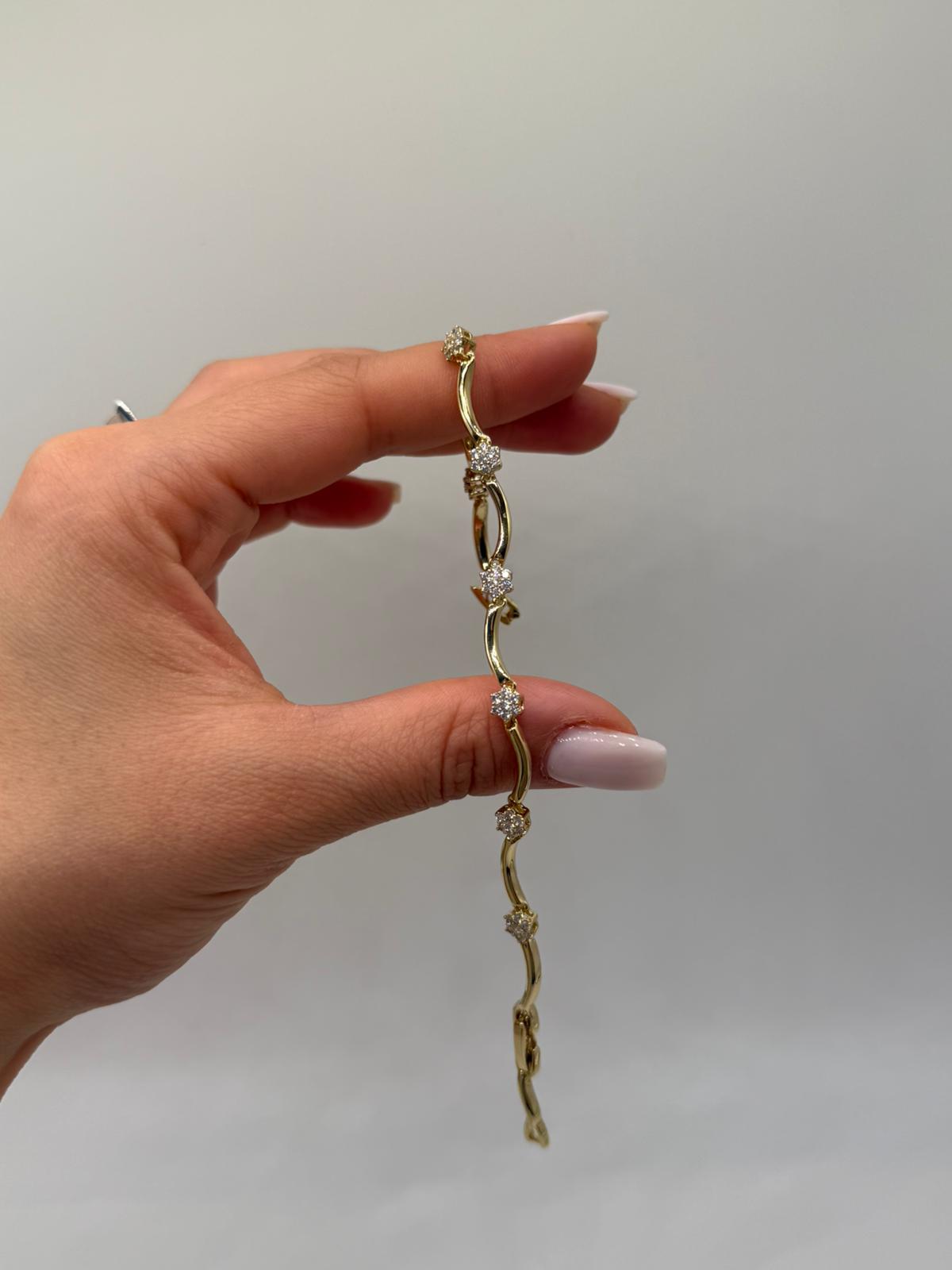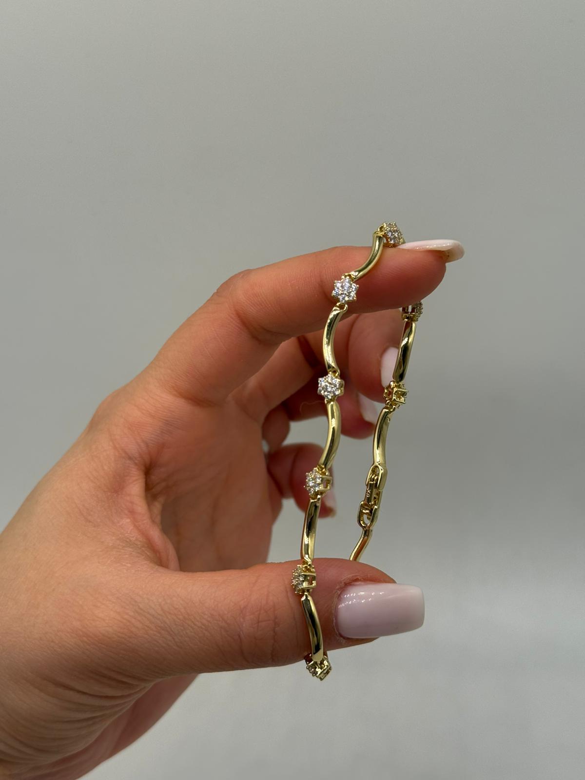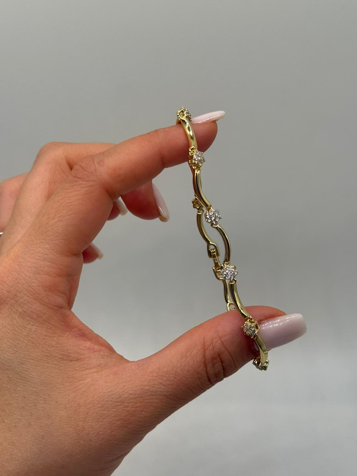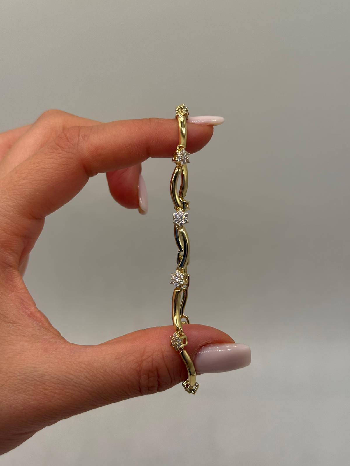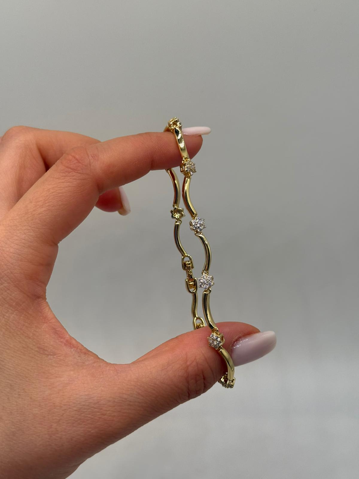 Zarif dalgalı formu ve aralıklı yerleştirilmiş zirkon taş detaylarıyla öne çıkan bu kadın bileklik, bilekte akıcı ve feminen bir duruş sergiler. Kavisli zincir yapısı, tasarıma hareket katarken taş detaylar bilekliğe dengeli bir ışıltı kazandırır.