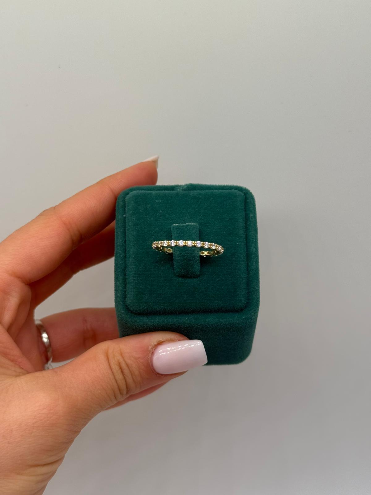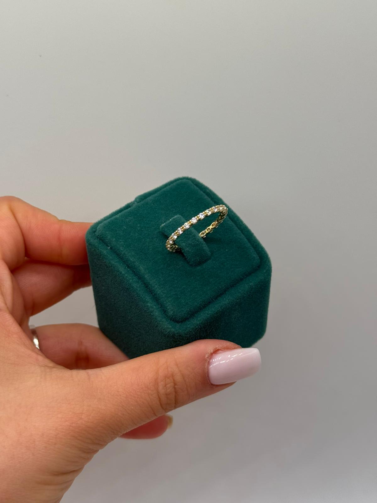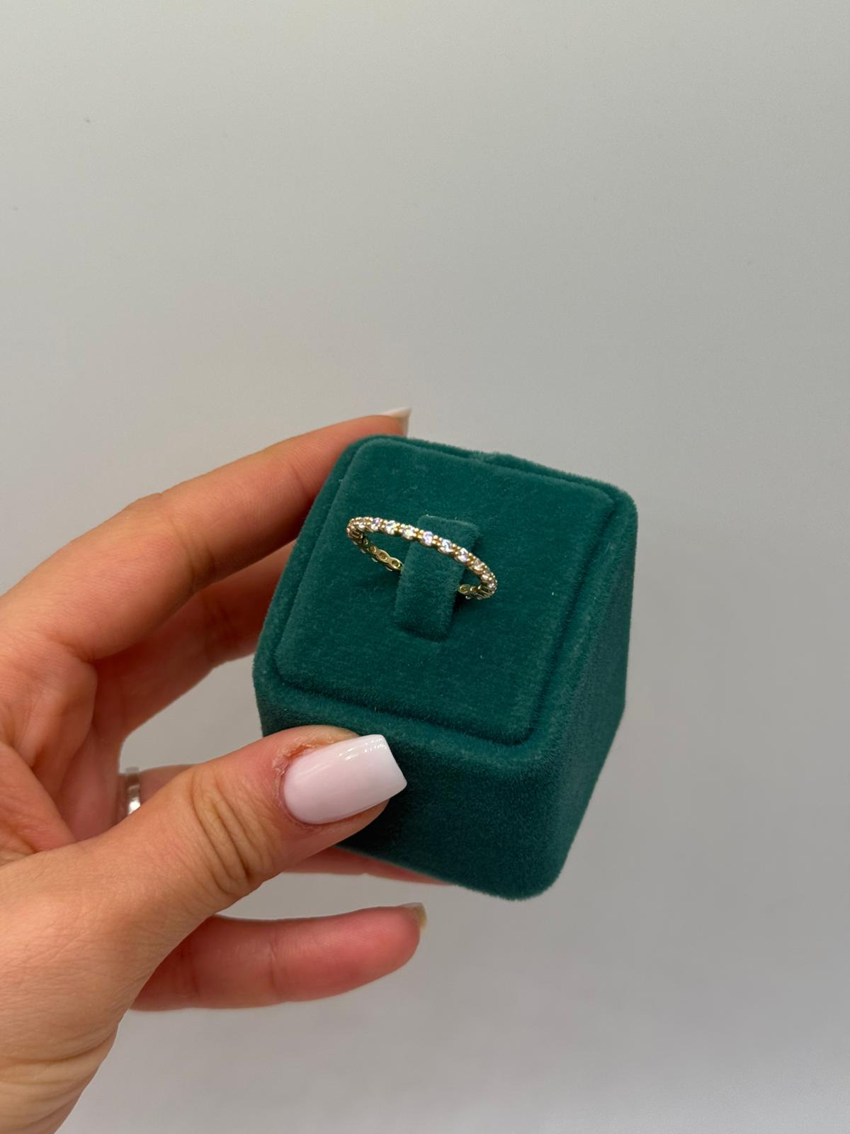 Eternal Shine Yüzük, çevresi tamamen ışıltılı taşlarla kaplı zamansız bir tasarıma sahiptir. İnce ve zarif yapısı sayesinde tek başına şık bir görünüm sunarken, diğer yüzüklerle birlikte kullanıldığında modern bir stil yaratır.