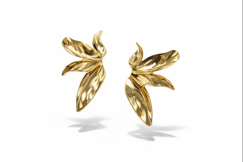 Kelebek kanadından ilham alan organik formu, küpeye hareketli ve feminen bir karakter kazandırır. Parlak gold yüzeyi ışığı etkileyici şekilde yansıtarak kulakta sofistike ve lüks bir görünüm oluşturur.