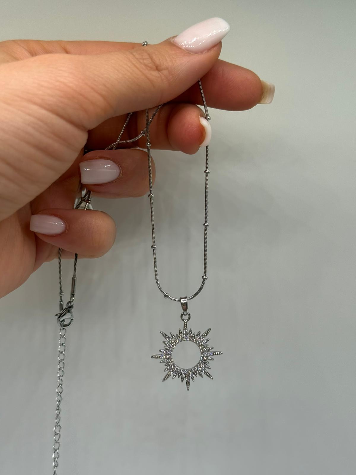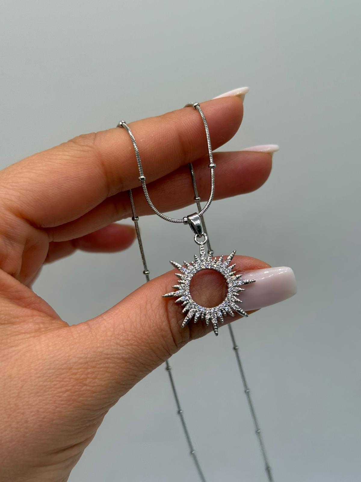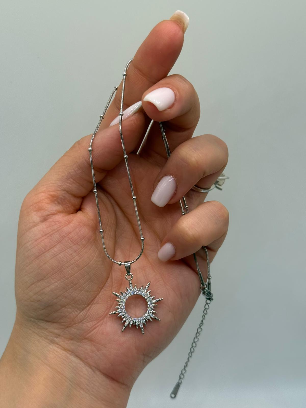 Işığın ve enerjinin simgesi olan güneş figürlü bu zarif kolye, çevresini saran parlak taş detaylarıyla göz alıcı bir şıklık sunar. Ortası boş dairesel tasarımı sayesinde modern ve hafif bir görünüm kazanırken, güneş ışınlarını andıran formu kolyeye karakteristik bir duruş kazandırır. Gümüş renk kaplaması sayesinde hem günlük kombinlerde hem de özel günlerde rahatlıkla kullanılabilir.
