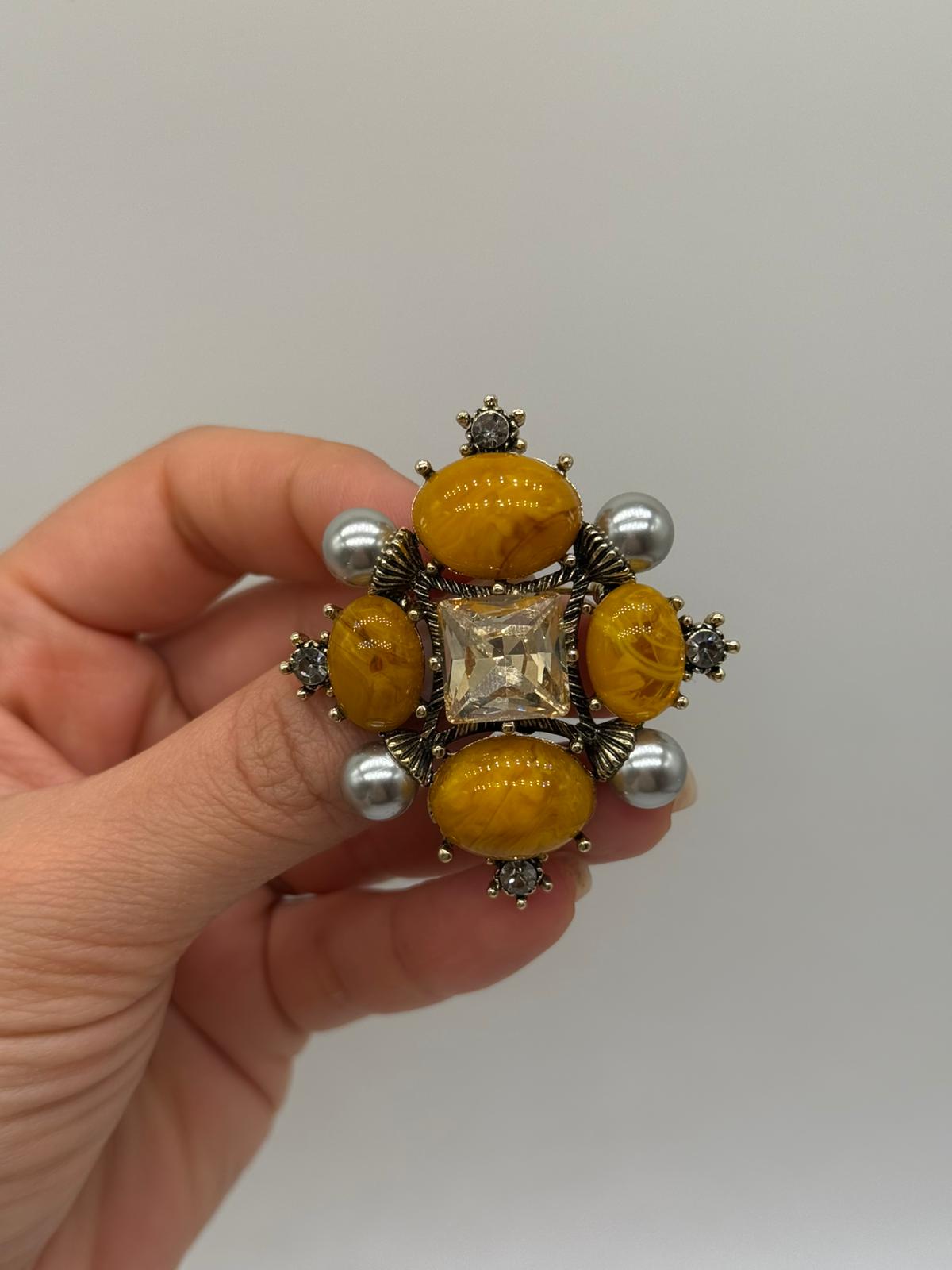 Hardal sarısı tonlarındaki oval taşların sıcaklığı, merkezde yer alan kare kesim şeffaf taşın ışıltısıyla buluşarak bu broşa zengin ve sofistike bir karakter kazandırır. Antik gold tonlu metal gövde, tasarıma vintage bir derinlik katarken, çevresinde yer alan gri inci detaylar dengeli ve asil bir kontrast oluşturur.