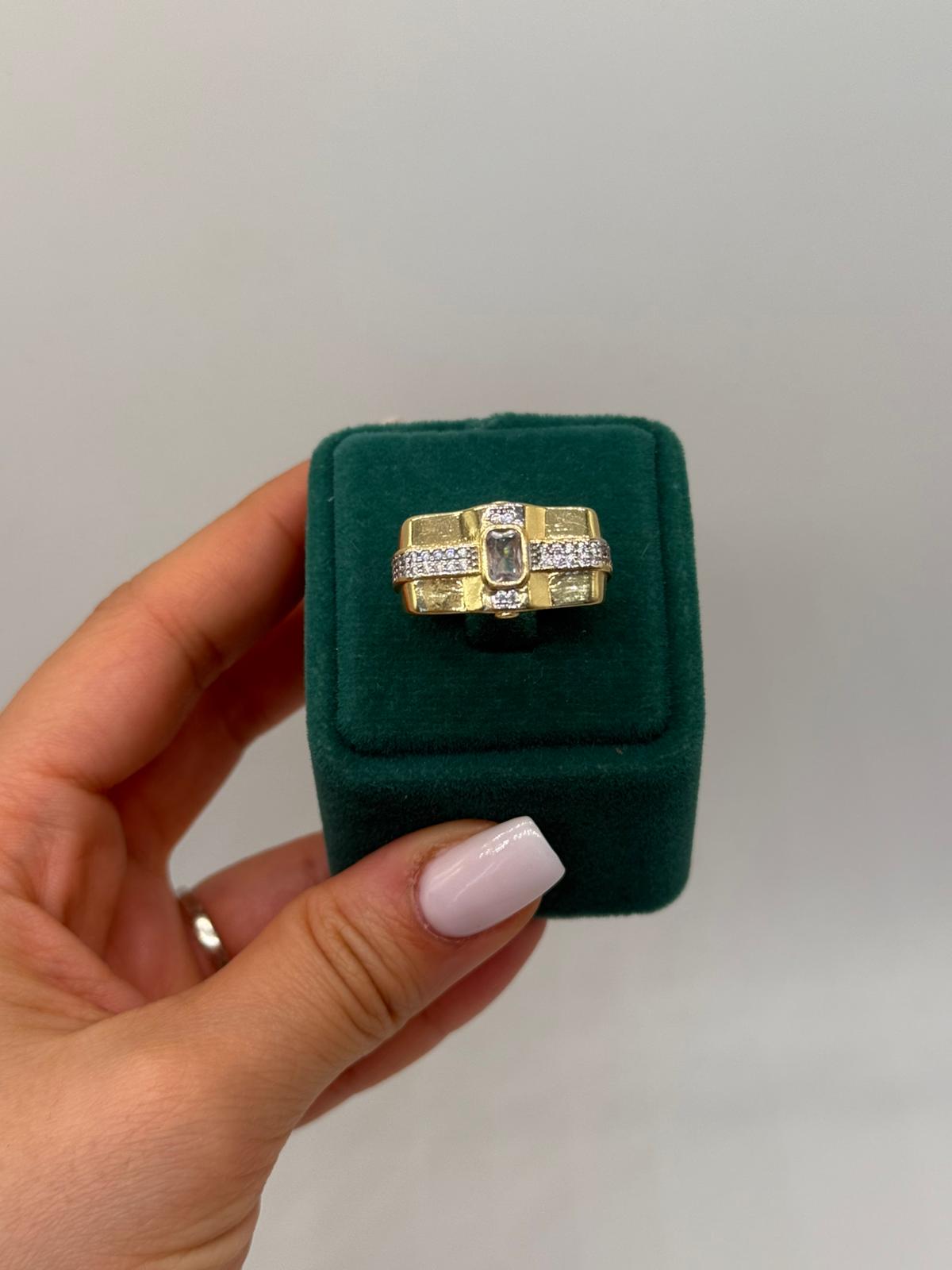 Imperio Baget Detaylı Yüzük, güçlü tasarımı ve lüks duruşuyla dikkat çeken özel bir parçadır. Geniş bant yapısı, merkezde yer alan baget kesim taş ve yanlara doğru uzanan parlak taş şeritleriyle zengin bir görünüm sunar. Altın kaplama yüzeyi, tasarıma sofistike ve iddialı bir karakter kazandırır.