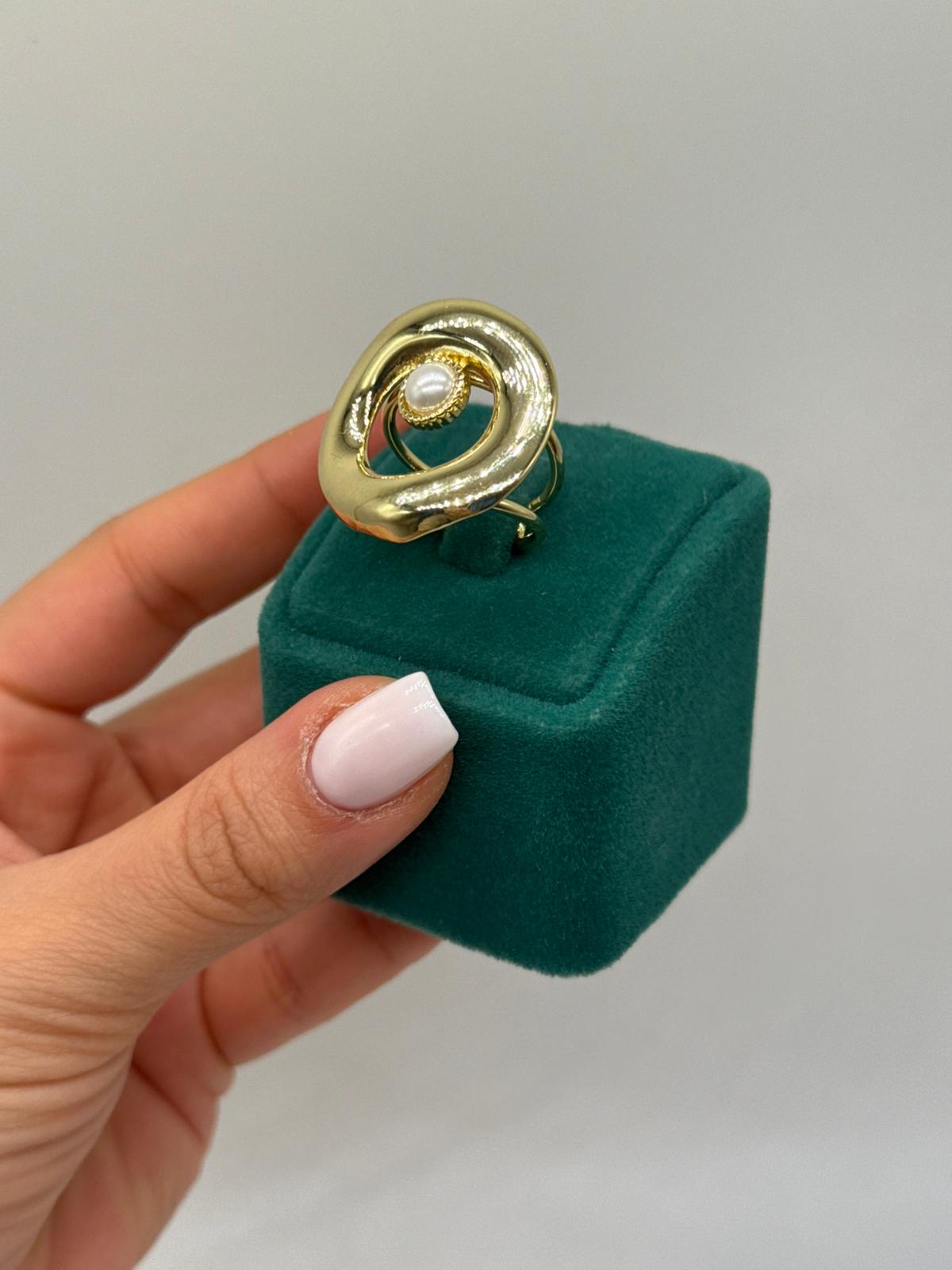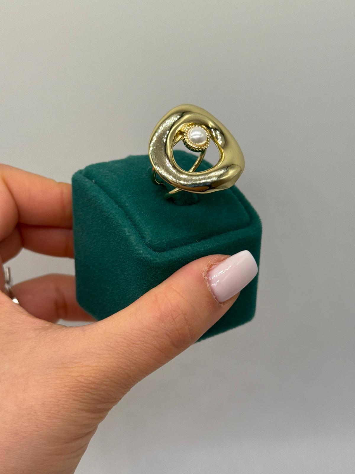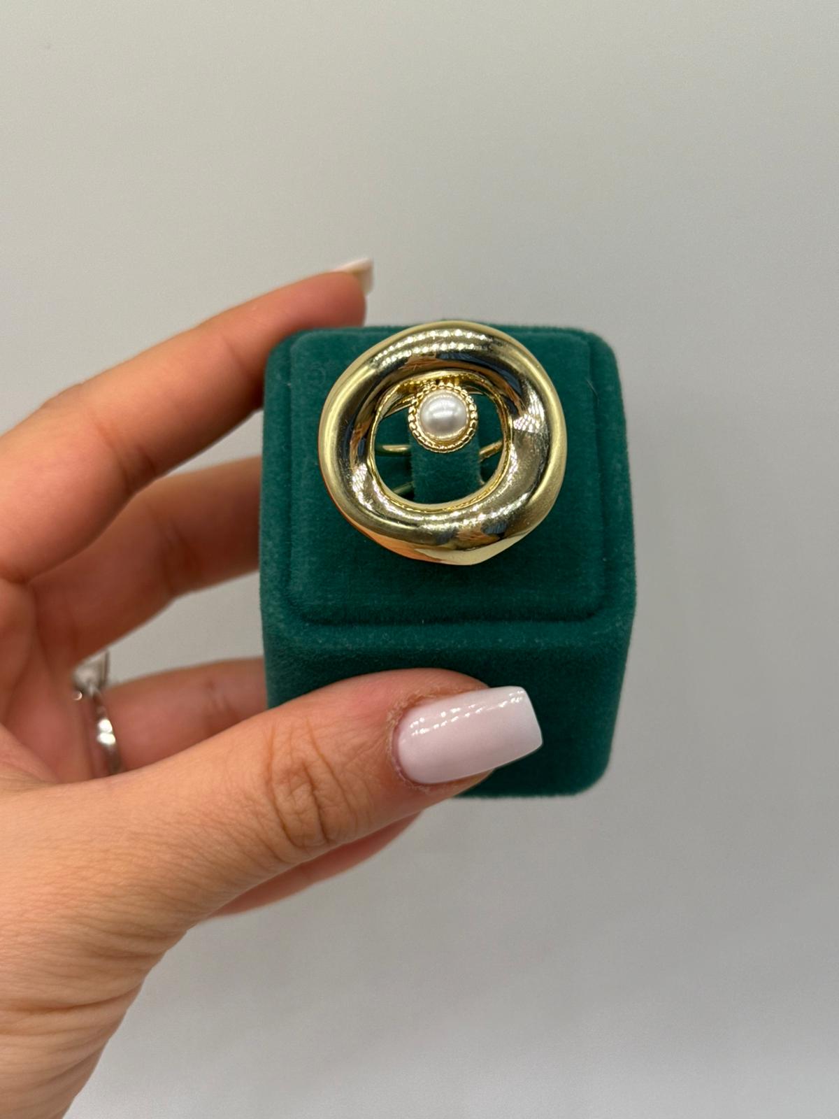 Dairesel formu ve merkezinde yer alan zarif inci detayıyla tasarlanan bu yüzük, modern çizgileri klasik şıklıkla buluşturur. Parlak gold kaplama yüzeyi sayesinde dikkat çekici ama dengeli bir görünüm sunar.