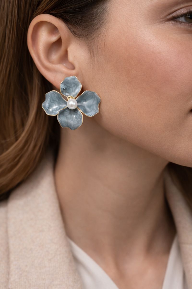 İnci Detaylı Mavi Çiçek VIP Çelik Küpe, doğadan ilham alan tasarımıyla zarafeti ve sadeliği bir araya getirir. Dalgalı çiçek yaprak formu, soft mavi mermer dokulu yüzeyiyle küpeye romantik ve modern bir hava kazandırır. Ortasındaki inci detayı ise tasarımı tamamlayan şık bir dokunuş sunar.