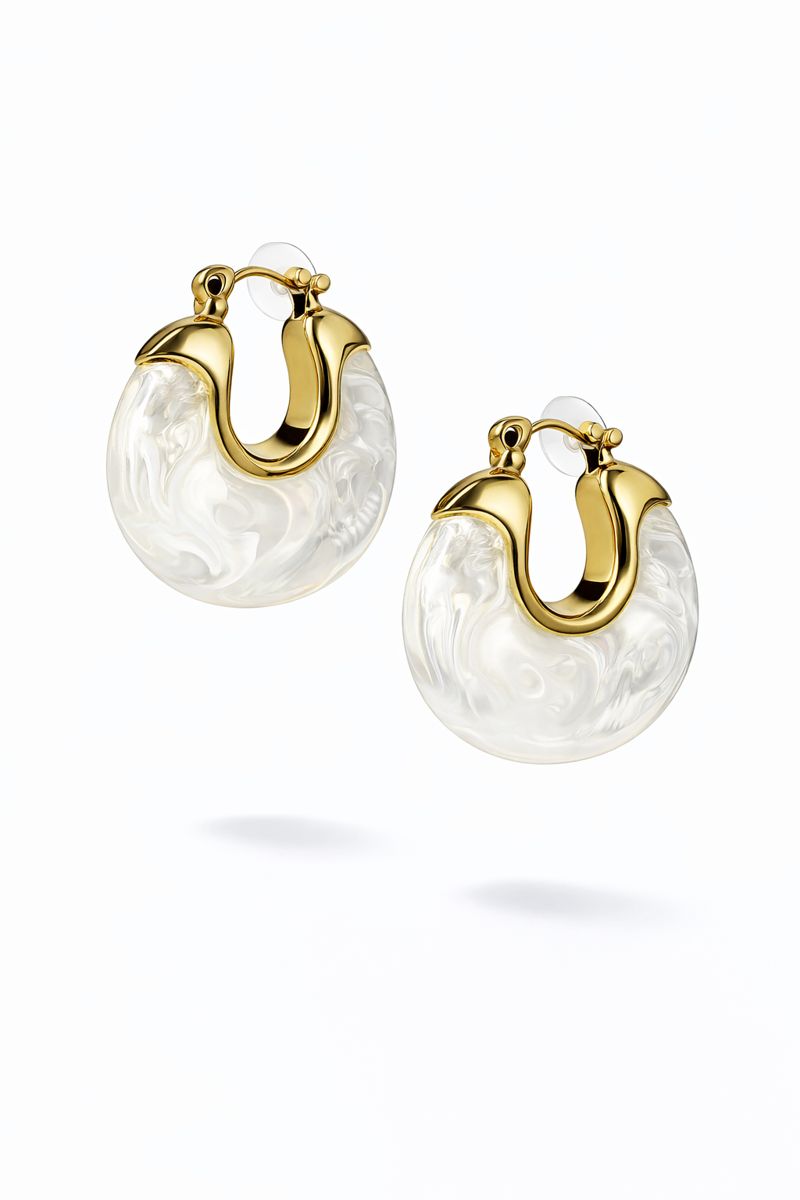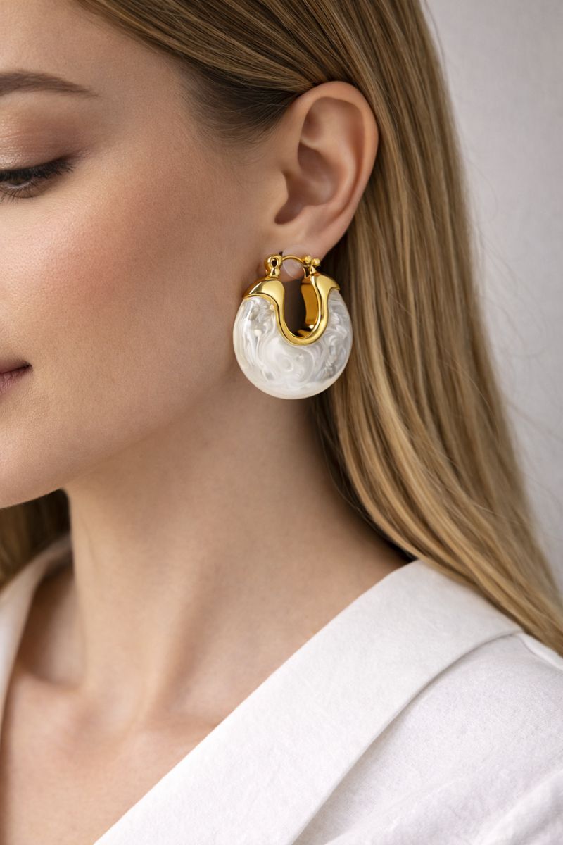 Zarif inci efektli beyaz yüzeyi ve gold renk metal detayıyla tasarlanan bu halka küpe, modern ve sofistike bir şıklık sunar. Mermer dokulu görünümü sayesinde ışığı yumuşak şekilde yansıtarak kulağa zarif bir ışıltı katar. Günlük kombinlerde sade bir şıklık sağlarken, özel davetlerde de stilinizi tamamlayan güçlü bir aksesuar olarak öne çıkar. Hafif yapısı sayesinde gün boyu konforlu kullanım sunar.