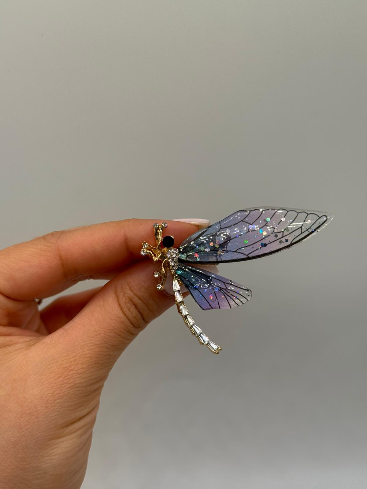 Doğadan ilham alan bu şık broş, zarafetin ve hafifliğin sembolü olan yusufçuk figürüyle tasarlanmıştır. Şeffaf, mavi-mor tonlarda ışıltılı kanatlar; ince damar detayları ve simli yüzeyiyle ışık altında etkileyici bir parıltı sunar. Altın tonlu gövde ve kristal taşlarla süslenmiş uzun form, broşa sofistike ve modern bir hava kazandırır.