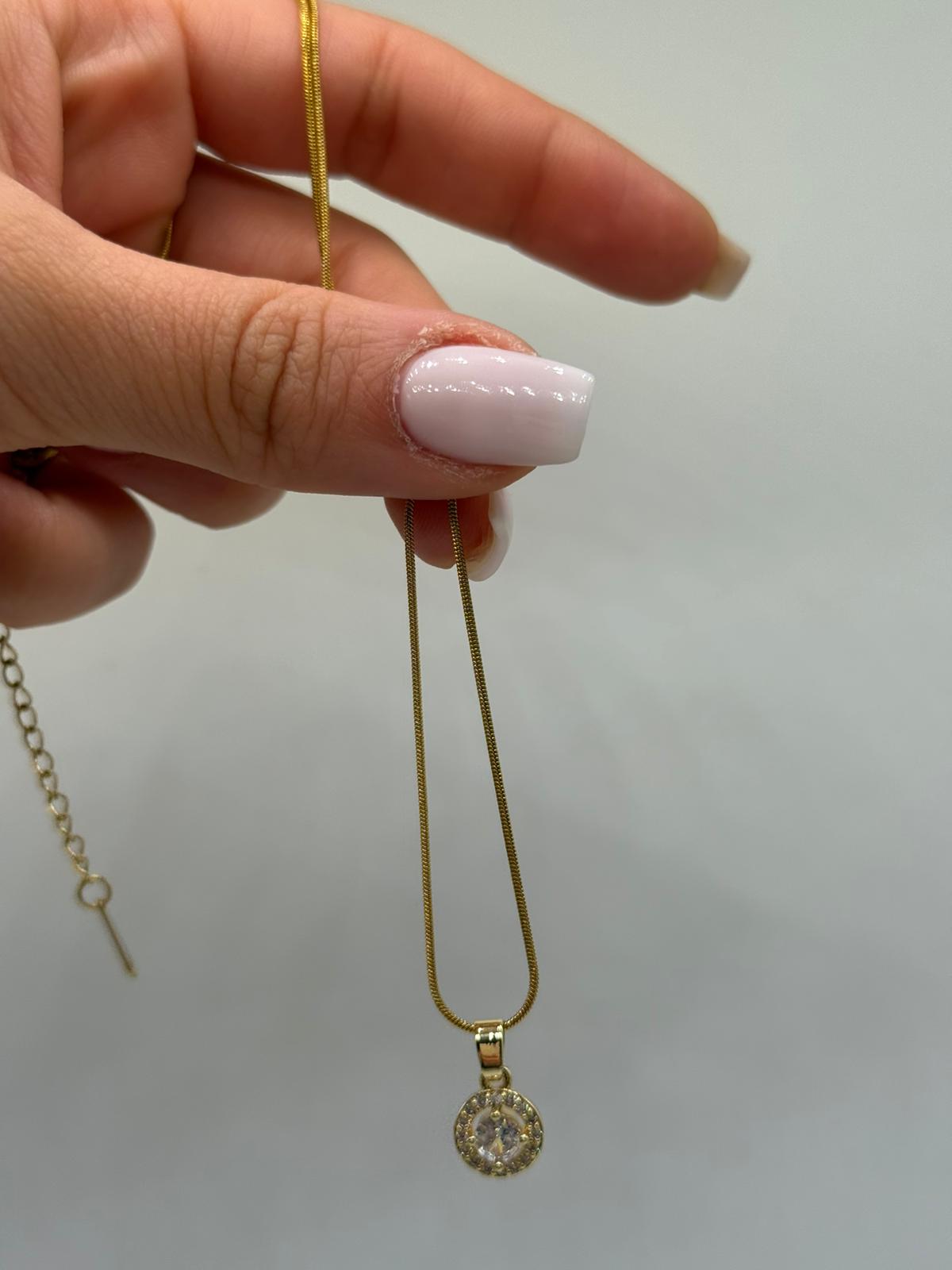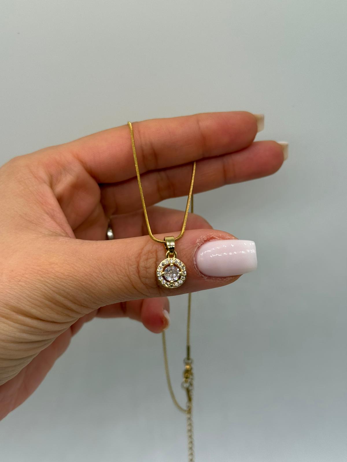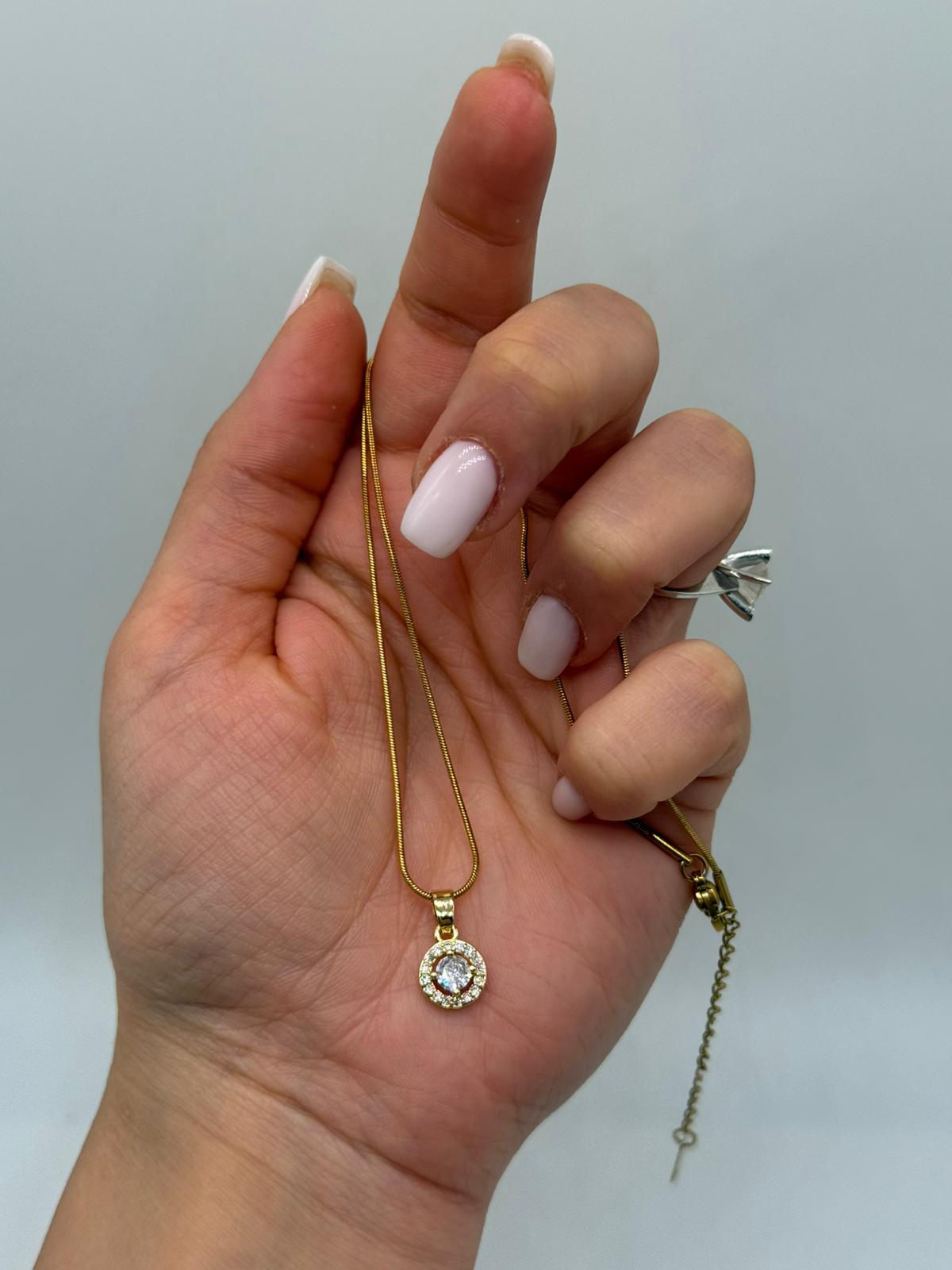 Altın renk kaplamalı bu zarif kolye, merkezinde yer alan ışıltılı tek taş detayı ve etrafını saran ince taş çerçevesiyle sade şıklığın en güzel örneklerinden biridir. Yuvarlak formu sayesinde klasik bir görünüm sunarken, minimal tasarımıyla günlük kullanıma da rahatlıkla uyum sağlar.
