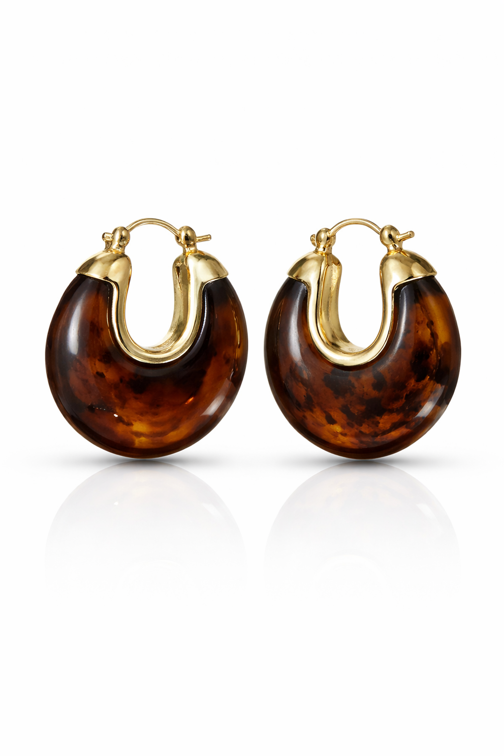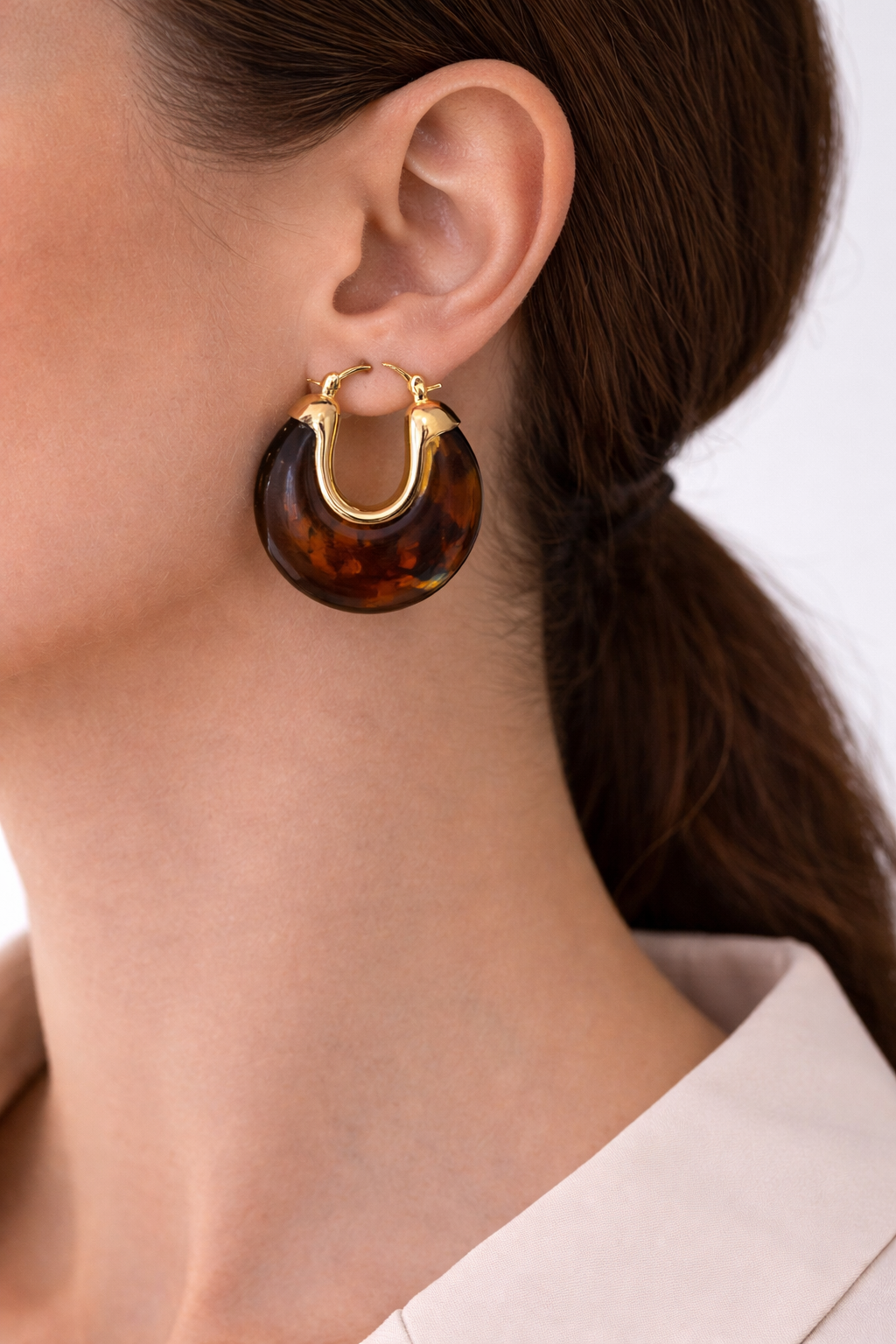 Fi Jewels koleksiyonunda yer alan kahverengi doğal taş görünümlü gold detaylı halka kadın küpe, sıcak tonları ve modern formu ile zarif bir şıklık sunar.