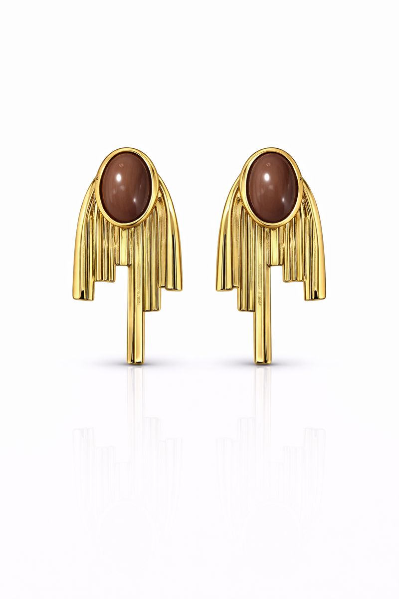 Üst bölümde yer alan parlak oval kahverengi taş, küpeye sıcak ve sofistike bir hava kazandırırken; alt kısımdaki gold renkli püskül form detaylar tasarıma hareketli ve dinamik bir görünüm katar. İnce çizgili metal yüzey, ışıkla birlikte şık yansımalar oluşturarak küpenin dikkat çekmesini sağlar.