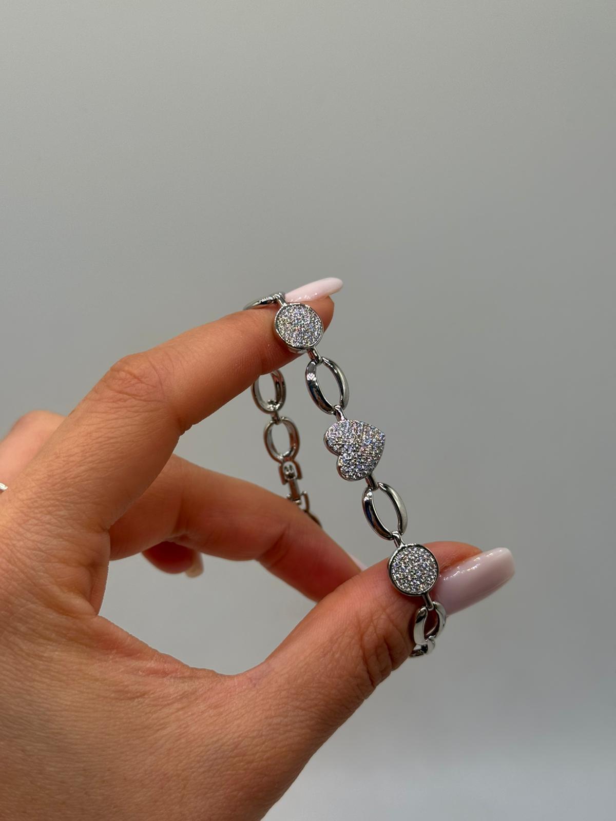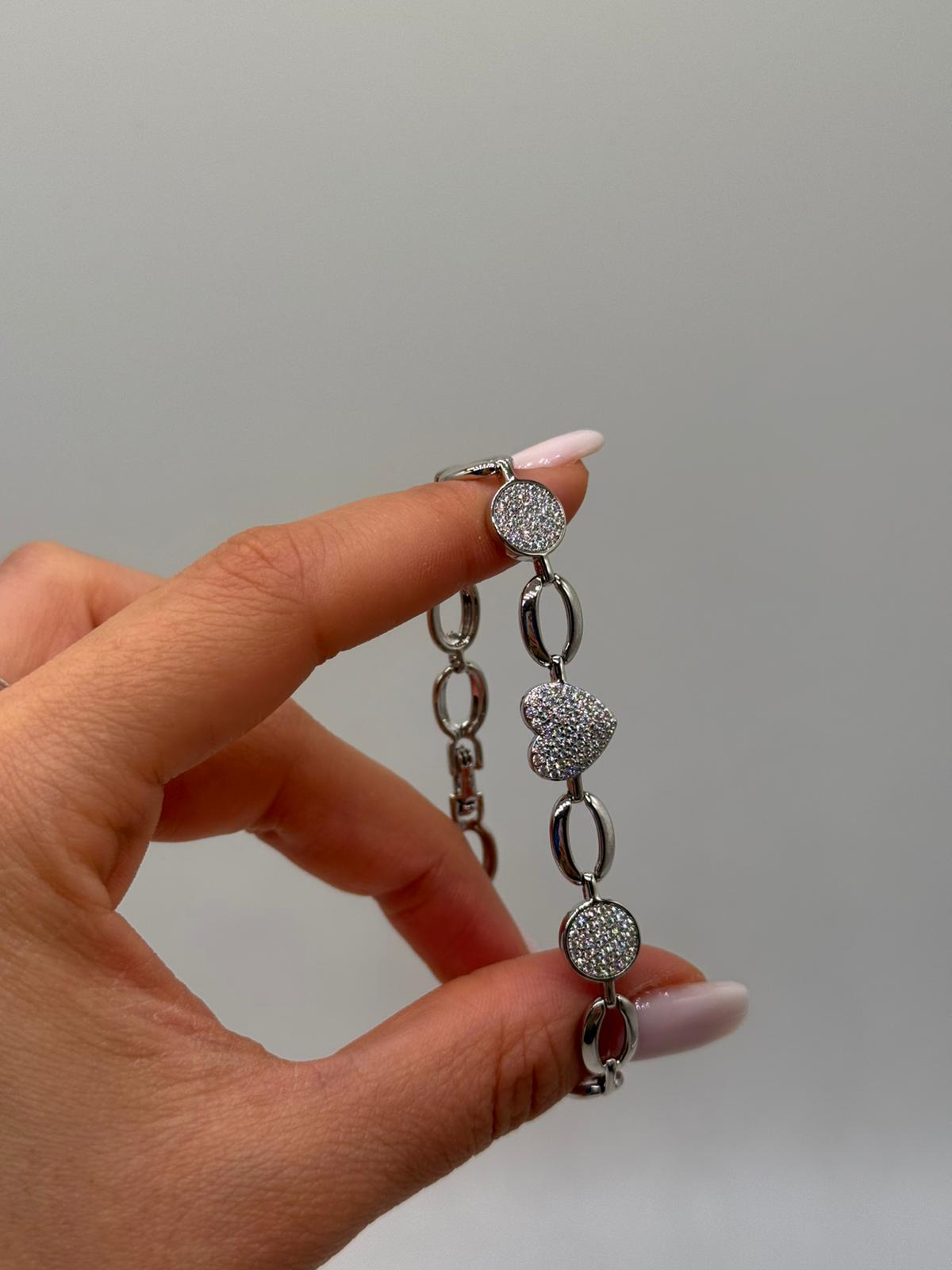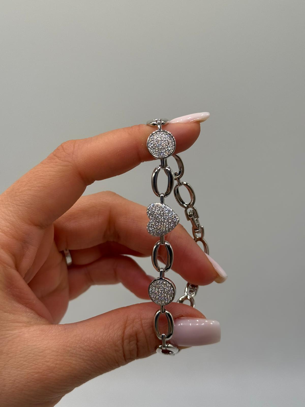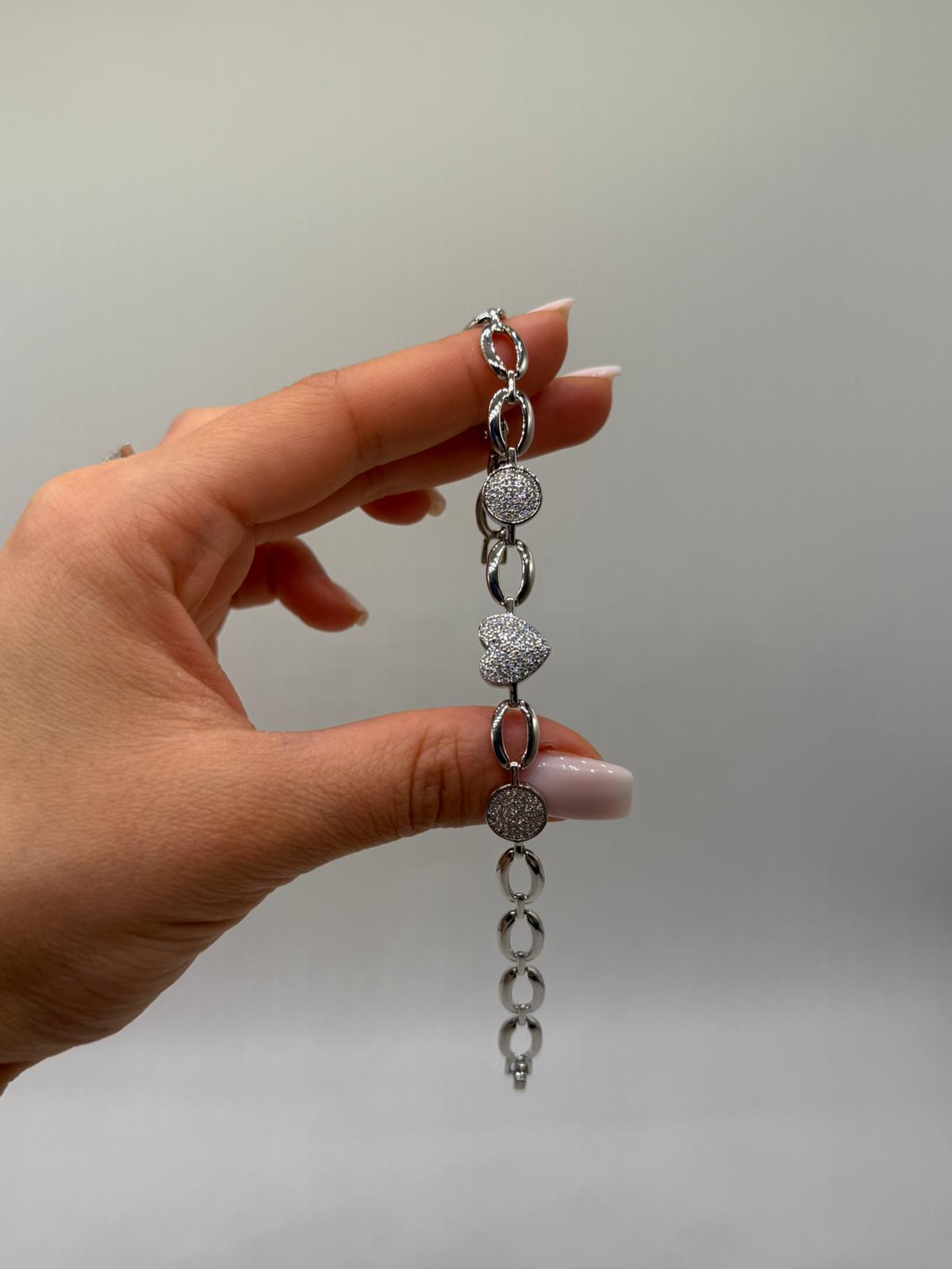Romantik kalp figürü ve yuvarlak formda zirkon taş detaylarının uyumuyla tasarlanan bu kadın bileklik, zarafeti ve ışıltıyı bir arada sunar. İnce zincir yapısı sayesinde bilekte hafif ve şık bir duruş sergiler.