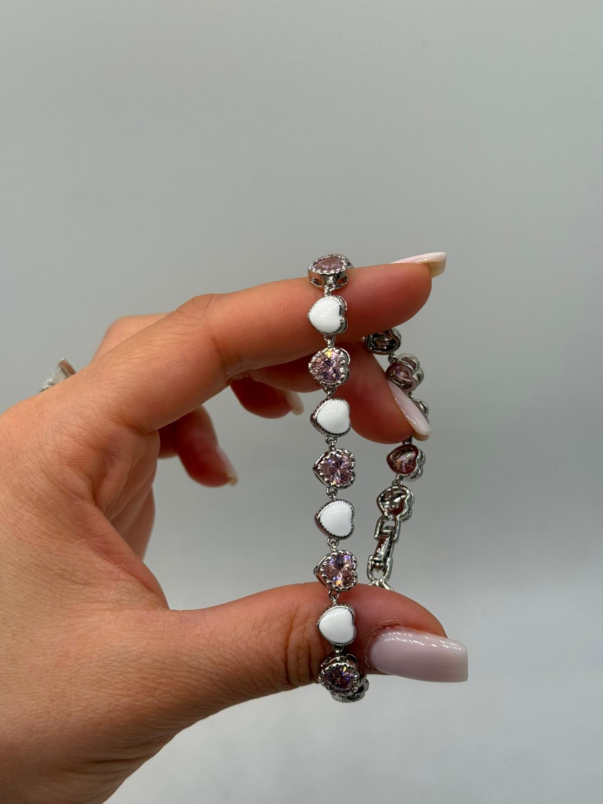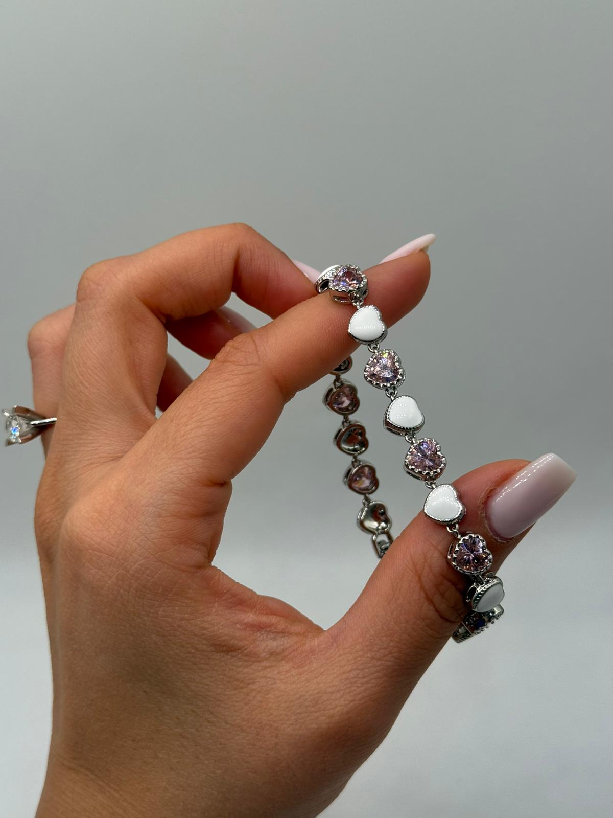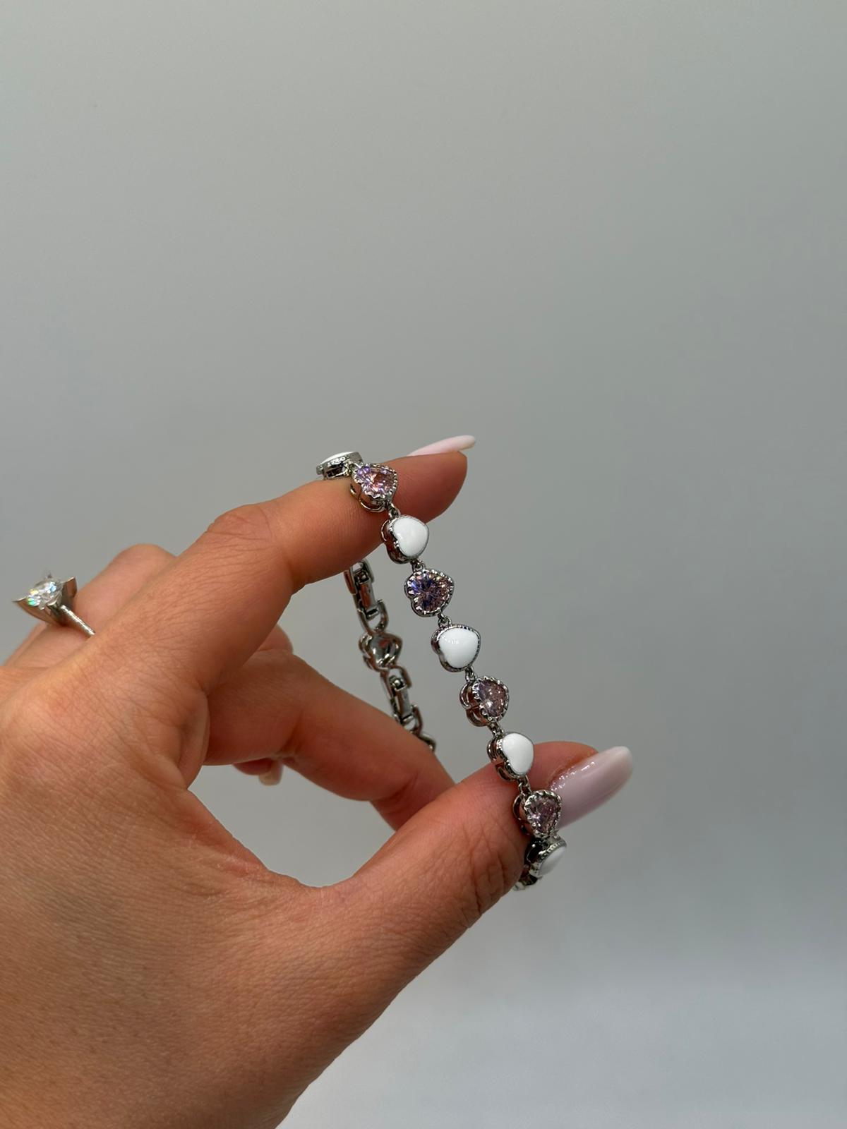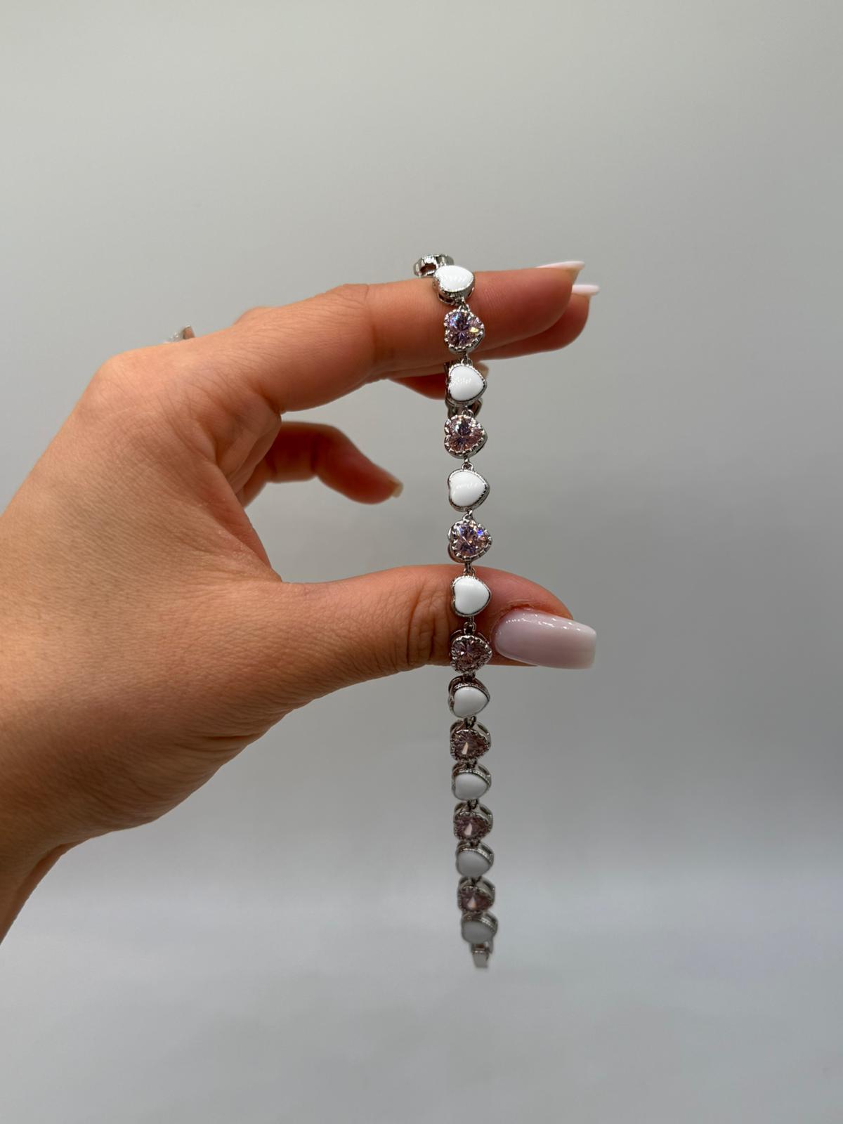 Kalp figürleriyle romantik bir tasarım sunan bu özel bileklik, parlak zirkon taş detaylarıyla bilekte zarif ve şık bir görünüm oluşturur. Beyaz kalp motifleri ve ışıltılı taşların uyumu, modeli hem günlük hem de özel gün kombinleri için ideal hale getirir.