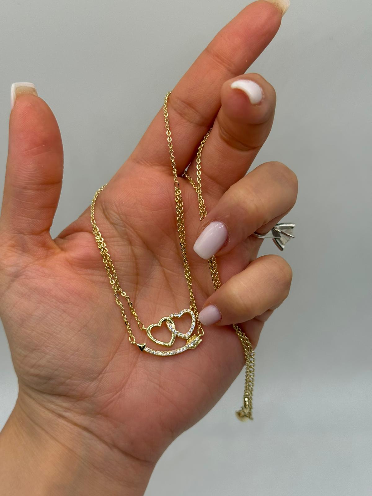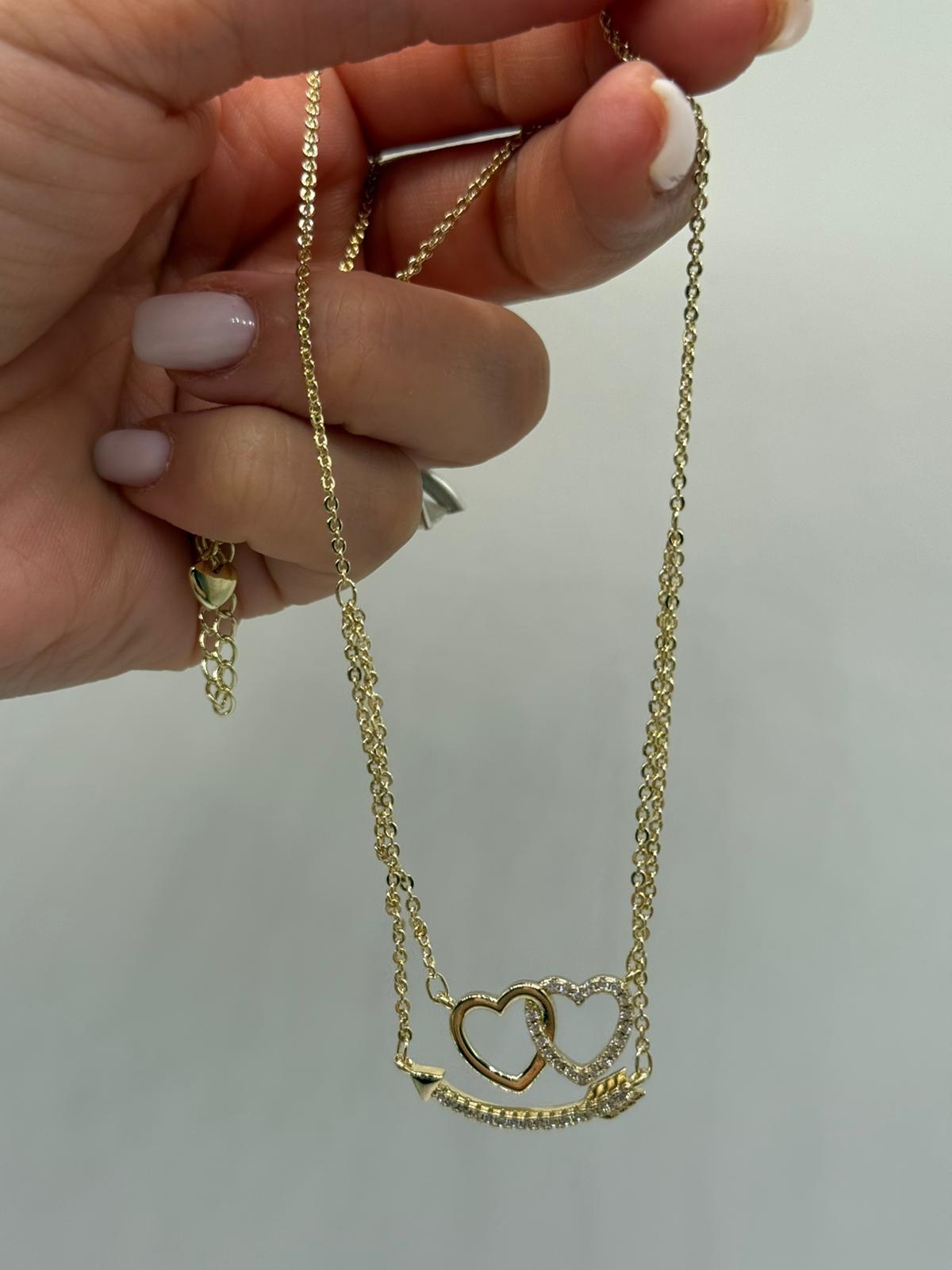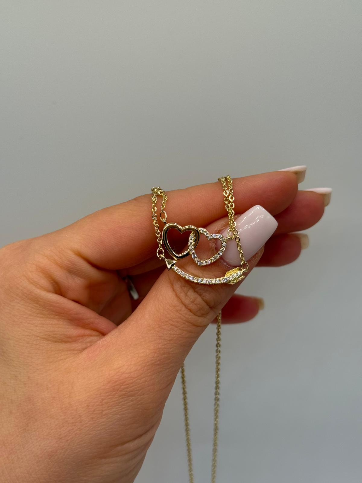 Altın renk kaplamalı bu çift kalp figürlü kolye, aşkı ve bağlılığı simgeleyen zarif tasarımıyla öne çıkar. Birbiriyle iç içe geçmiş kalp detayları ve alt kısmındaki ok formu, kolyeye romantik ve anlamlı bir karakter kazandırır.