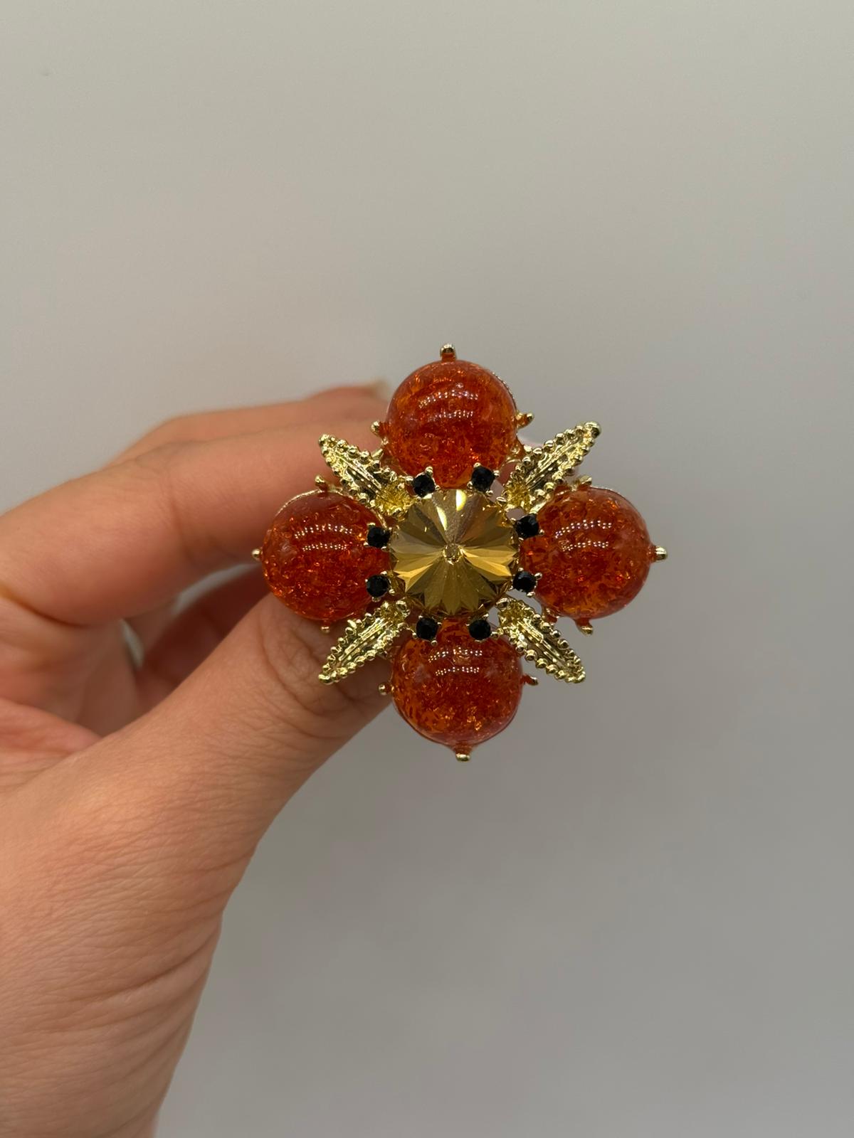 Doğadan ilham alan çiçek formu ile tasarlanan bu şık broş, sıcak kehribar tonlarındaki taşları ve altın renk metal detaylarıyla göz alıcı bir görünüm sunar. Merkezde yer alan parlak taş ve etrafını çevreleyen yuvarlak form taşlar, broşa hacimli ve zarif bir duruş kazandırır.