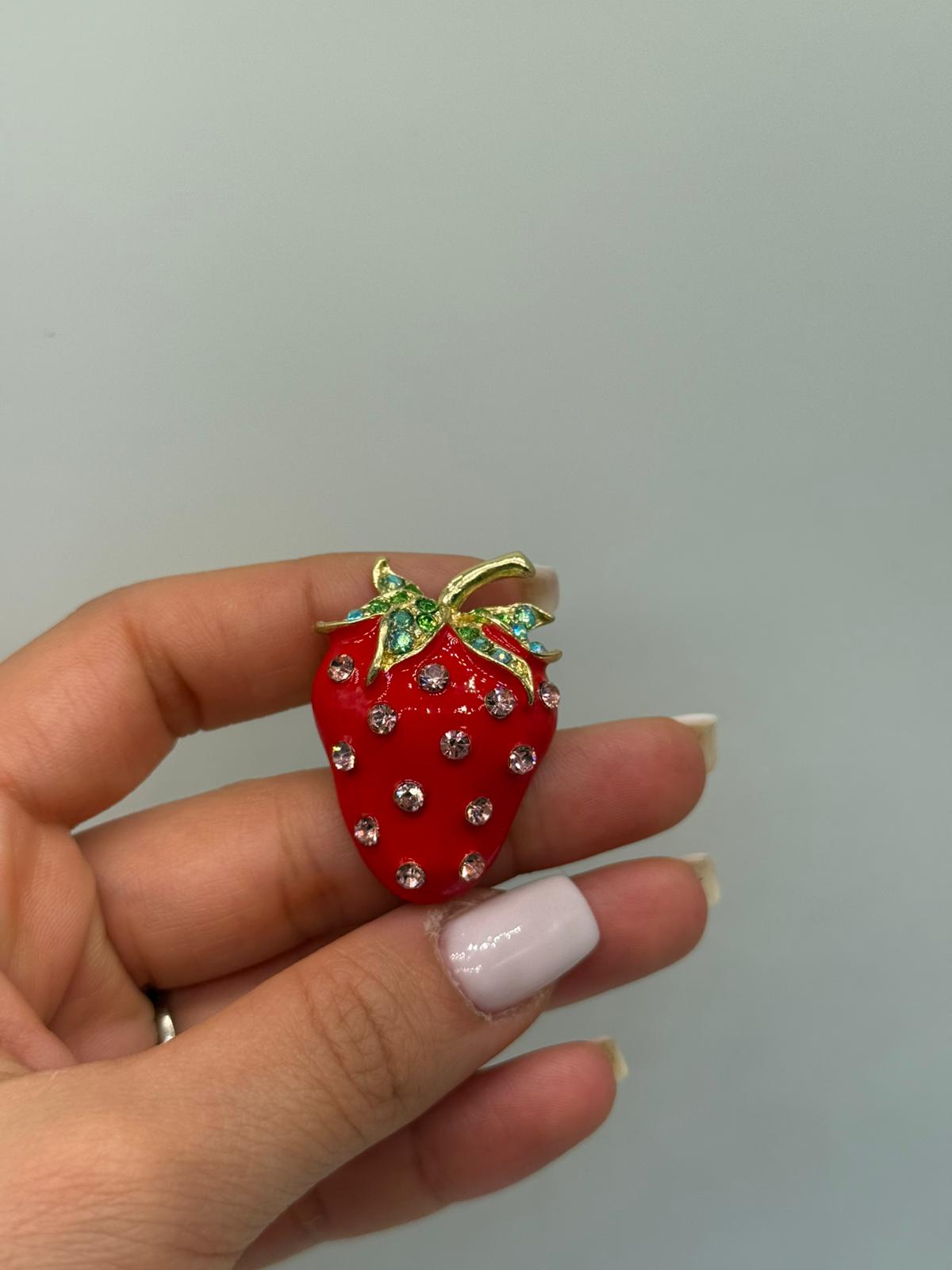 Canlı kırmızı rengi ve neşeli tasarımıyla dikkat çeken bu çilek figürlü broş, stilinize eğlenceli ve zarif bir dokunuş katar. Parlak mine kaplama gövde üzerine serpiştirilmiş şeffaf kristal taşlar, çilek formuna ışıltılı bir derinlik kazandırırken; yeşil ve altın tonlu yaprak detayları tasarımı doğal bir dengeyle tamamlar.