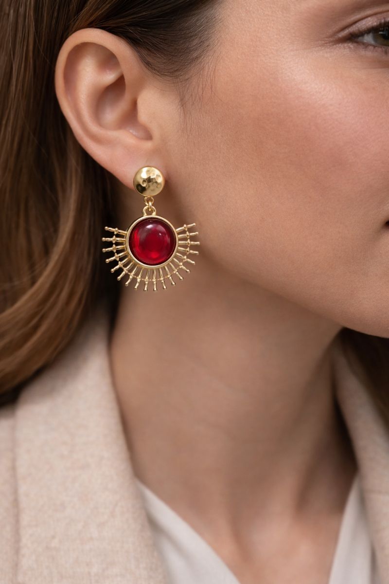 Kırmızı Taşlı Güneş Form Sallantılı VIP Çelik Küpe, enerjik ve iddialı tasarımıyla öne çıkan özel bir modeldir. Merkezde yer alan parlak kırmızı taş, çevresini saran güneş ışını formundaki detaylarla birlikte güçlü ve çarpıcı bir görünüm sunar.