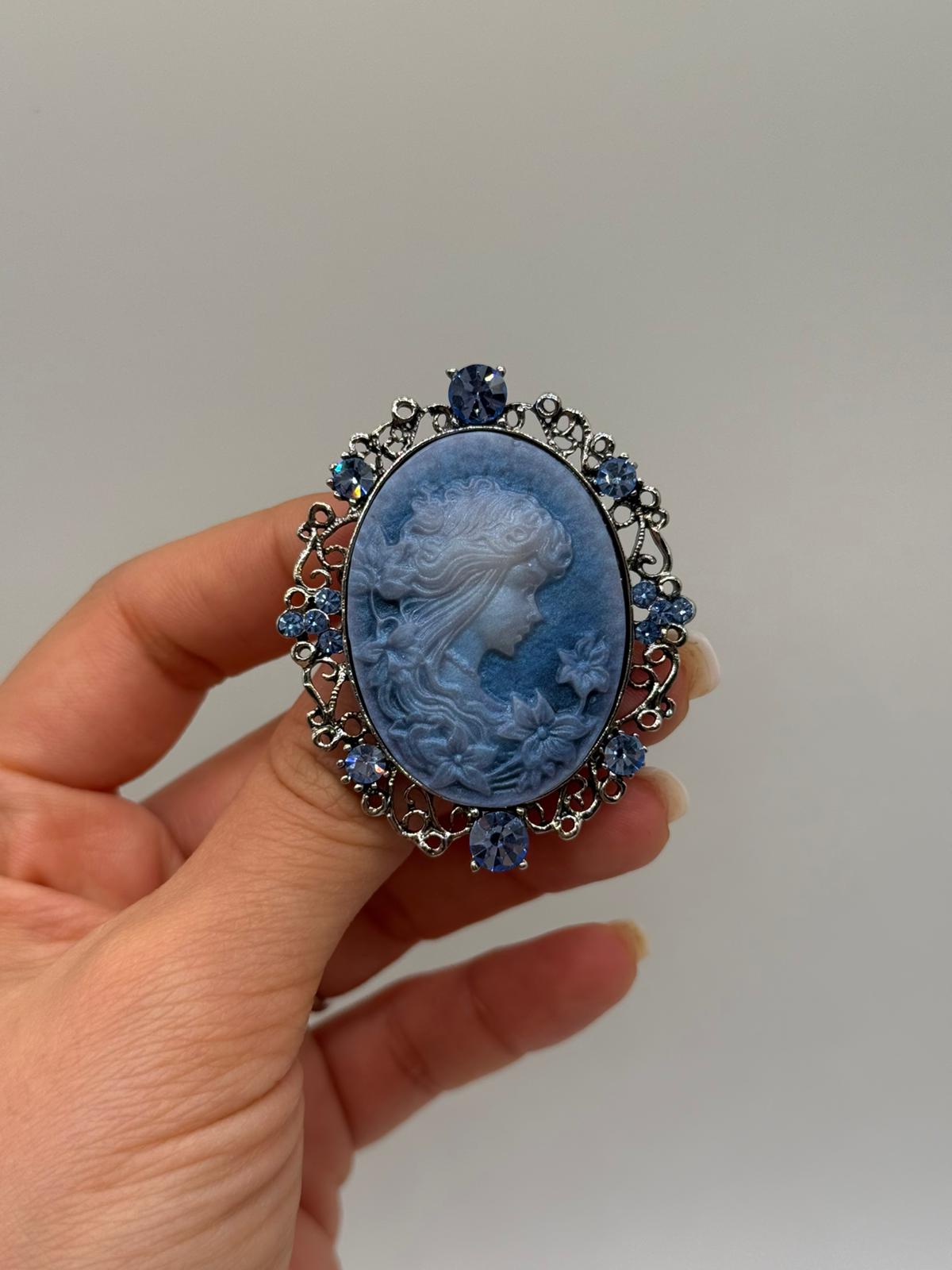 Zamansız şıklığı yansıtan bu özel tasarım broş, klasik kameo (cameo) figürü ile nostaljik ve zarif bir stil sunar. Mavi tonlardaki kabartmalı kadın figürü, etrafını saran detaylı metal çerçeve ve uyumlu mavi zirkon taşlar ile tamamlanarak etkileyici bir bütünlük oluşturur.
