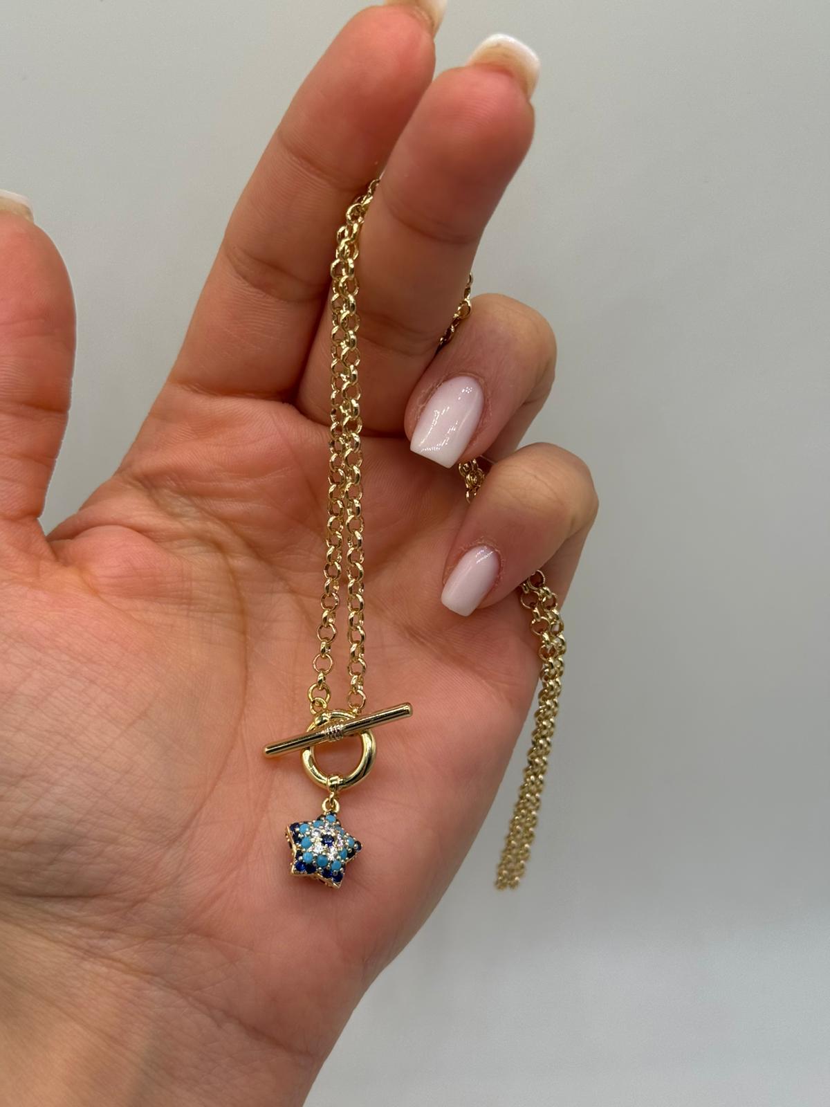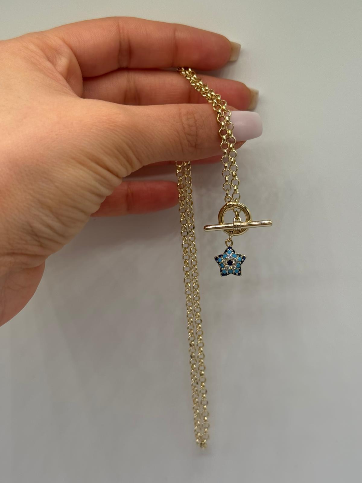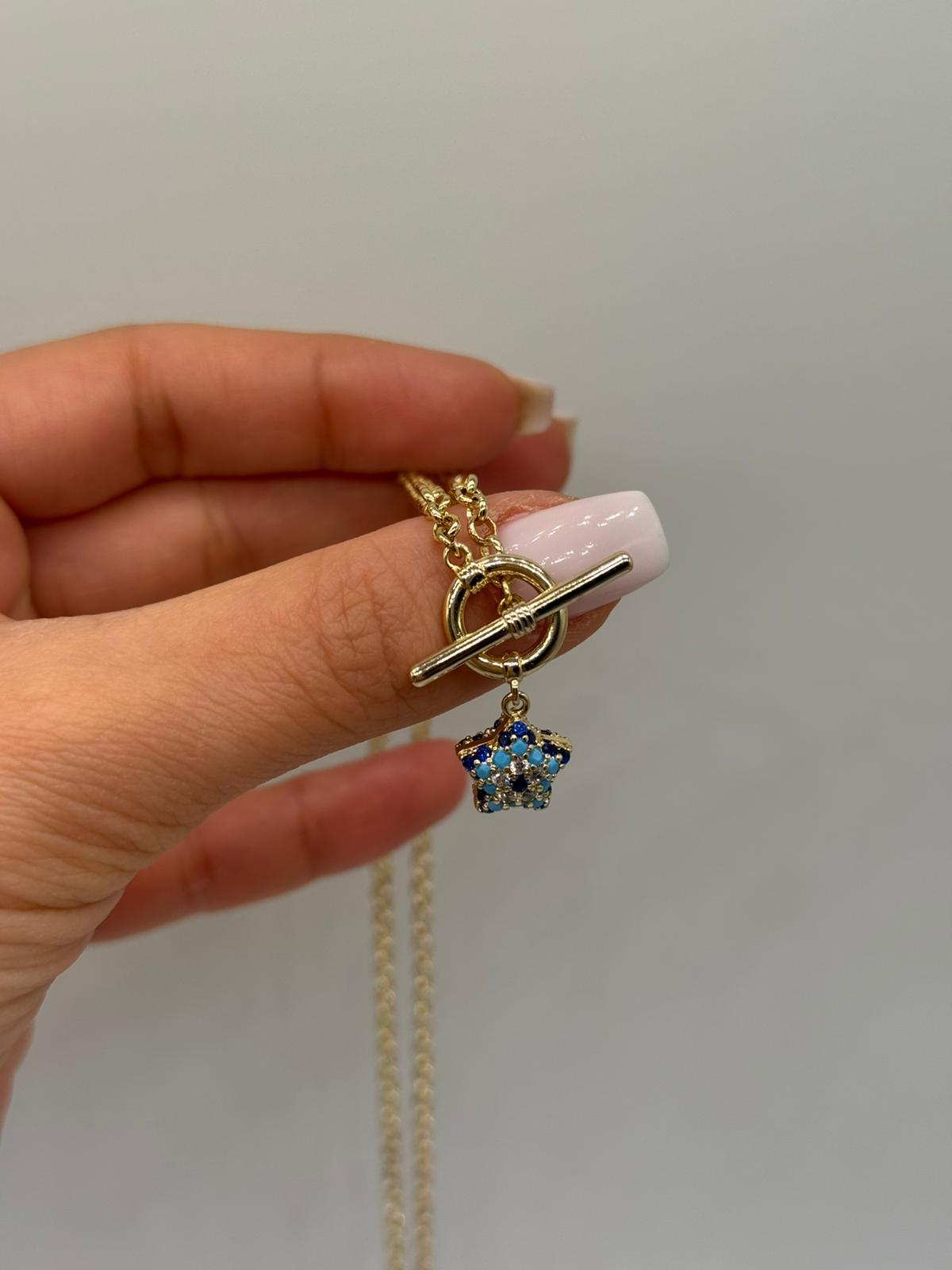 Mavi Yıldız Detaylı Xuping Kolye, zarif zinciri ve ön kısmında yer alan yıldız figürlü sallantı detayıyla şık ve anlamlı bir tasarım sunar. Altın rengi kaplaması, mavi taşlarla süslenmiş yıldız figürüyle kontrast oluşturarak modern ve dikkat çekici bir görünüm kazandırır. Günlük kombinlerde zarif bir dokunuş, özel günlerde ise stilinizi tamamlayan şık bir aksesuar olarak tercih edilebilir. Hafif yapısı sayesinde gün boyu konforlu kullanım sağlar.