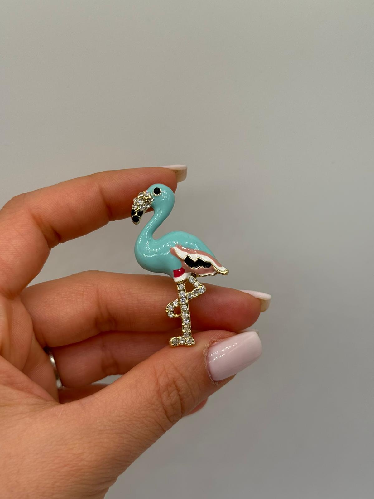 Zarif duruşu ve pastel tonlarıyla öne çıkan bu flamingo figürlü broş, stilinize neşeli ama sofistike bir dokunuş katıyor. Parlak mint yeşili mine kaplama gövdesi, pembe ve siyah detaylarla dengelenirken; kristal taşlarla süslenmiş bacak ve baş kısmı tasarıma ışıltılı bir zarafet kazandırıyor.