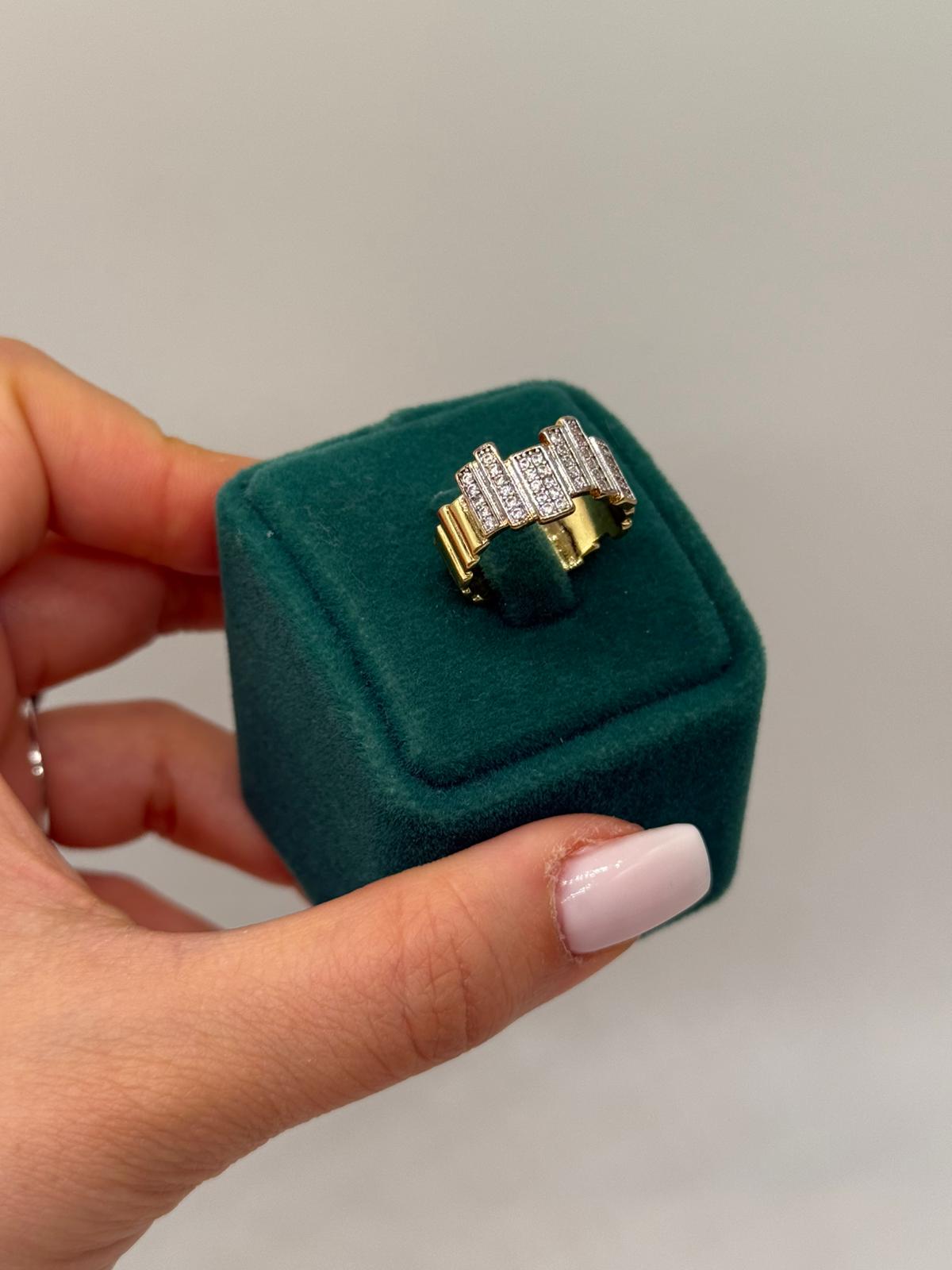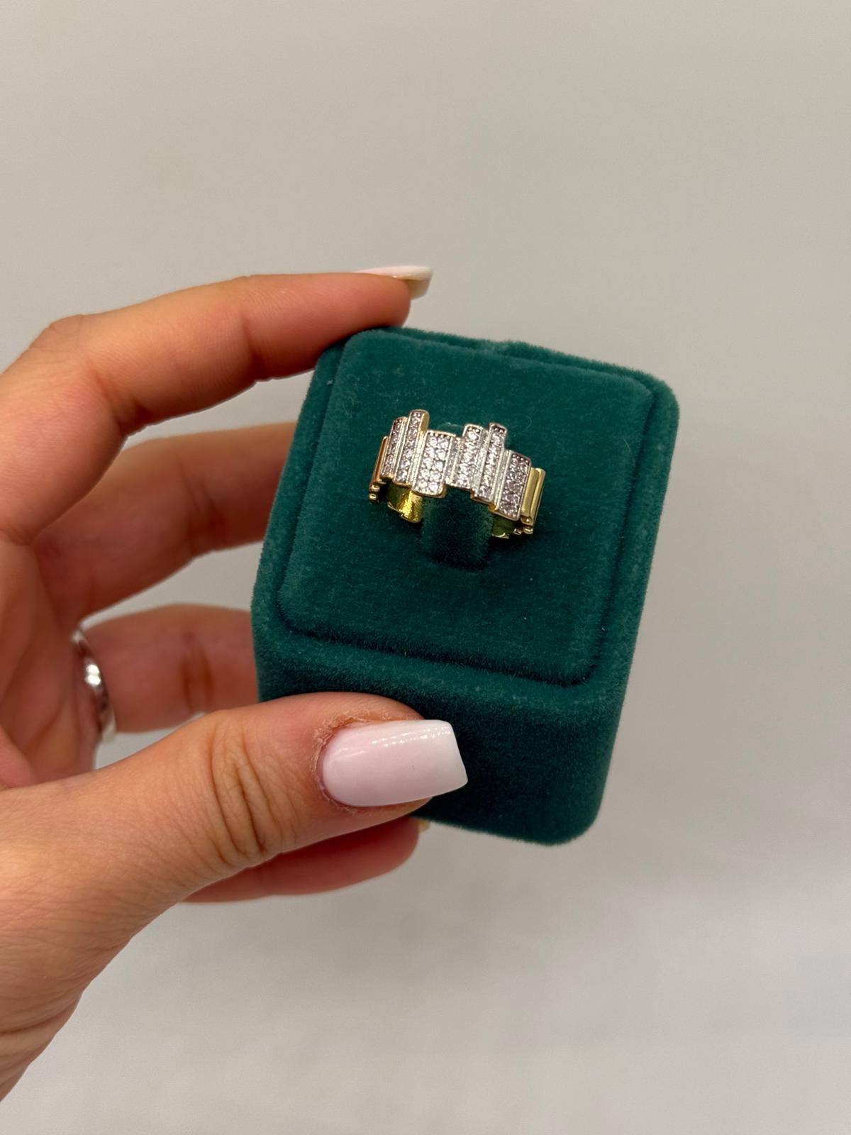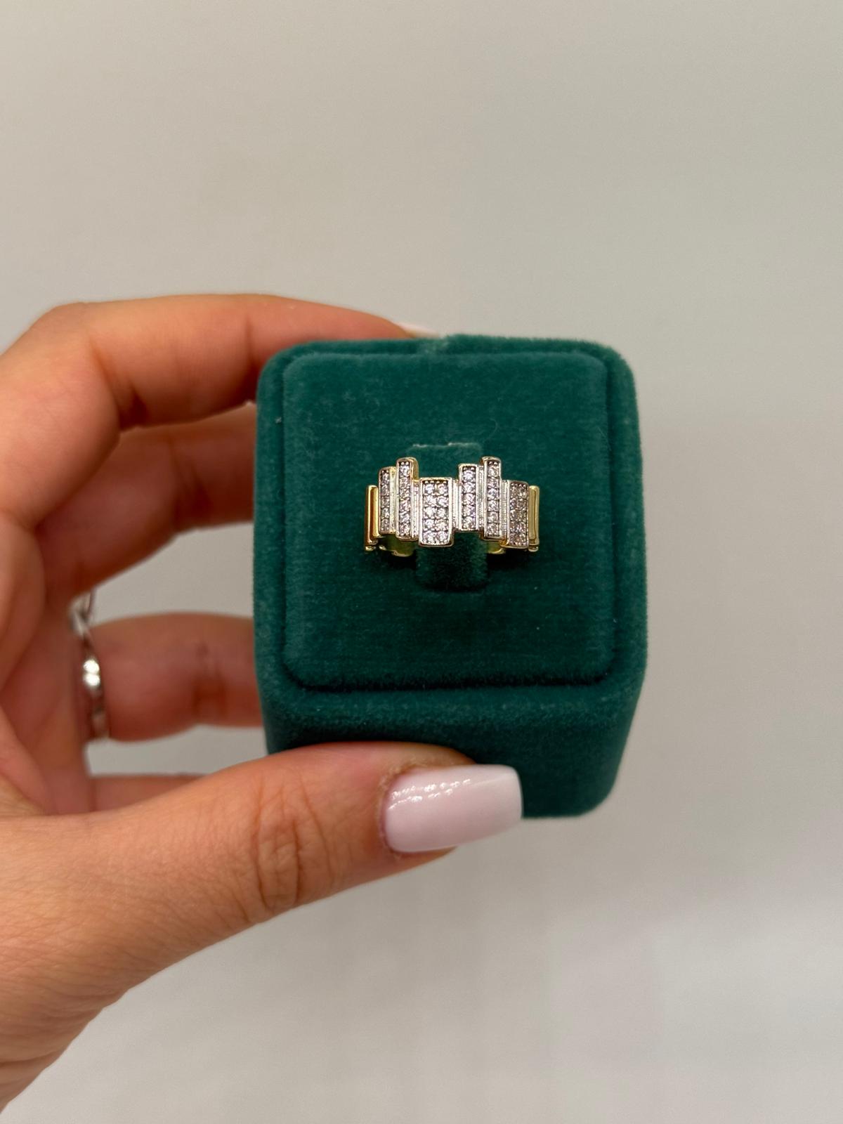 Geometrik formlardan ilham alan bu yüzük, sıralı taş detaylarıyla modern ve iddialı bir şıklık sunar. Parlak altın tonlu yüzeyi ve özenle yerleştirilmiş taşları sayesinde ışığı güçlü bir şekilde yansıtır.