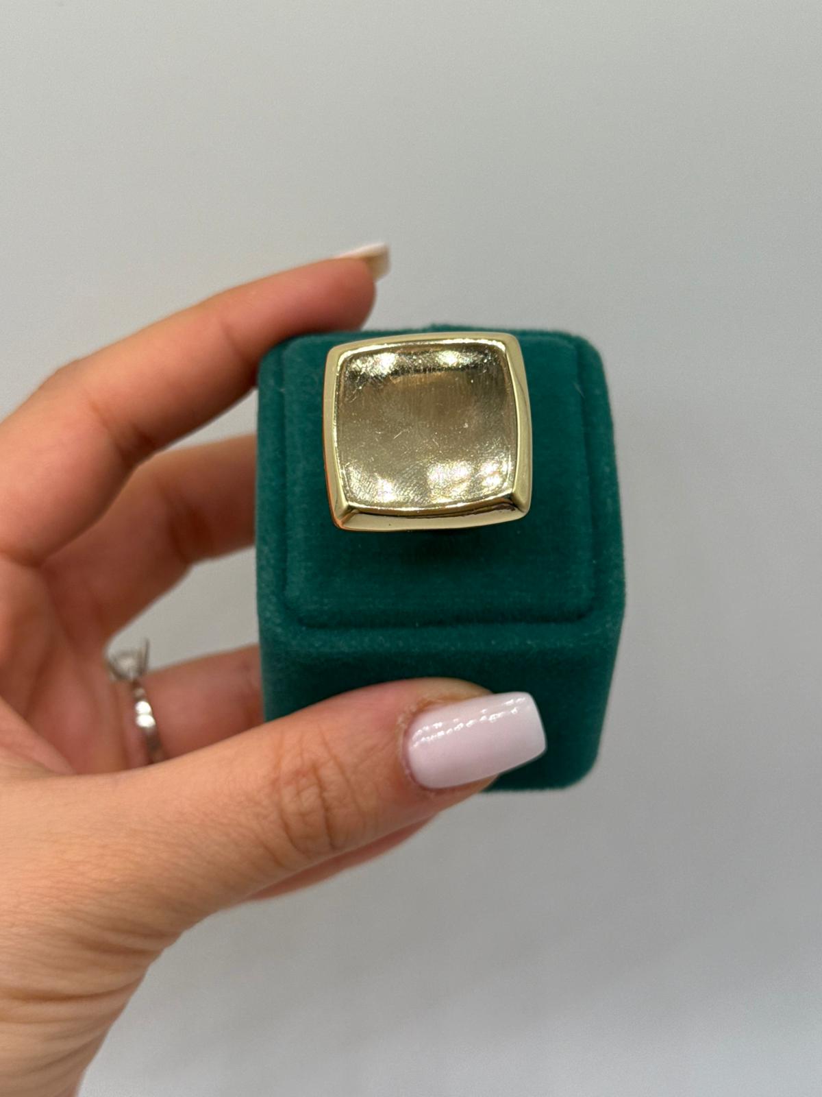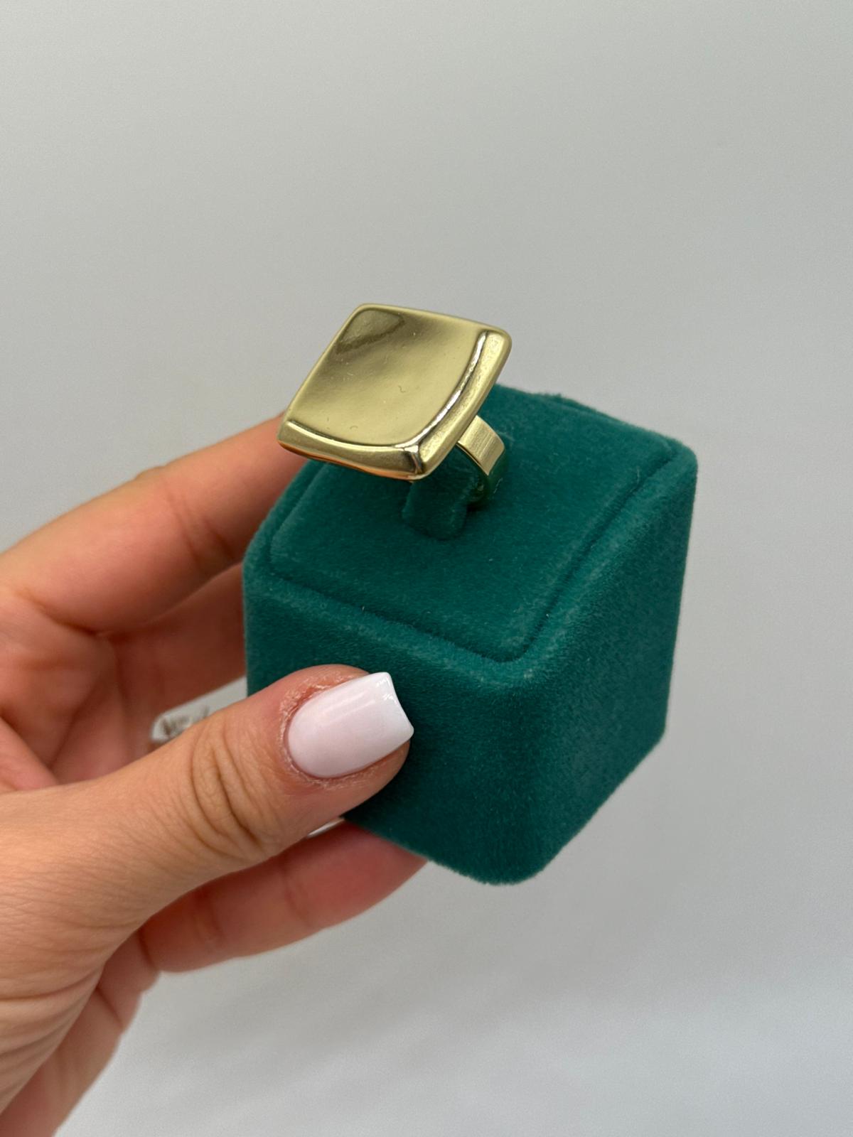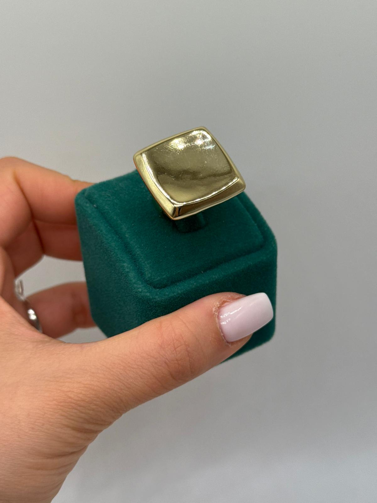 Kare formu ve parlak gold kaplamasıyla tasarlanan bu yüzük, sade ama güçlü bir stil sunar. Düz yüzeyi ve net hatları sayesinde modern ve zamansız bir görünüm kazandırır.