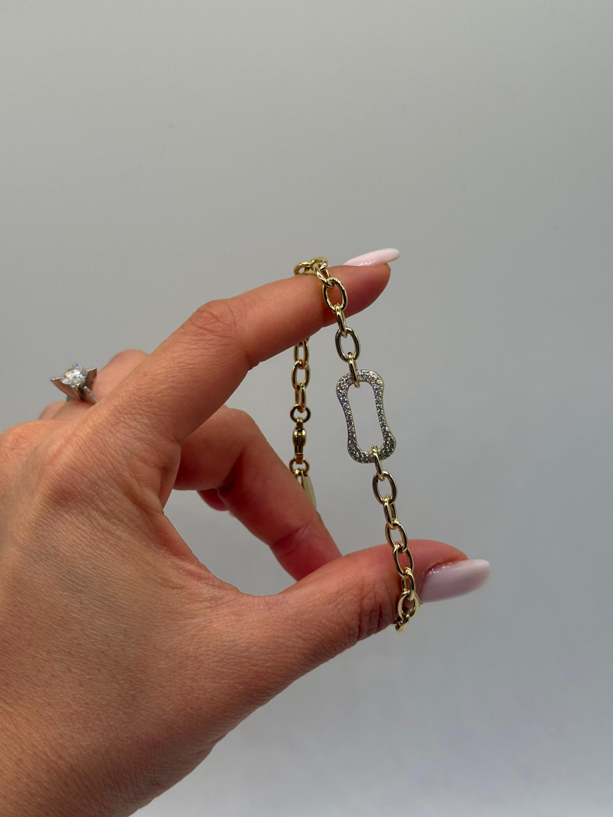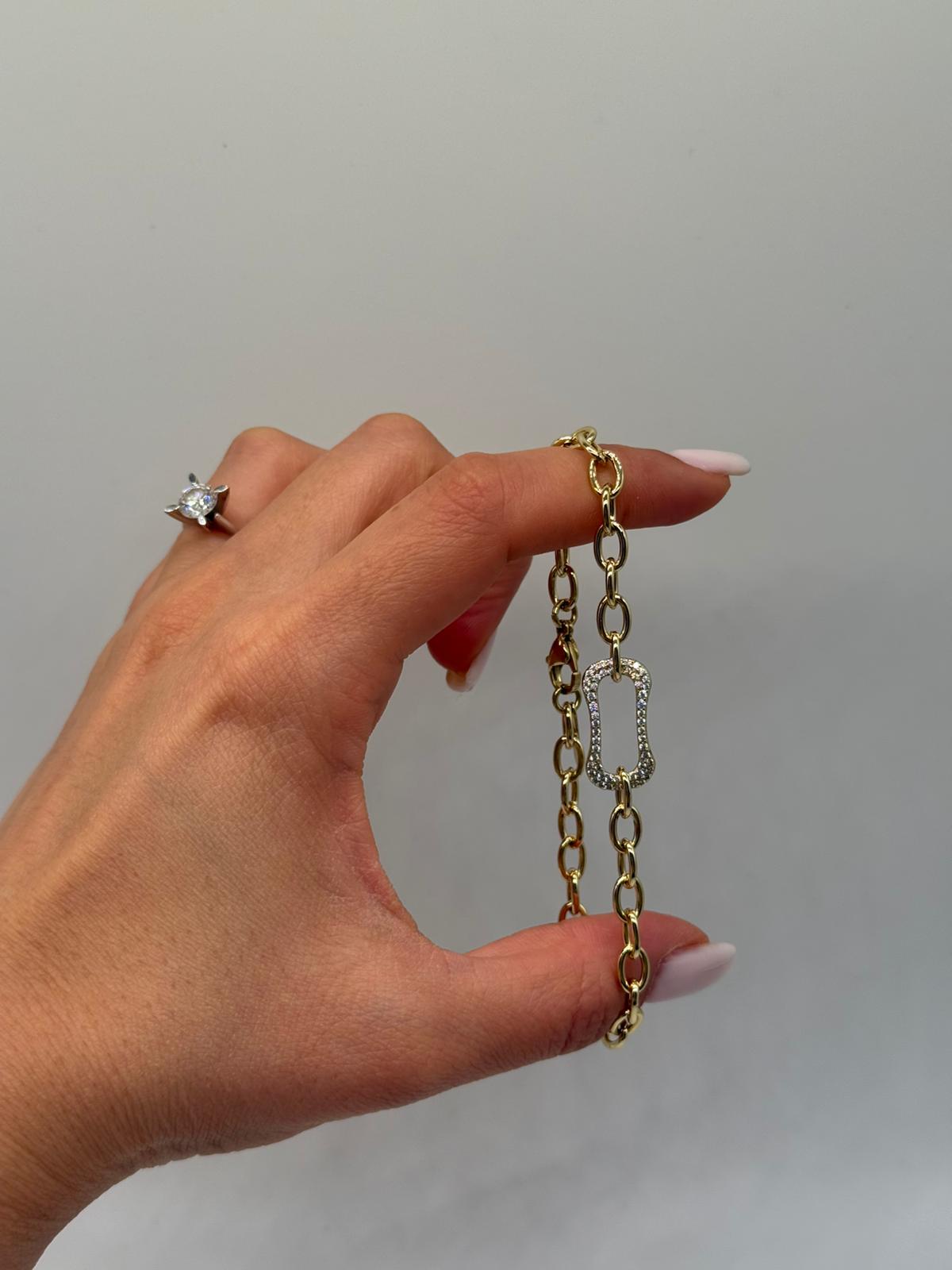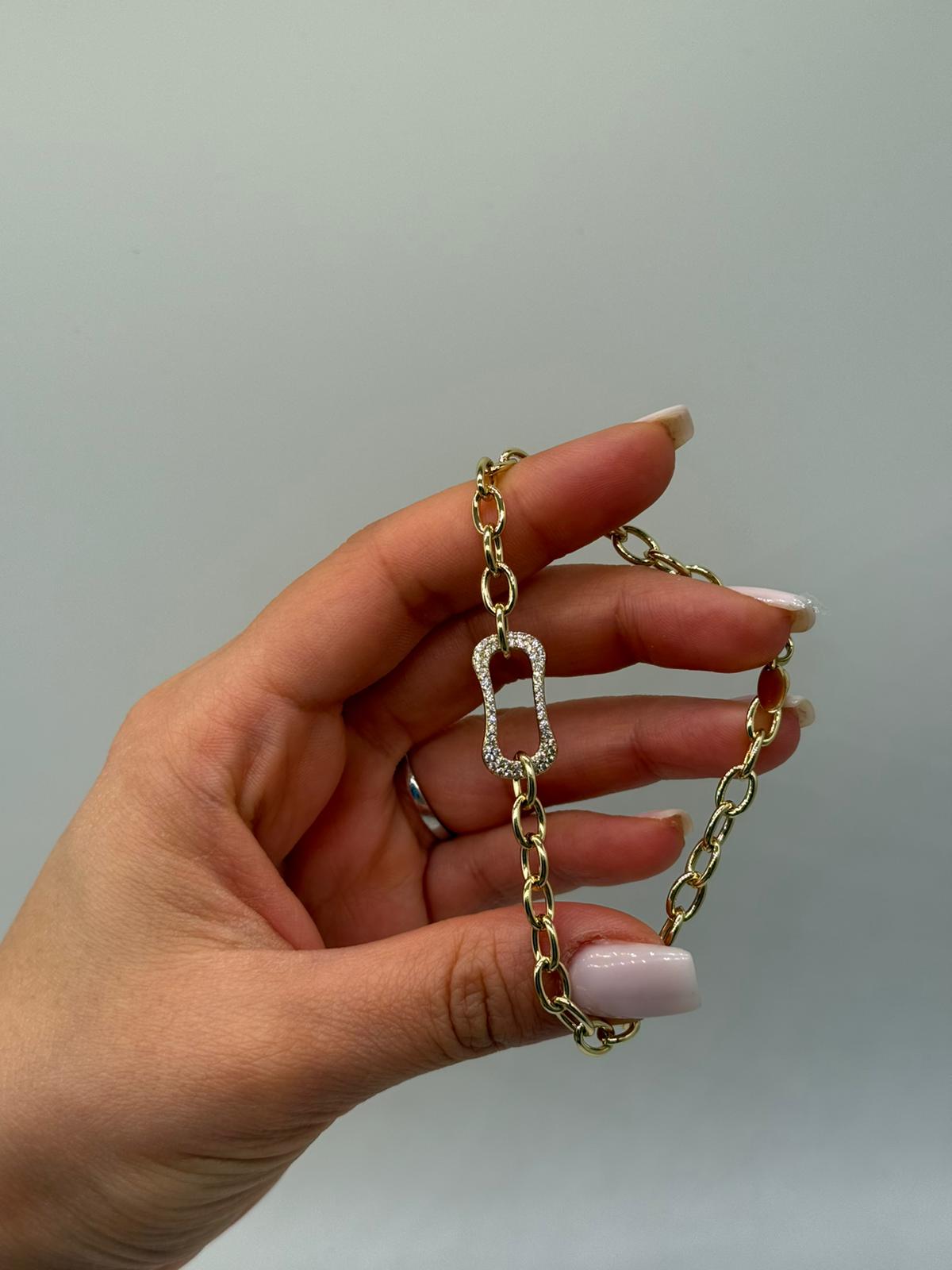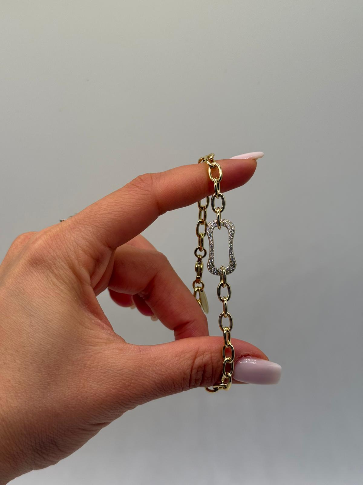 Zarif zincir yapısının merkezinde yer alan zirkon taşlarla çevrili oval form detayıyla tasarlanan bu kadın bileklik, sade şıklığı öne çıkaran modern bir tasarıma sahiptir. İnce zincir formu sayesinde bilekte hafif ve dengeli bir duruş sunar.