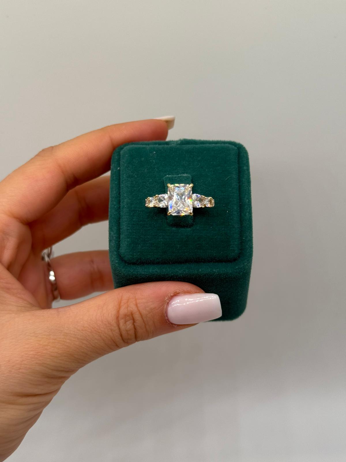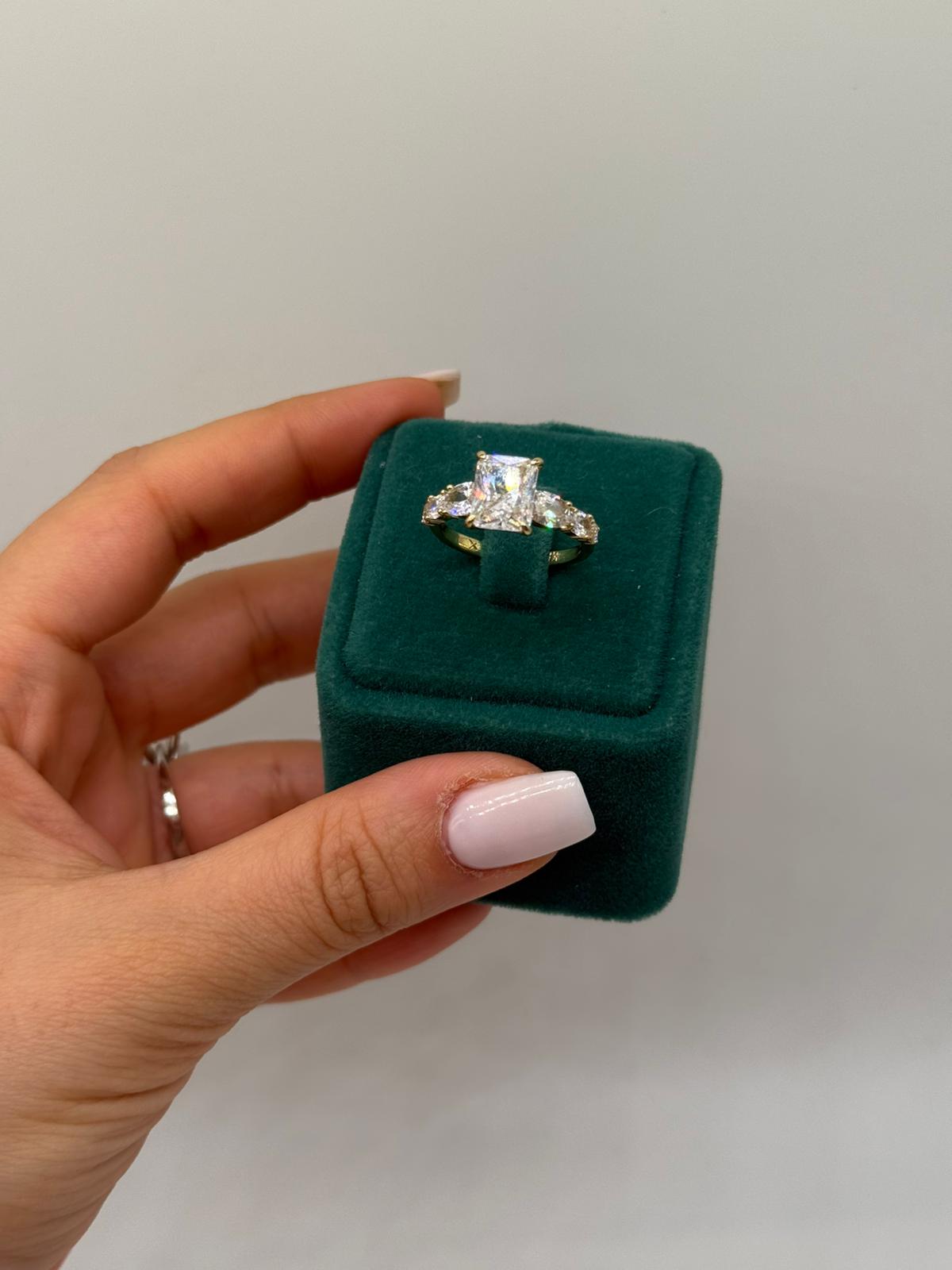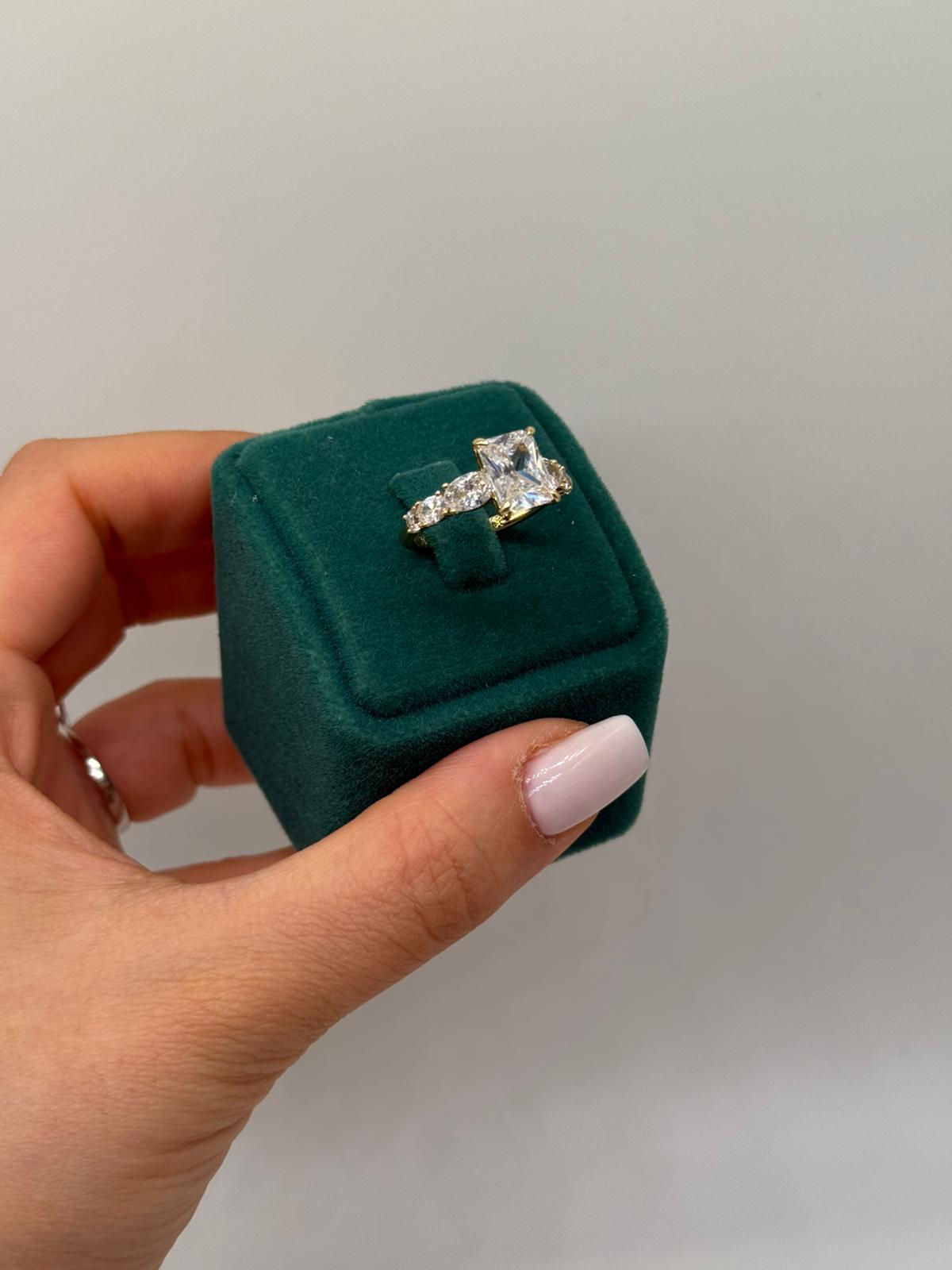 Merkezinde kare kesim büyük taşı bulunan bu yüzük, yan kısımlarındaki ışıltılı taş detaylarıyla göz alıcı bir şıklık sunar. Dengeli ve zarif tasarımı sayesinde hem özel günlerde hem de şık kombinlerde rahatlıkla kullanılabilir.
