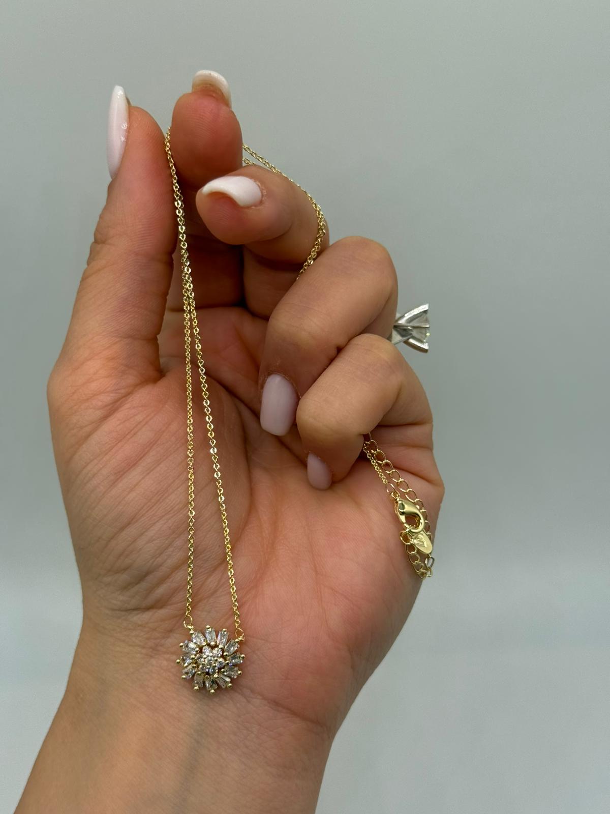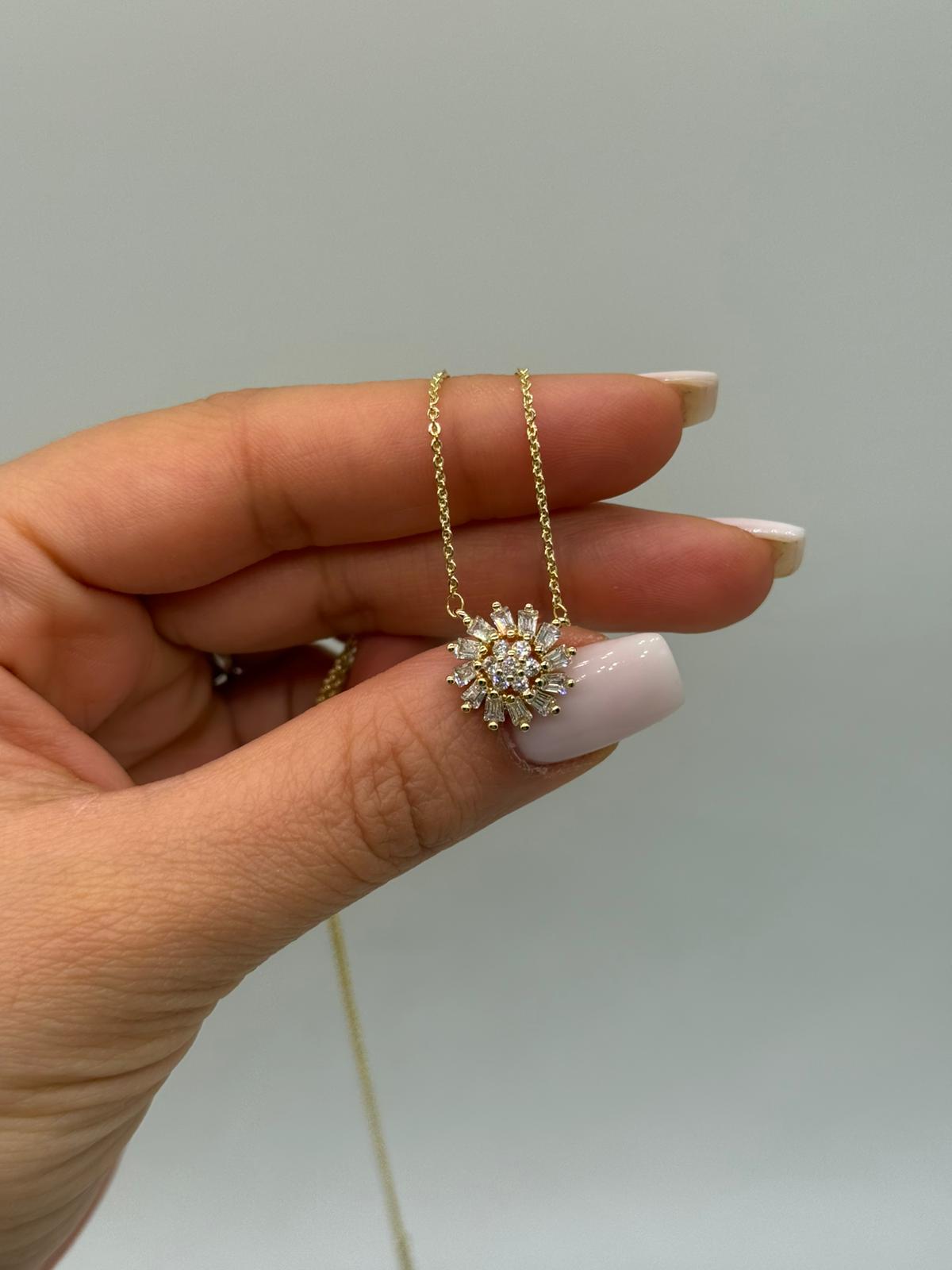 Altın renk kaplamalı bu çiçek form kolye, merkezden yayılan ışıltılı taş detaylarıyla zarif ve dikkat çekici bir tasarım sunar. Güneşi andıran formu sayesinde kolyeye canlı ve feminen bir hava kazandırır.