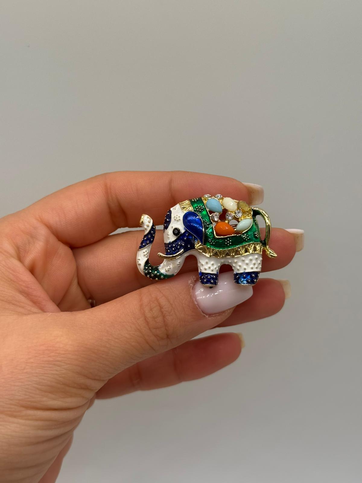 Uğur, bolluk ve gücün simgesi fil figüründen ilham alan bu özel broş, canlı renkleri ve detaylı işçiliğiyle dikkat çeker. Beyaz, lacivert ve yeşil tonlardaki mine detaylar; sırt kısmında yer alan renkli taş süslemeleri ile birleşerek ürüne neşeli ve şık bir görünüm kazandırır. Altın renk metal dokunuşlar tasarımı zarif bir şekilde tamamlar.