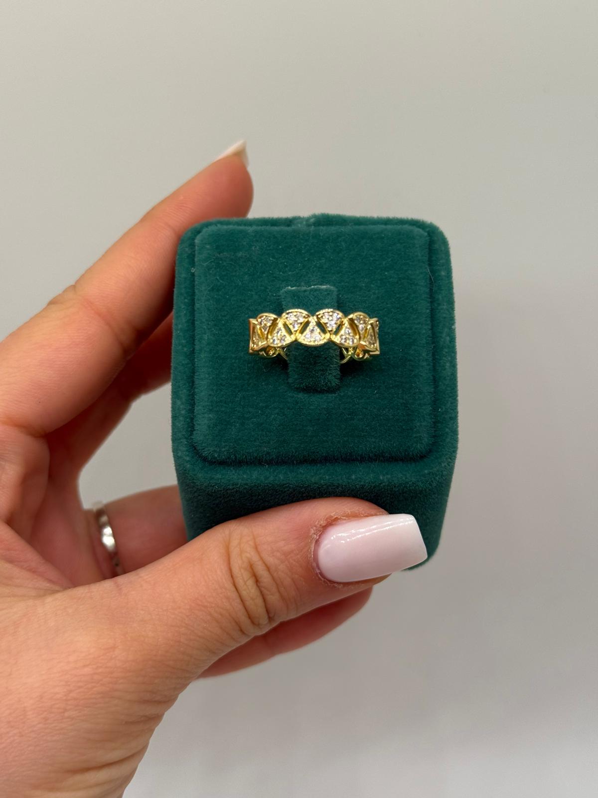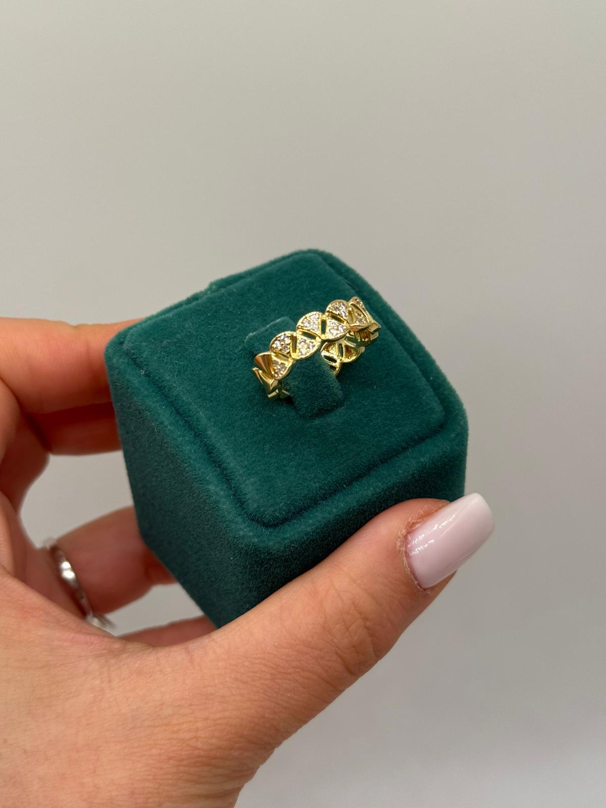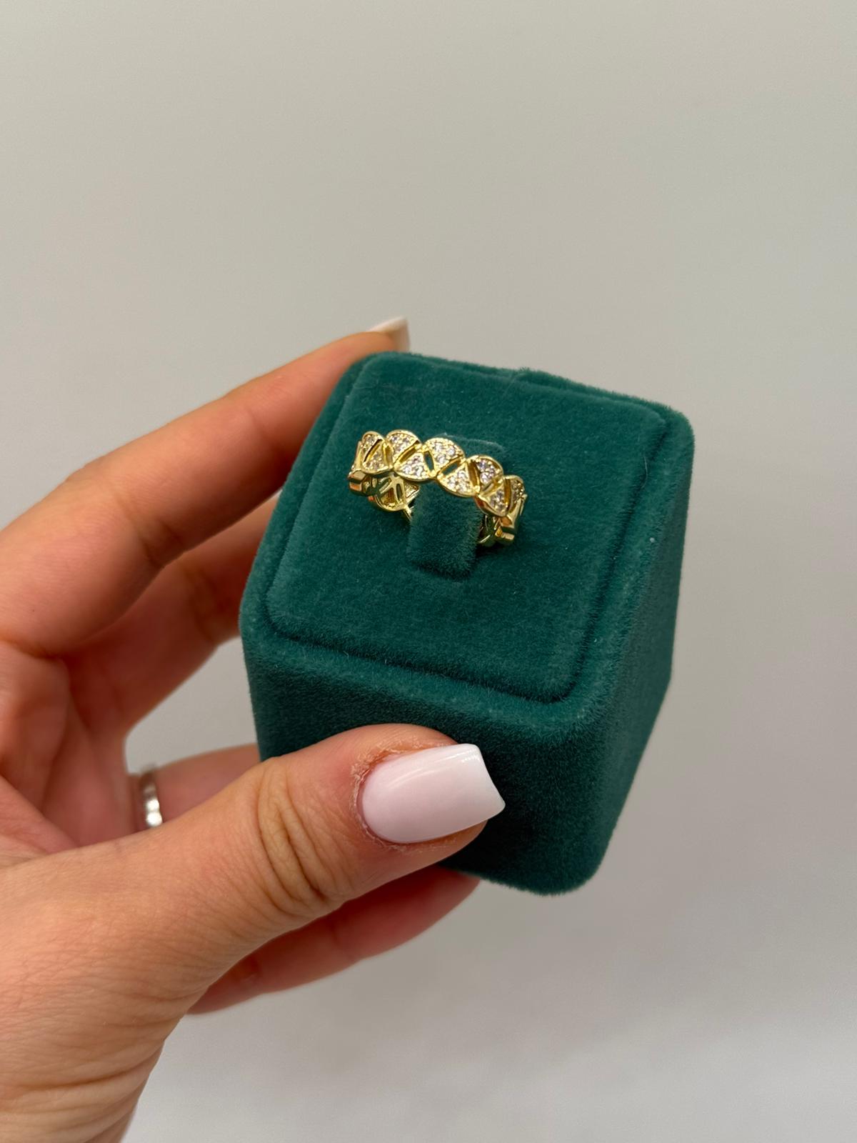 Kalp formundaki zincir detaylarıyla tasarlanan bu altın yüzük, zarif ve romantik bir şıklık sunar.