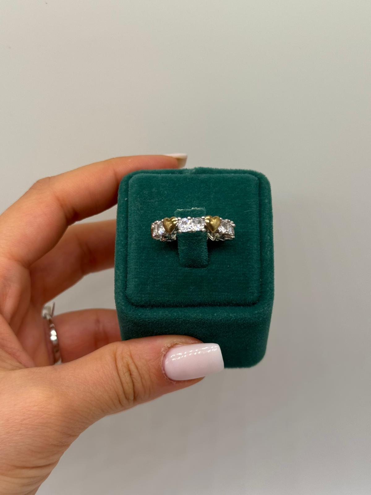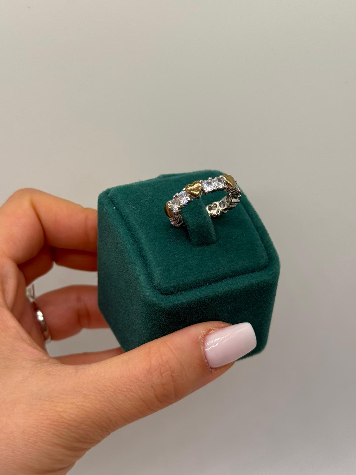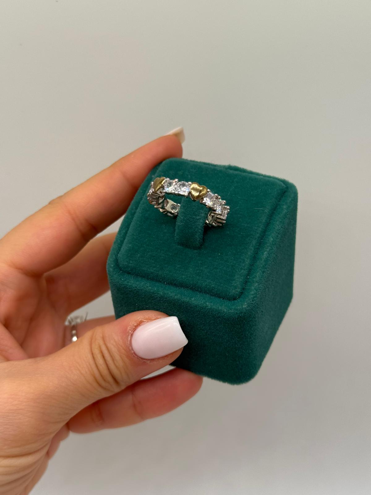 Kalp motifleri, yüzüğe duygusal ve şık bir anlam katarken, parlak taşlar tasarımı ön plana çıkarır. Günlük kombinlerde sade bir şıklık yaratmak ya da özel günlerde anlamlı bir aksesuar tercih etmek isteyenler için ideal bir parçadır.