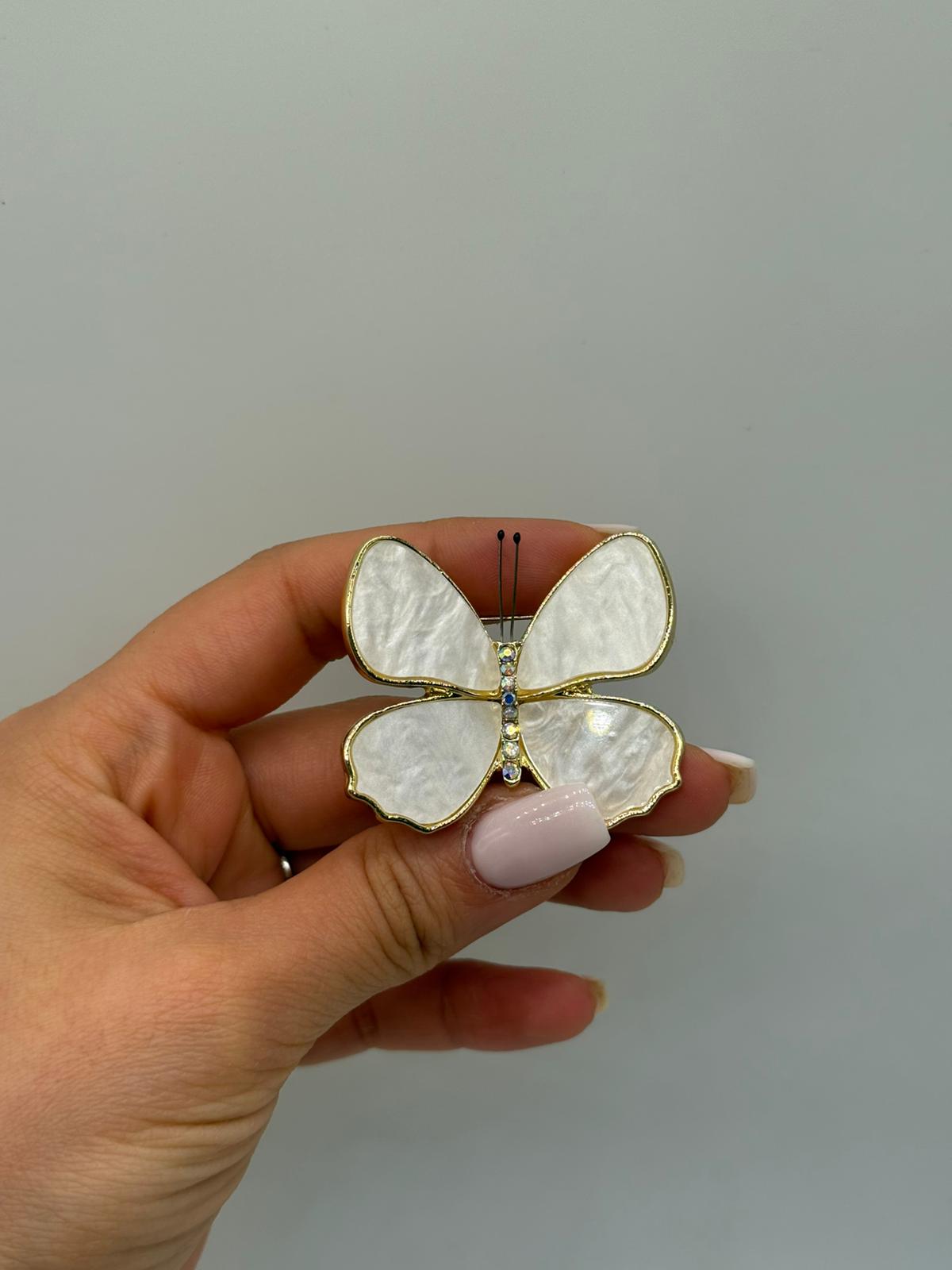 Zarafetin ve dönüşümün simgesi kelebek figürüyle tasarlanan bu özel broş, sedef görünümlü kanatları ve altın renk çerçevesiyle sade ama etkileyici bir şıklık sunar. Doğal sedef dokusunu andıran yüzeyi ışığa göre farklı yansımalar oluşturarak broşa sofistike bir görünüm kazandırır.