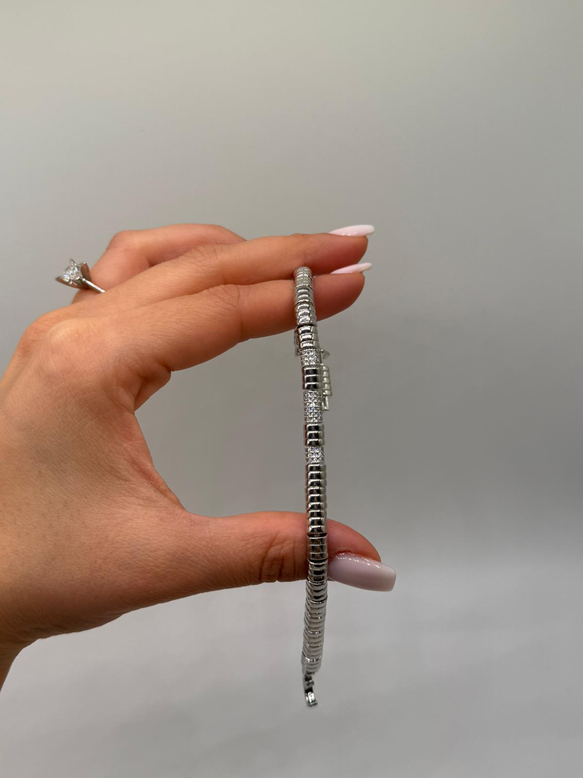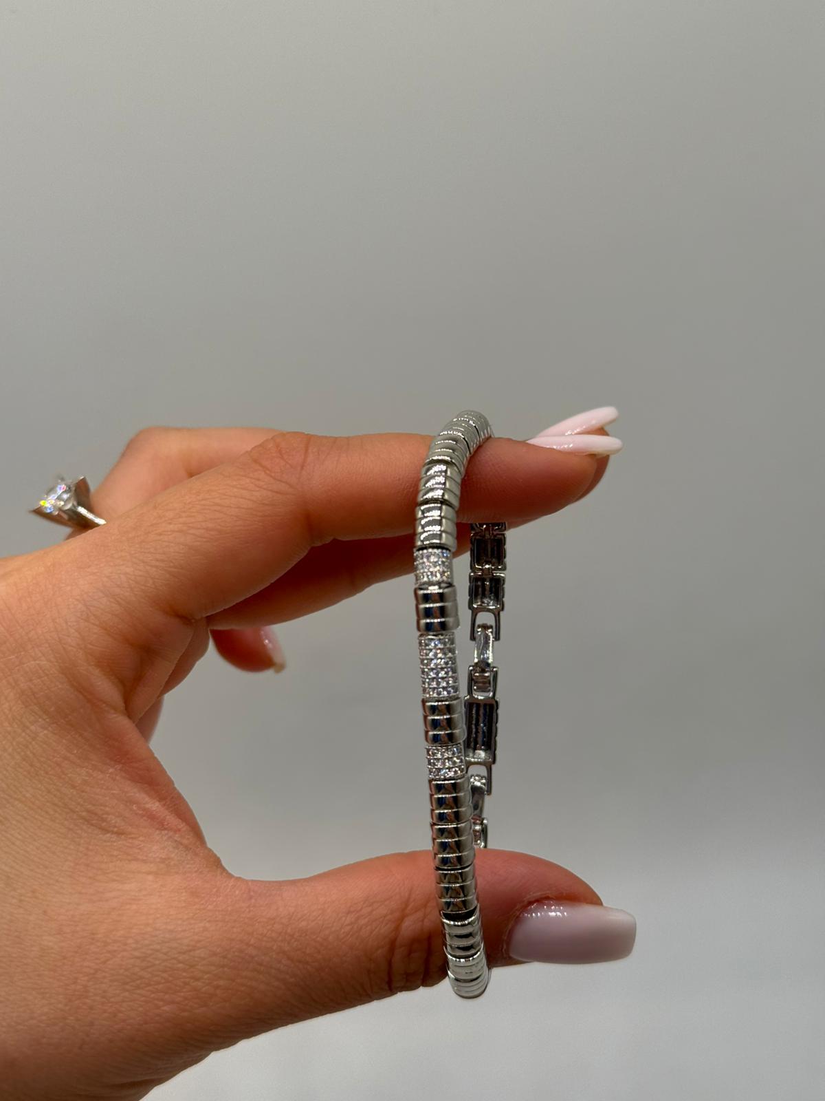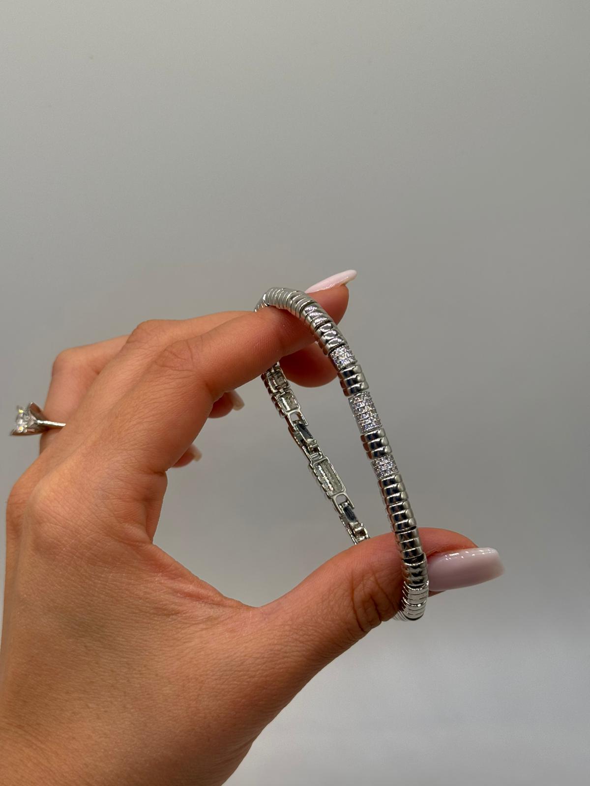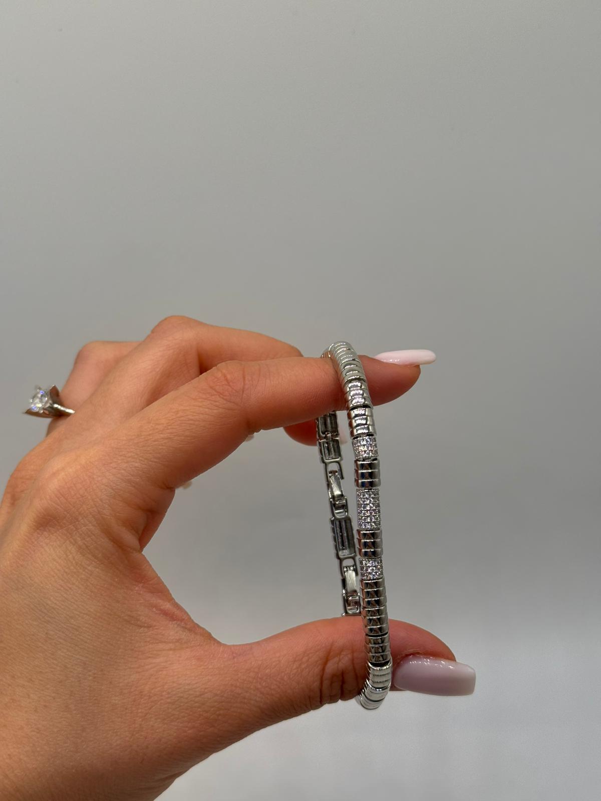 Modern silindir form detaylarıyla tasarlanan bu kadın bileklik, güçlü ve zarif bir duruşu bir arada sunar. Parlak yüzeylerle zirkon taşlı bölümlerin dengeli geçişi sayesinde bilekte sofistike bir görünüm oluşturur.