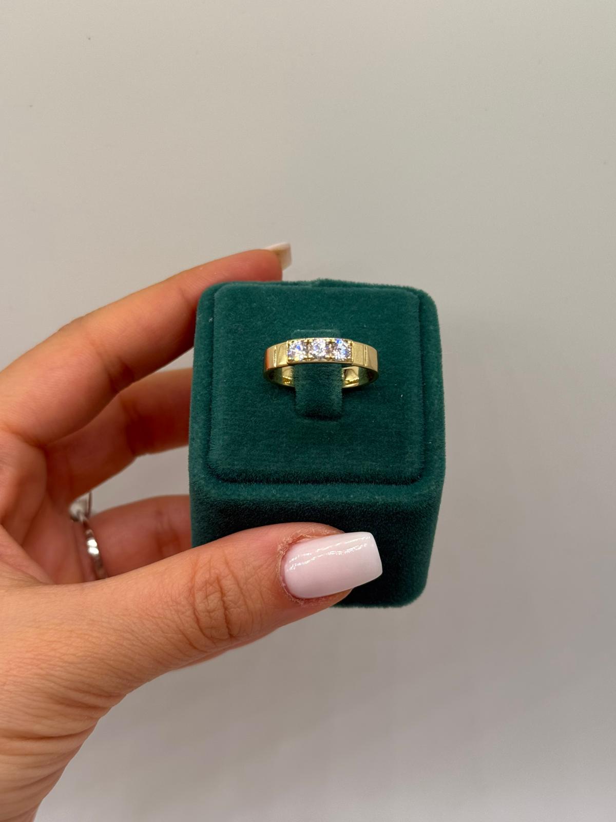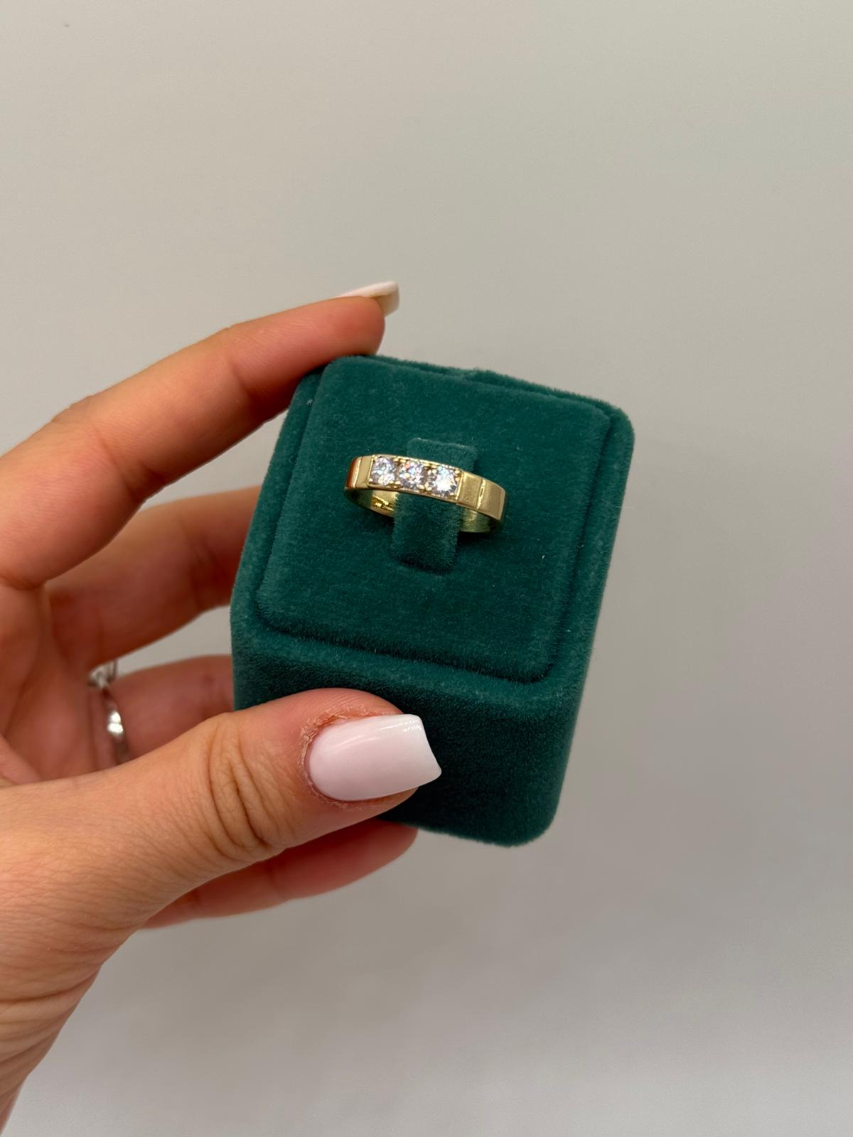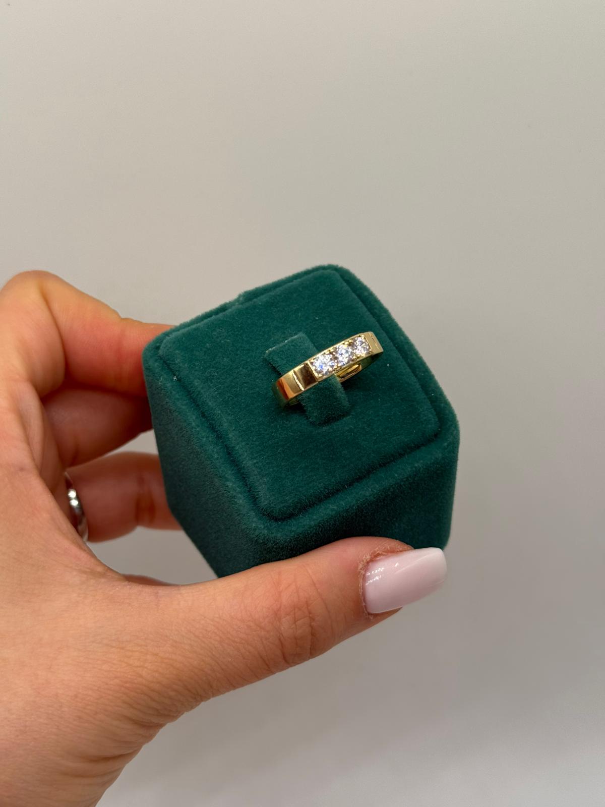 Xuping altın renk kaplamalı bu yüzük, ortasında yer alan ışıltılı taş şerit detayıyla klasik ve zarif bir görünüm sunar. Düz bant formu sayesinde parmakta konforlu bir duruş sağlarken, sade tasarımıyla günlük kullanıma son derece uygundur.