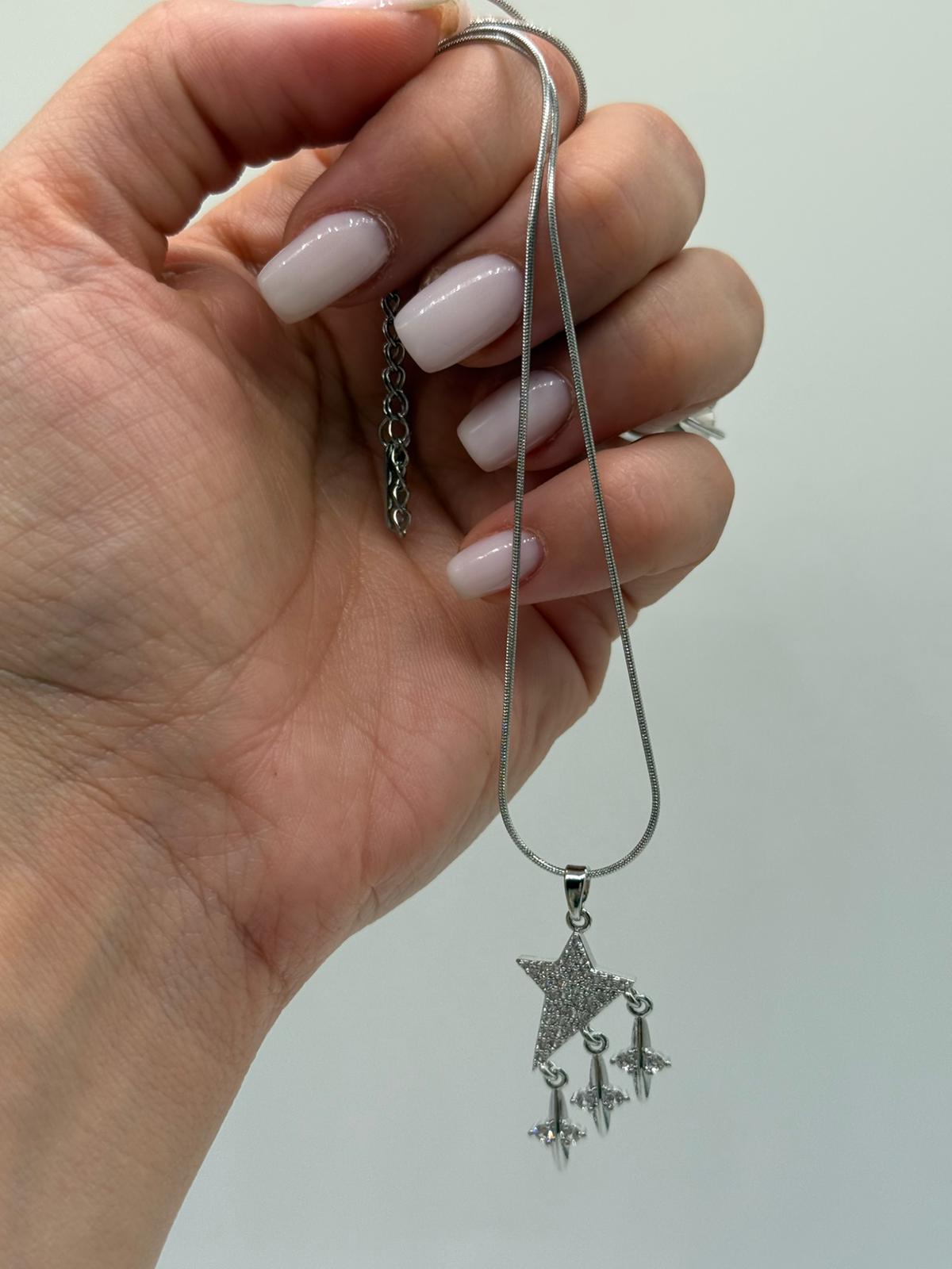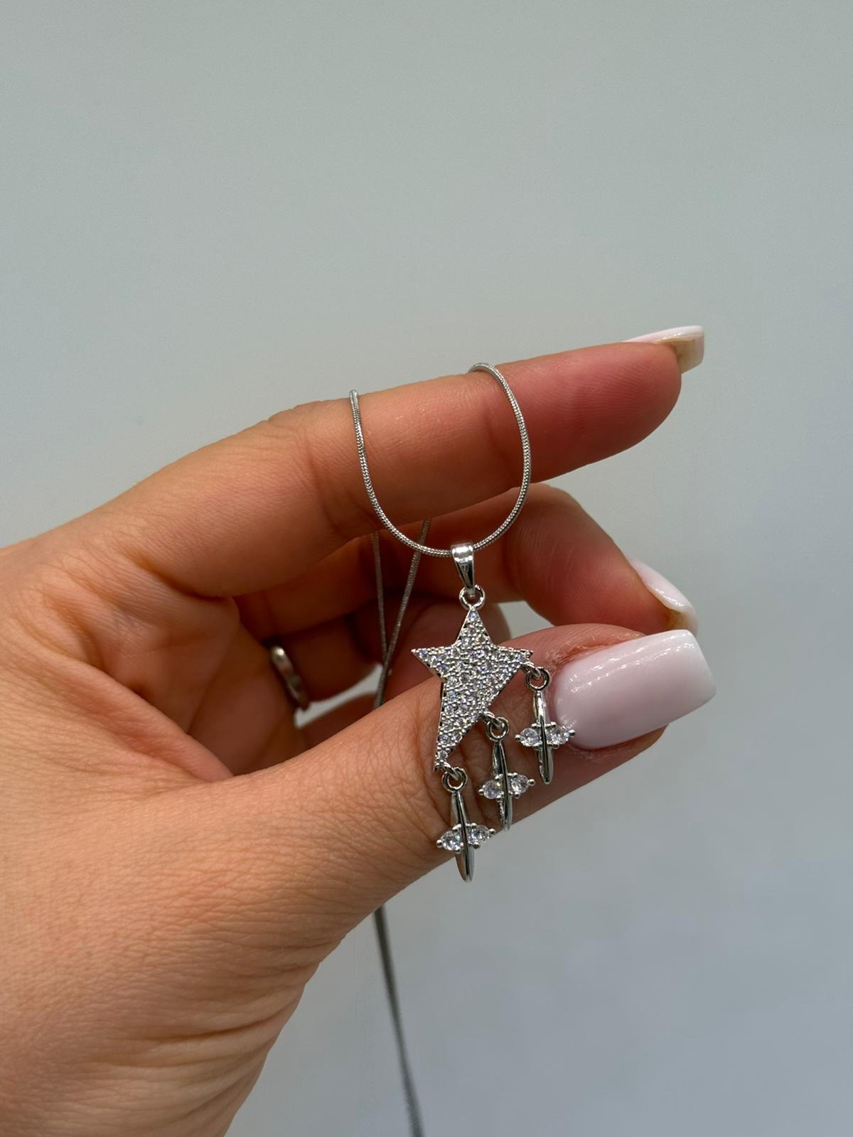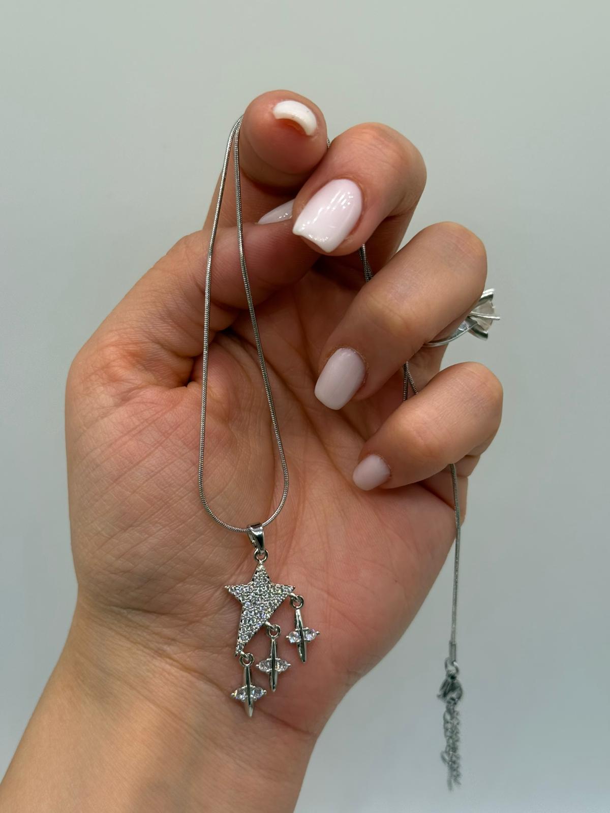 Gecenin ışıltısını yansıtan yıldız figürlü bu zarif kolye, hareketli sallantı detaylarıyla modern ve dikkat çekici bir görünüm sunar. Tamamı taşlarla süslenmiş yıldız formu, alt kısmındaki ince damla figürleriyle birlikte kolyeye akıcı ve feminen bir hava katar. Gümüş renk kaplaması sayesinde hem günlük kombinlerde hem de özel anlarda şıklığınızı tamamlar.