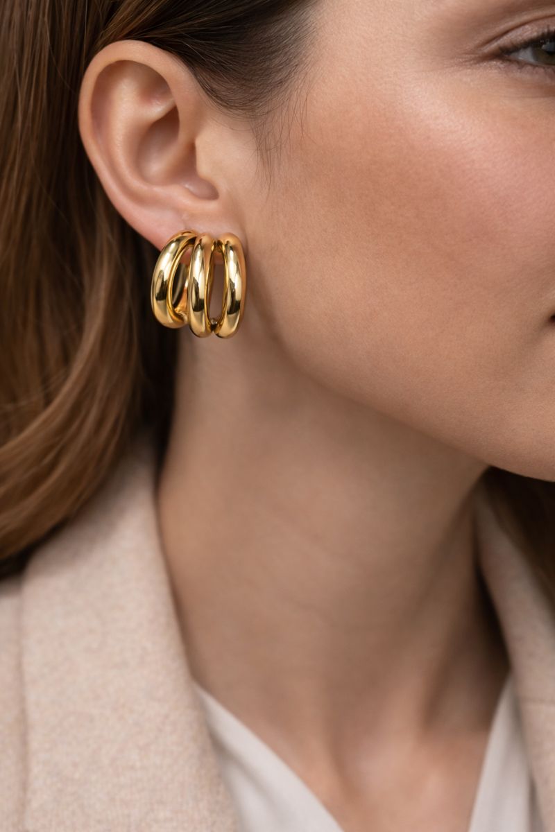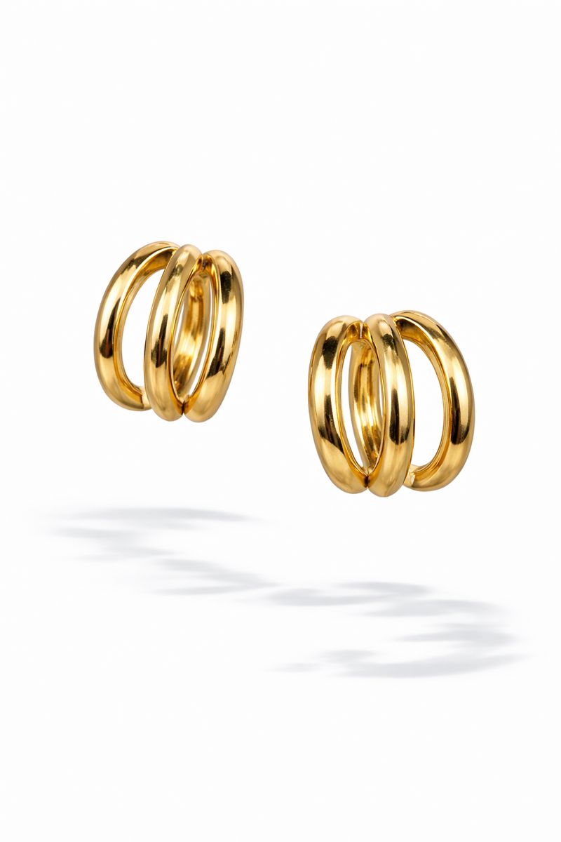 Üçlü Halka Form VIP Çelik Küpe, minimal tasarımıyla modern ve güçlü bir stil sunar. Birbirine paralel üç halka detayı, kulağa hacimli ama dengeli bir görünüm kazandırır. Parlak altın ton kaplaması sayesinde her kombine kolayca uyum sağlar.