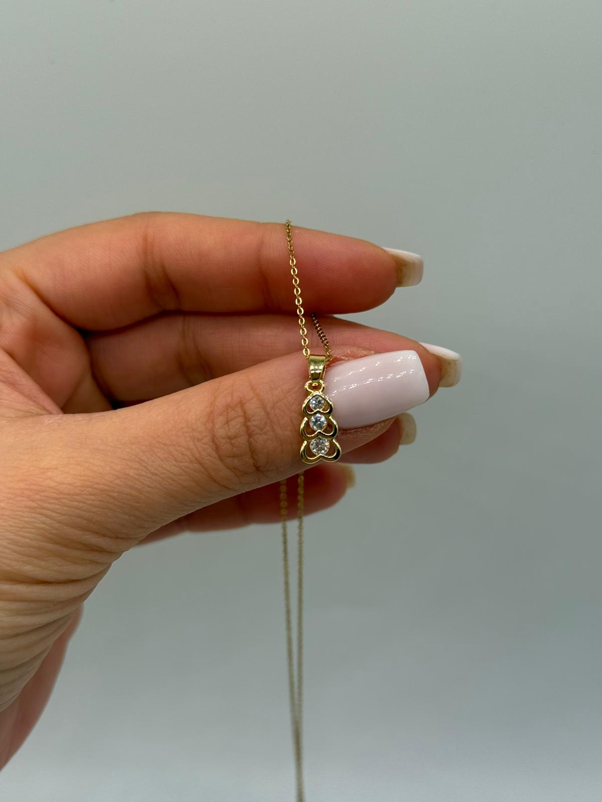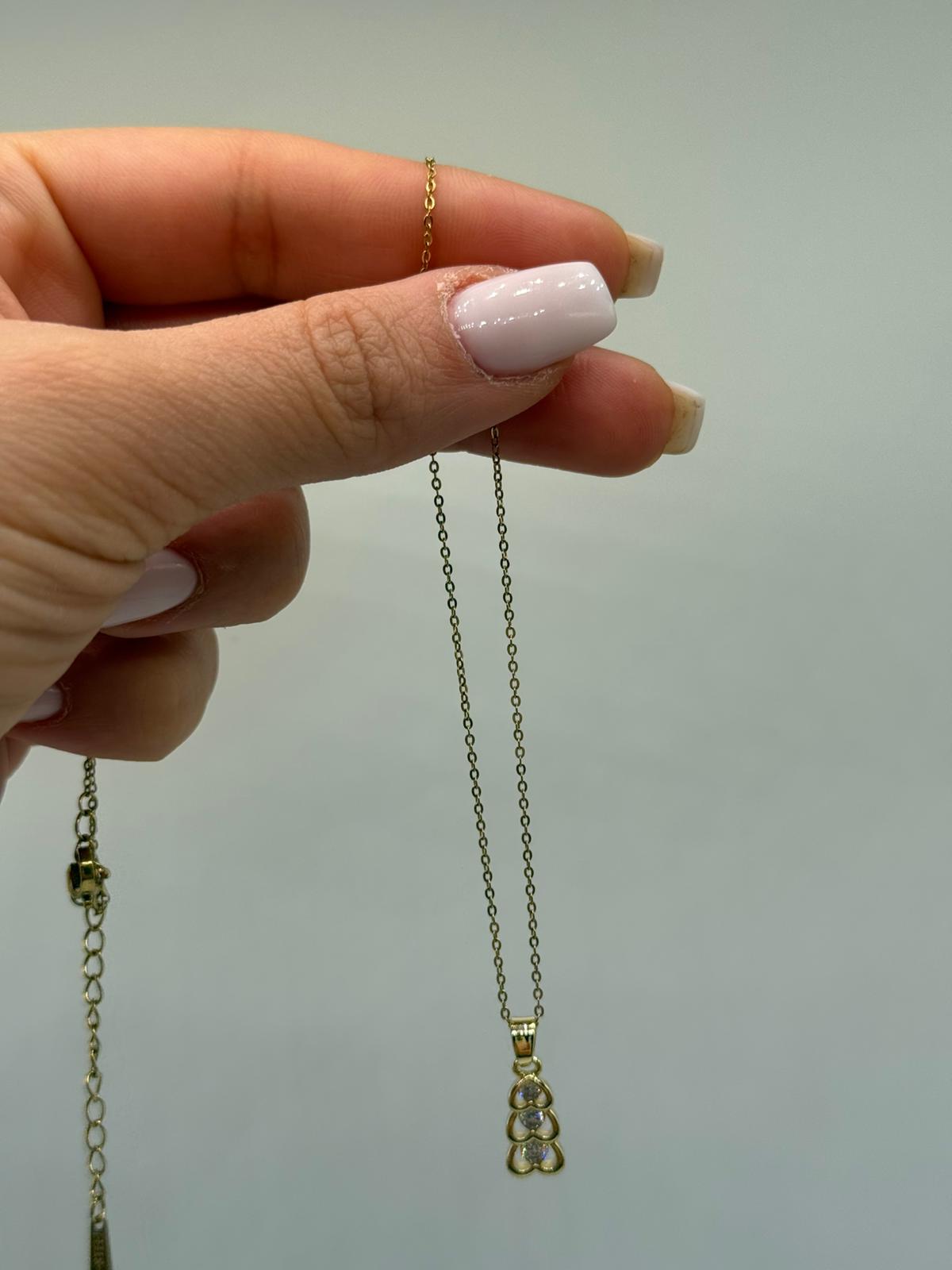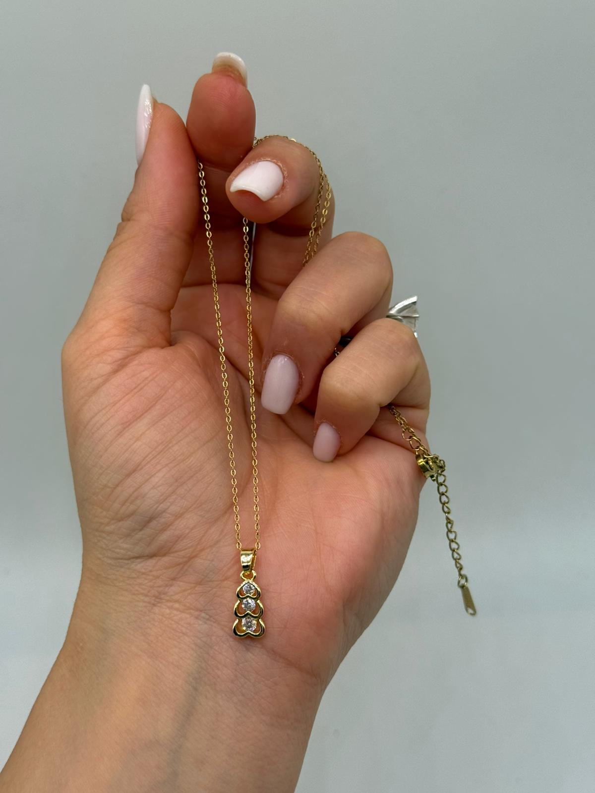 Altın renk kaplamalı bu zarif kolye, üst üste dizilmiş üç kalp figürü ile romantik ve şık bir görünüm sunar. Orta kısmında yer alan taş detayı, kolyeye ince bir ışıltı katarak sadeliği şıklıkla buluşturur.