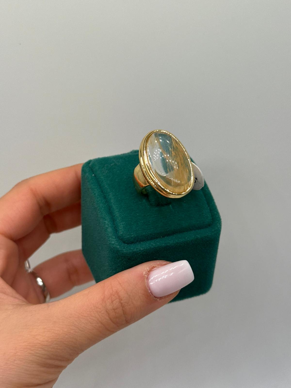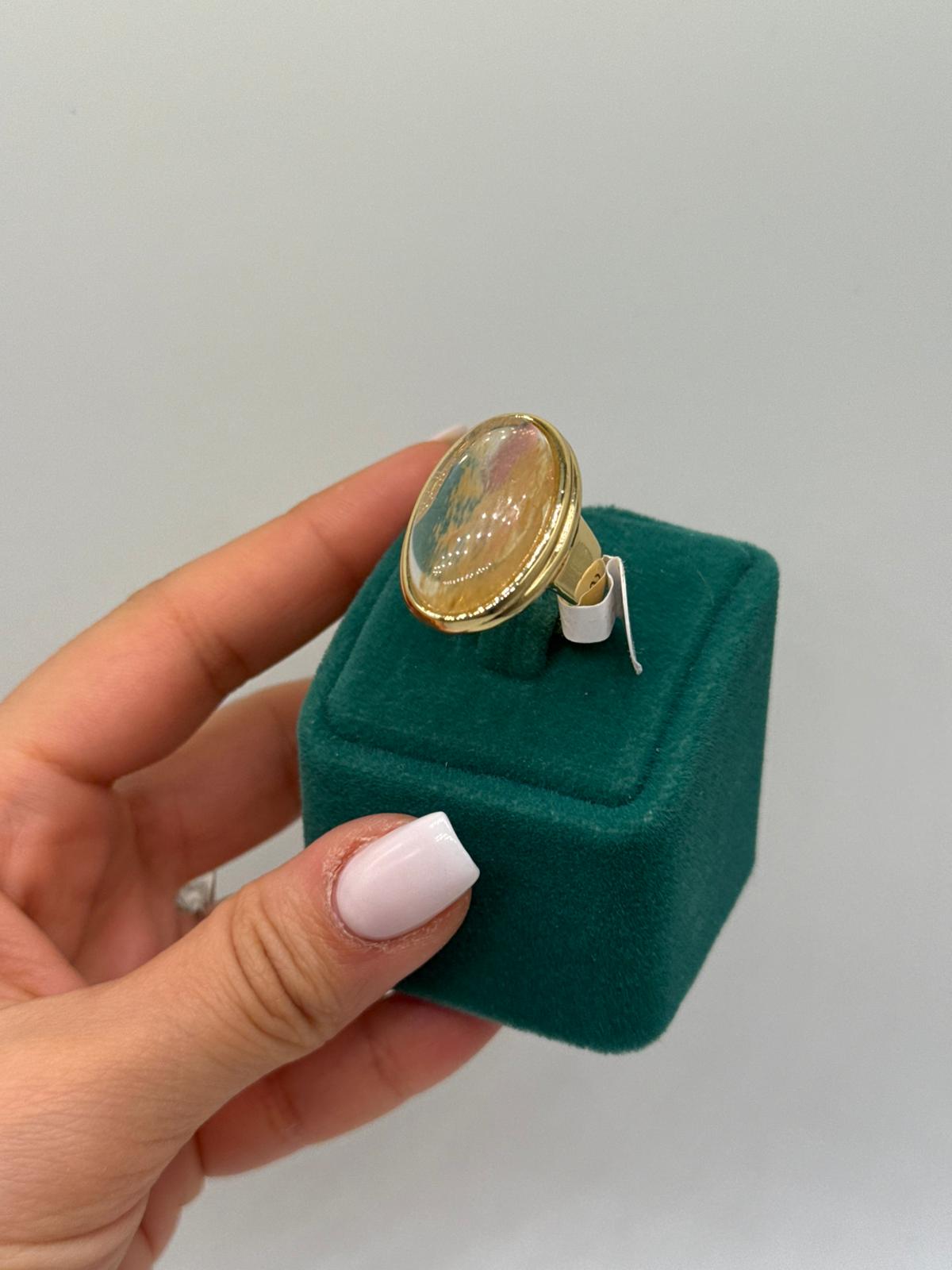 Oval formu ve doğal desenli cam detayıyla dikkat çeken bu gold yüzük, klasik zarafeti modern bir yorumla buluşturur. Işığa göre değişen yüzey dokusu sayesinde her açıdan farklı bir görünüm sunar ve yüzüğe özgün bir karakter kazandırır.