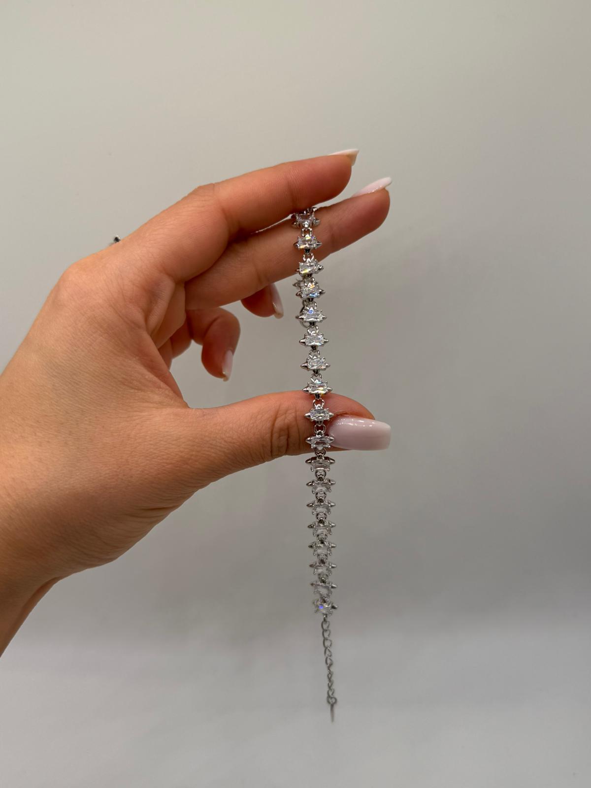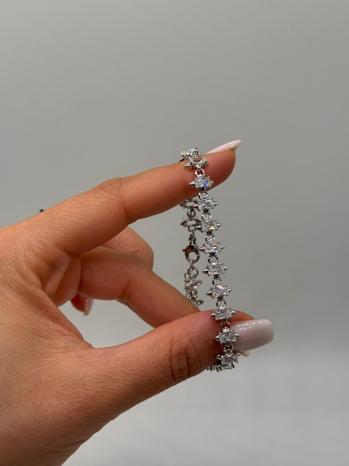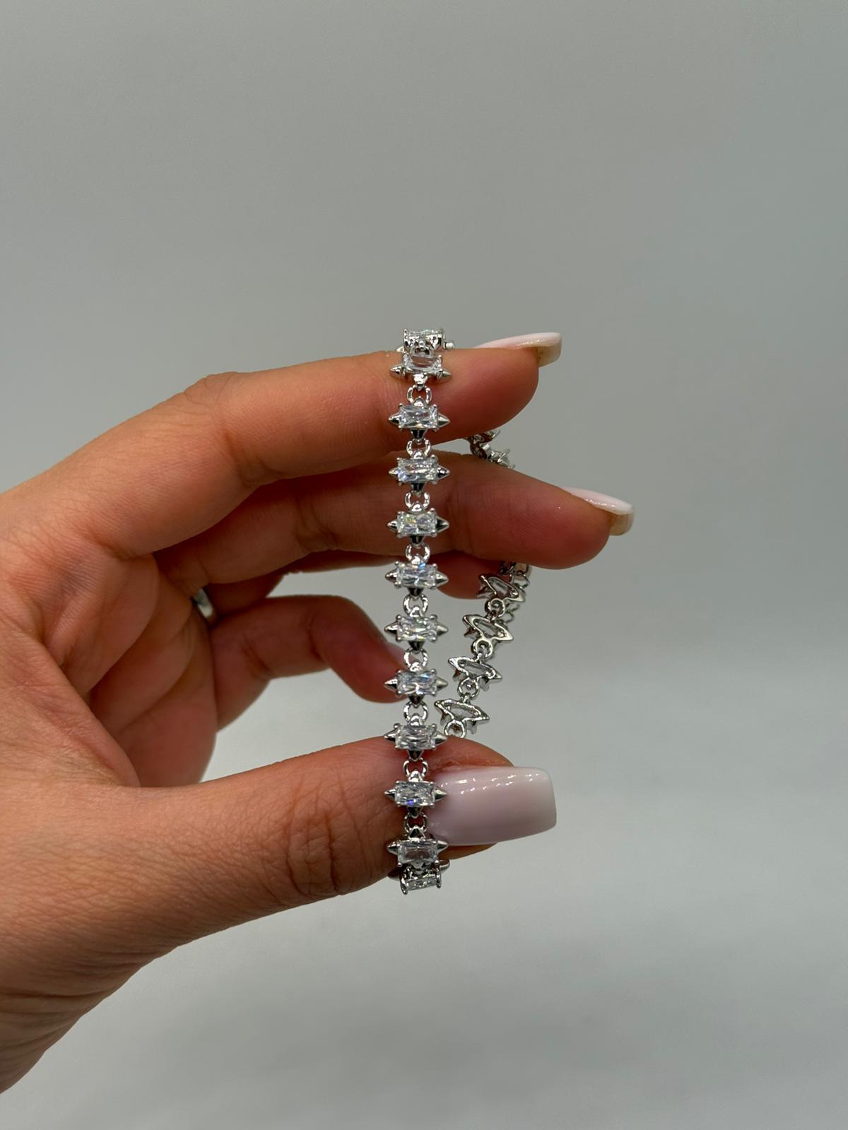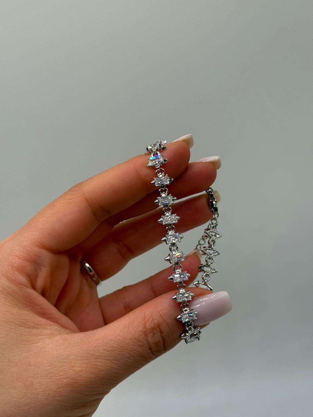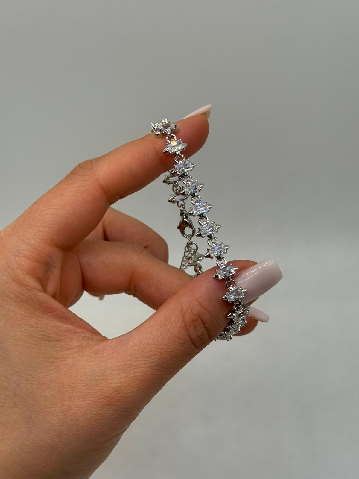 Modern şıklığı ön plana çıkaran bu VIP çelik bileklik, baget kesim taşların ardışık dizilimiyle sofistike bir görünüm sunar. Net hatlara sahip taş formu, bilekte dikkat çekici ve lüks bir duruş oluşturur.