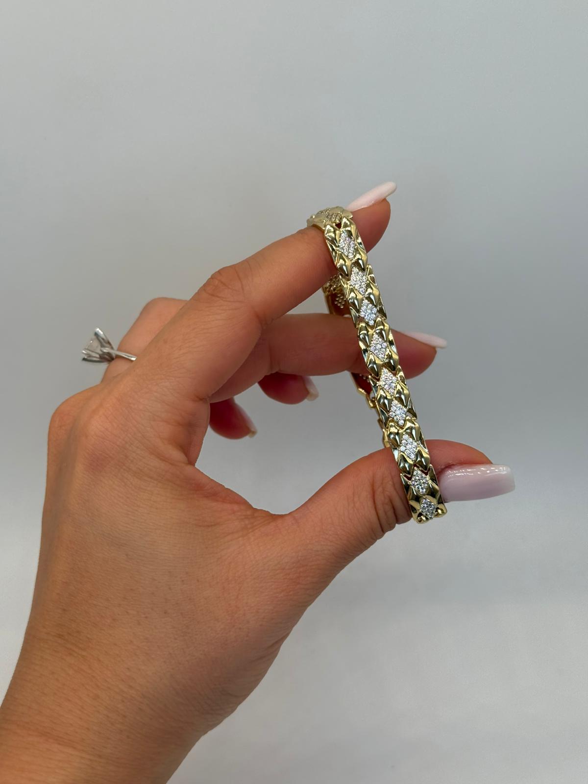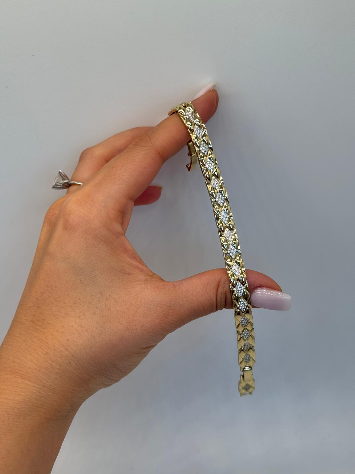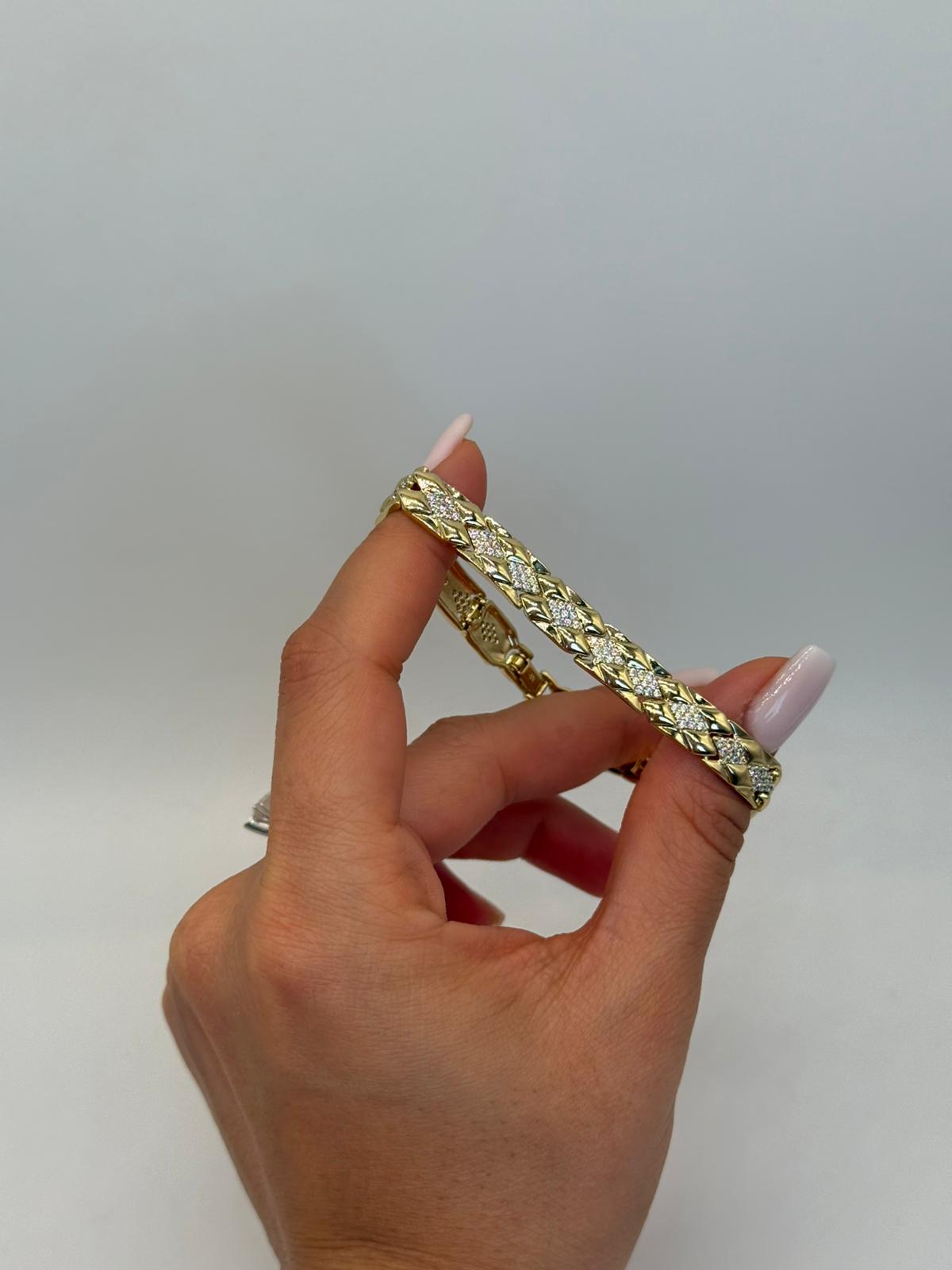 Güçlü zincir formu ile zarif baget taş detaylarını bir araya getiren bu bileklik, klasik şıklığı modern bir yorumla sunar. Altın renk kaplama yapısı, bileklik boyunca yer alan baget kesim taşlarla dengeli bir ışıltı sağlar. Özenle işlenmiş zincir formu sayesinde bilekte tok ve şık bir duruş sergiler. Günlük kullanımdan özel davet kombinlerine kadar geniş bir kullanım alanı sunan bu model, stiline iddialı ama zarif bir dokunuş katmak isteyenler için ideal bir seçenektir.