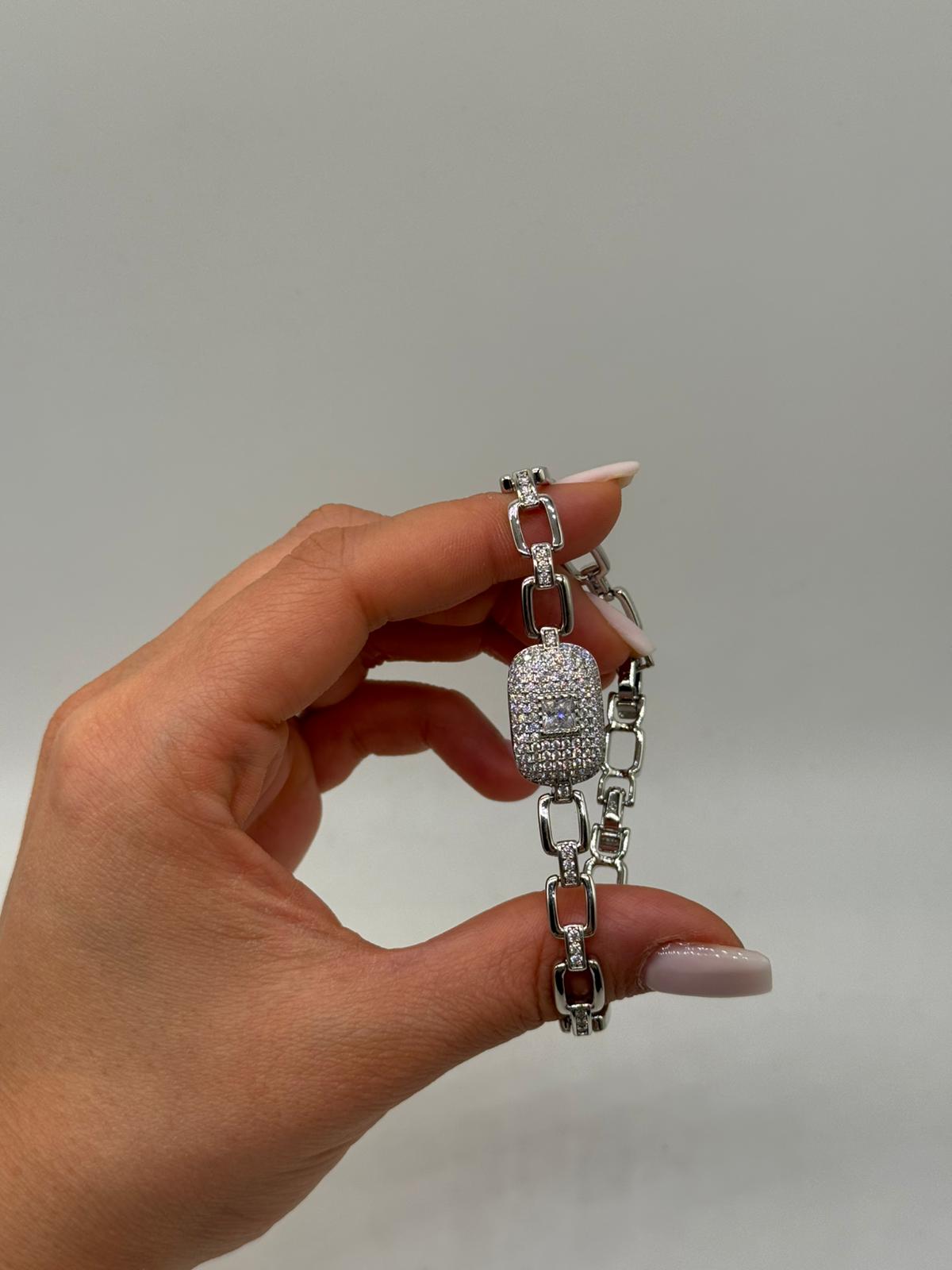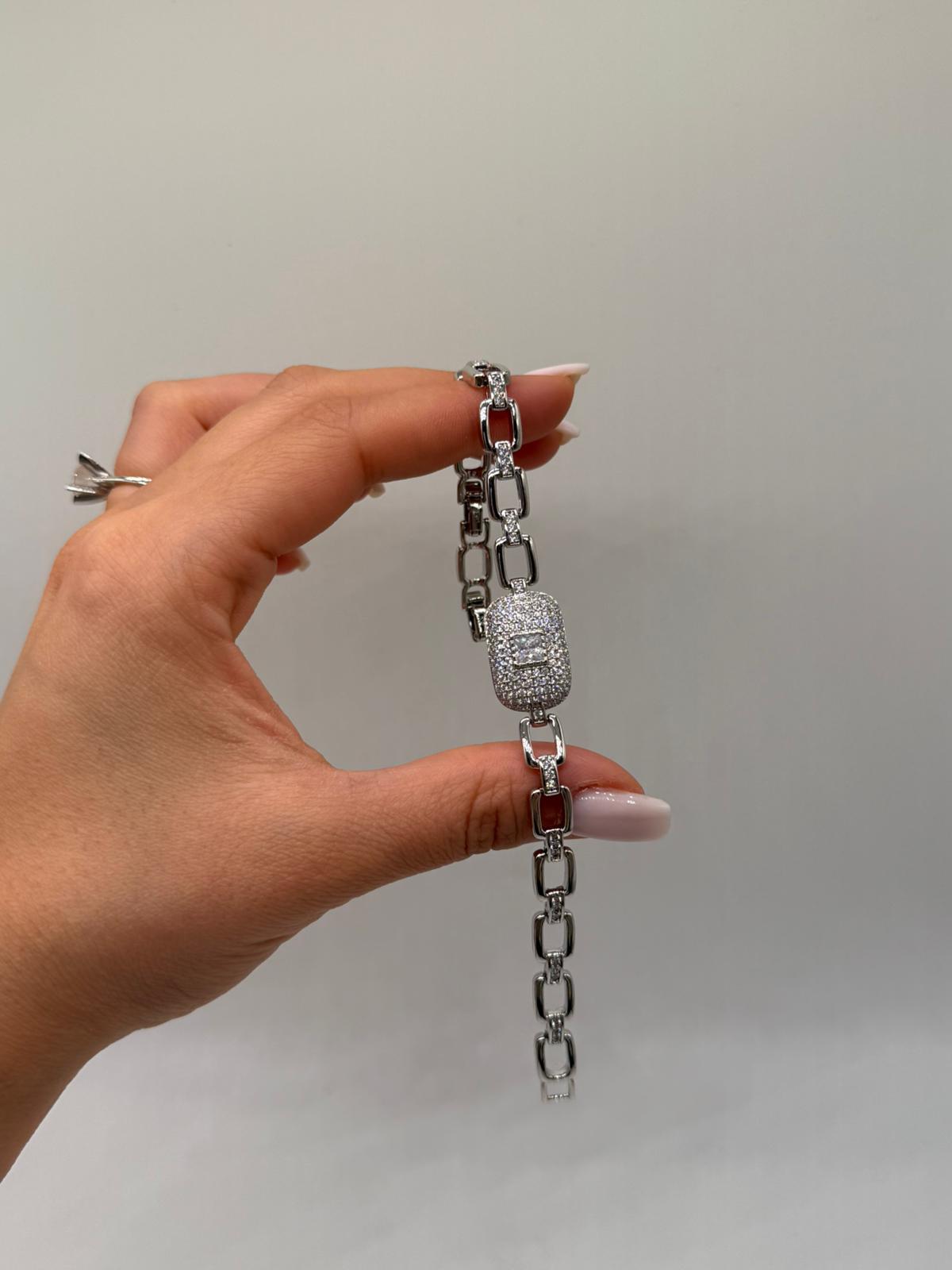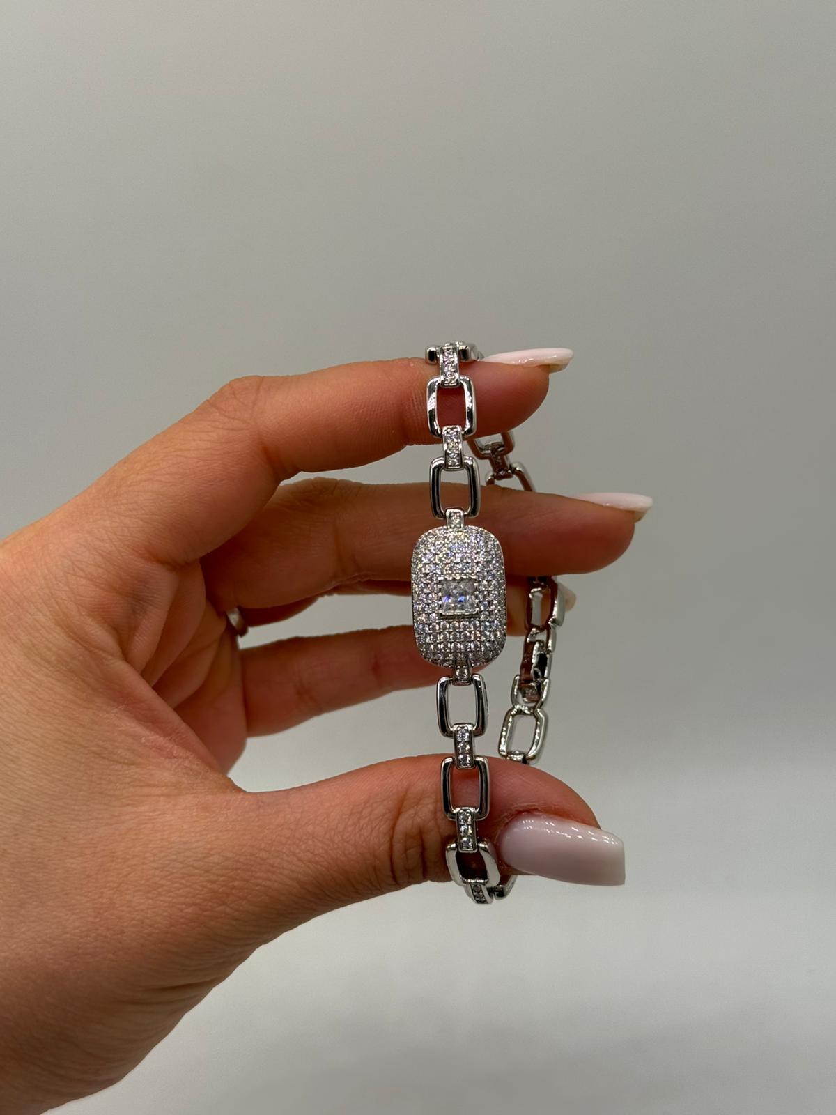 Zarif dikdörtgen merkez tasarımı ve yoğun zirkon taş işçiliğiyle hazırlanan bu VIP çelik bileklik, lüks ve modern görünümü bir arada sunar. Orta bölümde yer alan baget kesim zirkon taş detayı, bilek üzerinde güçlü ve dikkat çekici bir odak noktası oluşturur.