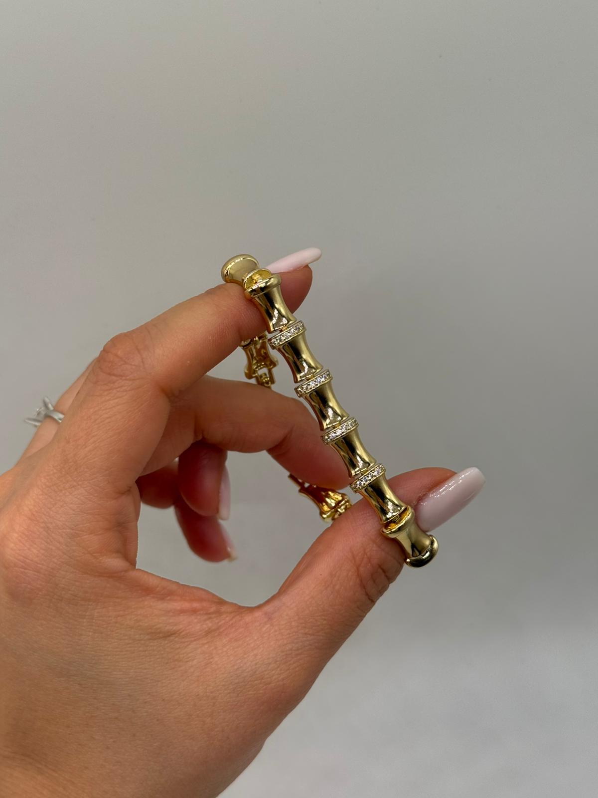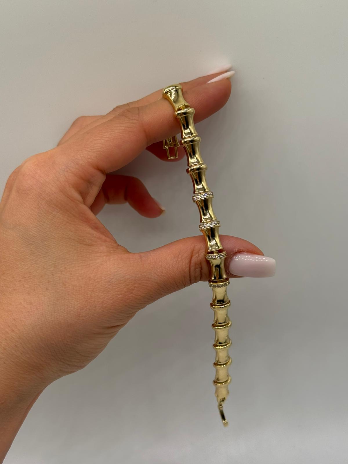 Doğadan ilham alan bambu formlu bu şık bileklik, zamansız tasarımı ve zarif taş detaylarıyla öne çıkar. Altın renk kaplaması, bilekliğe sofistike ve sıcak bir görünüm kazandırırken, bambu segmentleri arasındaki taşlı geçişler tasarımı hareketlendirir. Hem günlük kullanımda hem de özel kombinlerde rahatlıkla tercih edilebilecek güçlü ve şık bir aksesuardır.