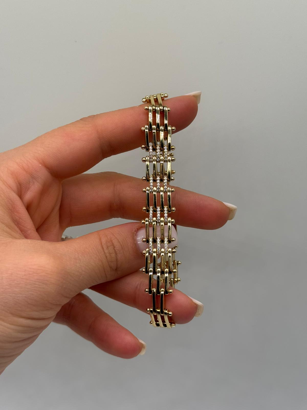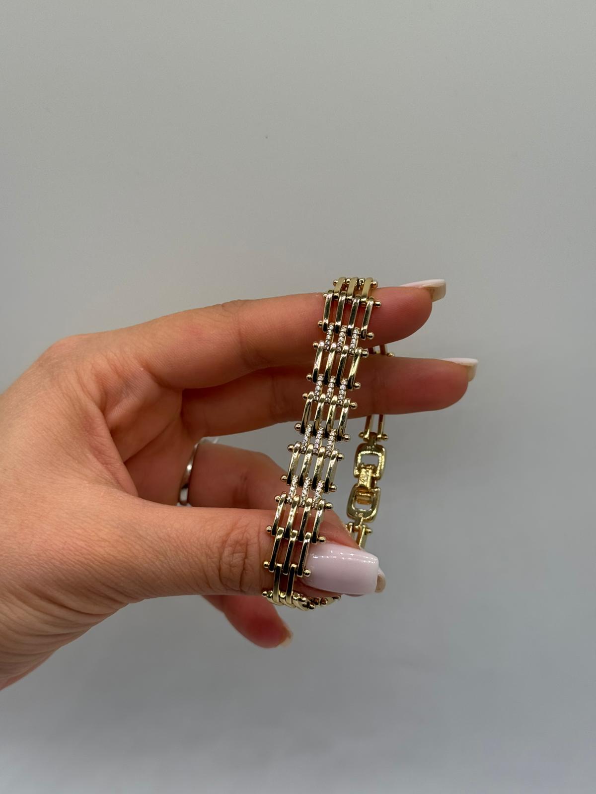 Modern ve mimari çizgilerden ilham alan bu çok sıralı bileklik, klasik zincir anlayışının dışına çıkan özgün bir tasarım sunar. İnce çubuk formlu bağlantılar ve düzenli metal geçişleri, bileklik boyunca güçlü ve dengeli bir görünüm oluşturur.