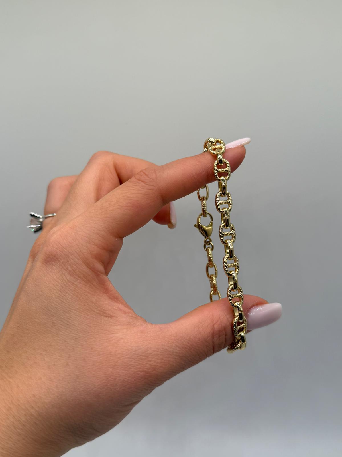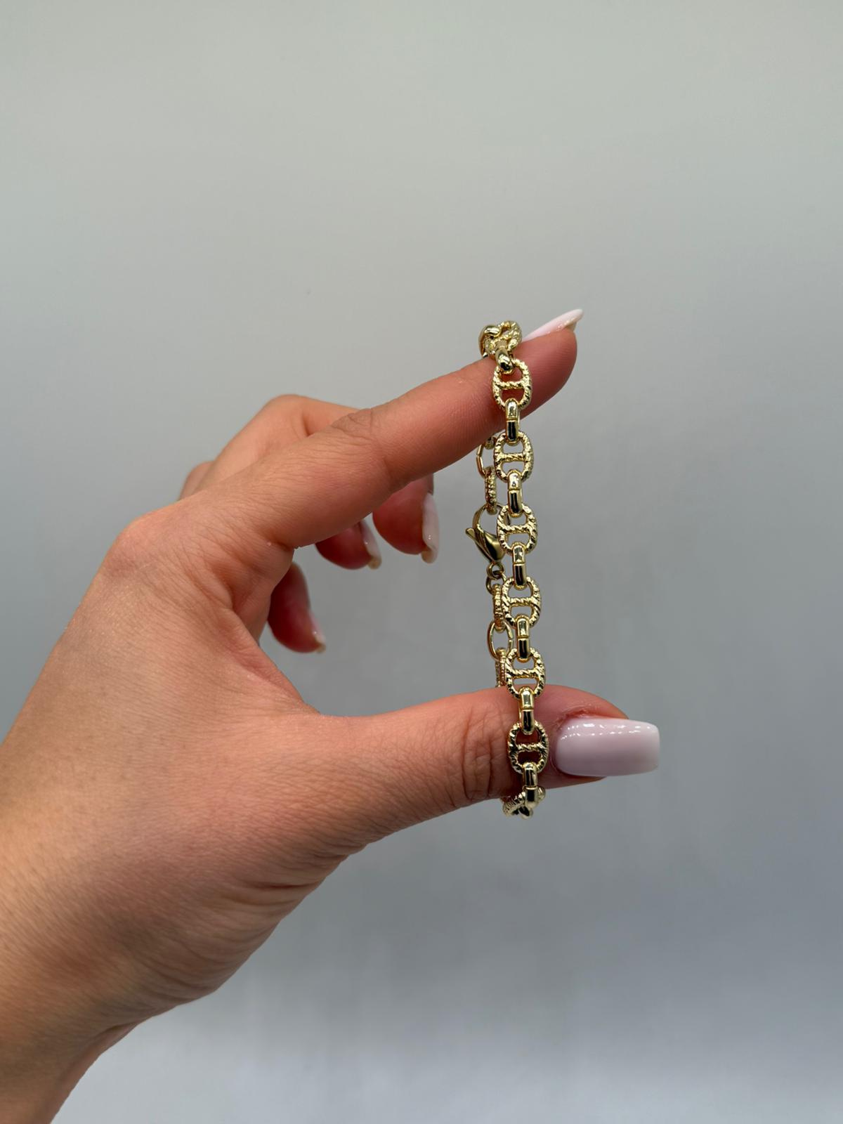 Dokulu Oval Halkalı Gold VIP Çelik Bileklik, klasik zincir formunu modern dokularla buluşturan zamansız bir tasarıma sahiptir. Oval halkaların yüzeyindeki ince işçilik, bilek üzerinde şık ve dengeli bir ışıltı oluşturur.